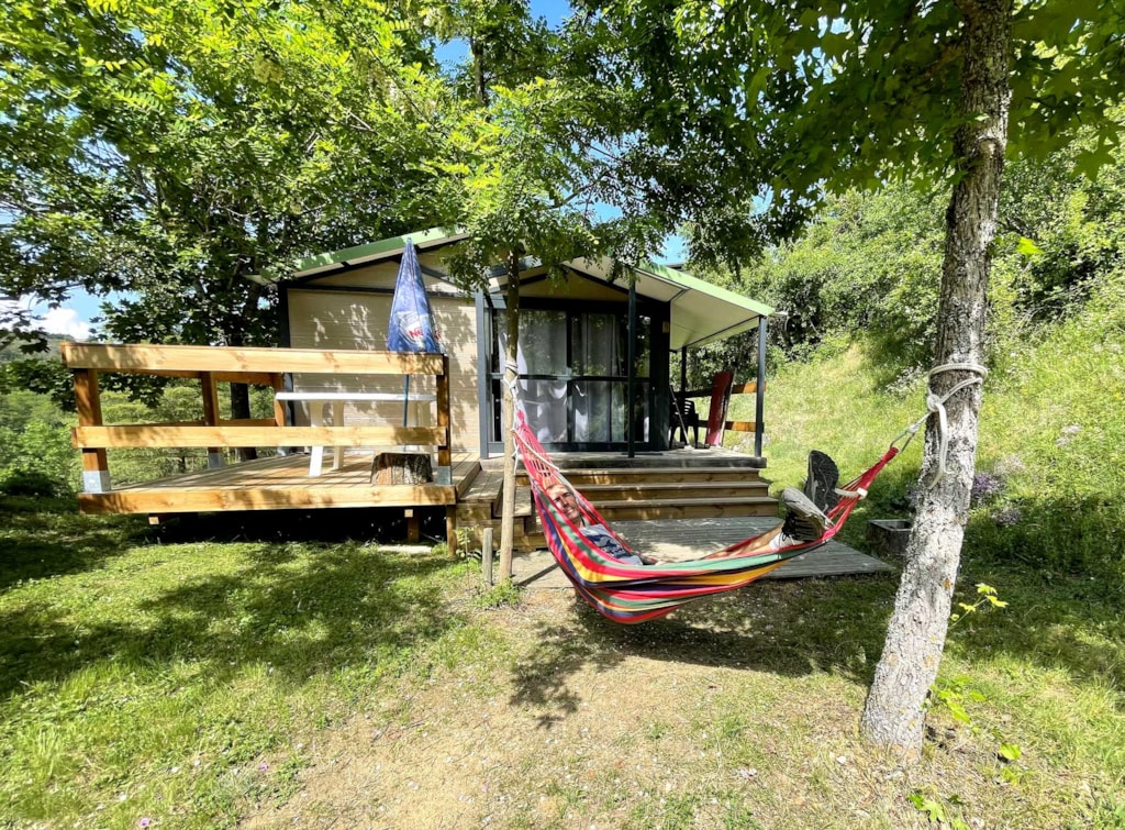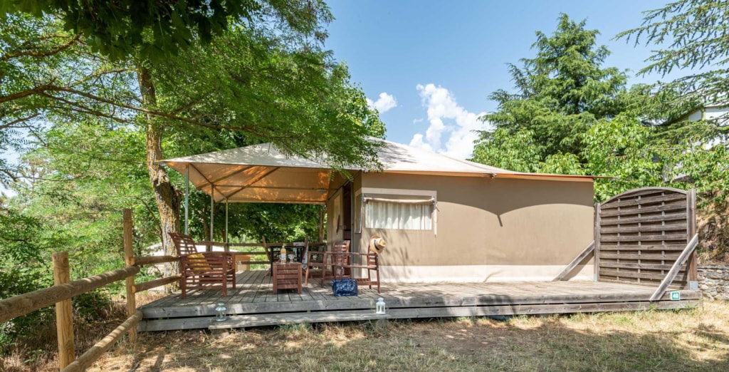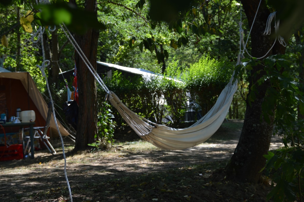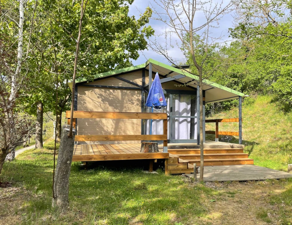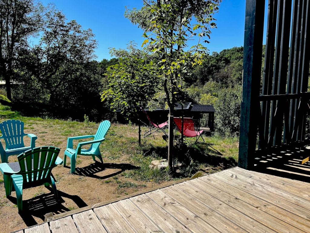 Lodge Insolite Vivarais ohne Sanitäranlagen 4 Plätze auf Holzboden mit einer überdachten Terrasse von 12 m2 + 1 Hängematte am Flussufer. 2 getrennte Schlafzimmer ( 1 Zimmer mit zwei Einzelbetten 80x200 und ein Doppelbett 140x200), voll ausgestattete Küche im Wohnzimmer (Kühlschrank, Mikrowelle, Geschirr, Gas-Kochplatten , Tisch und Stühle), entspannende Lounge auf der Terrasse. Ohne Bad, aber eine Wasserstelle auf dem Gelände. In der Nähe des Sanitärblocks. Diese Lodge ist für Familien geeignet, da sie in der Nähe der Aktivitäten des Campingplatzes und des Pools liegt. Der Fluss bringt im Sommer Frische und die umliegenden Bäume. N° 2 und 9