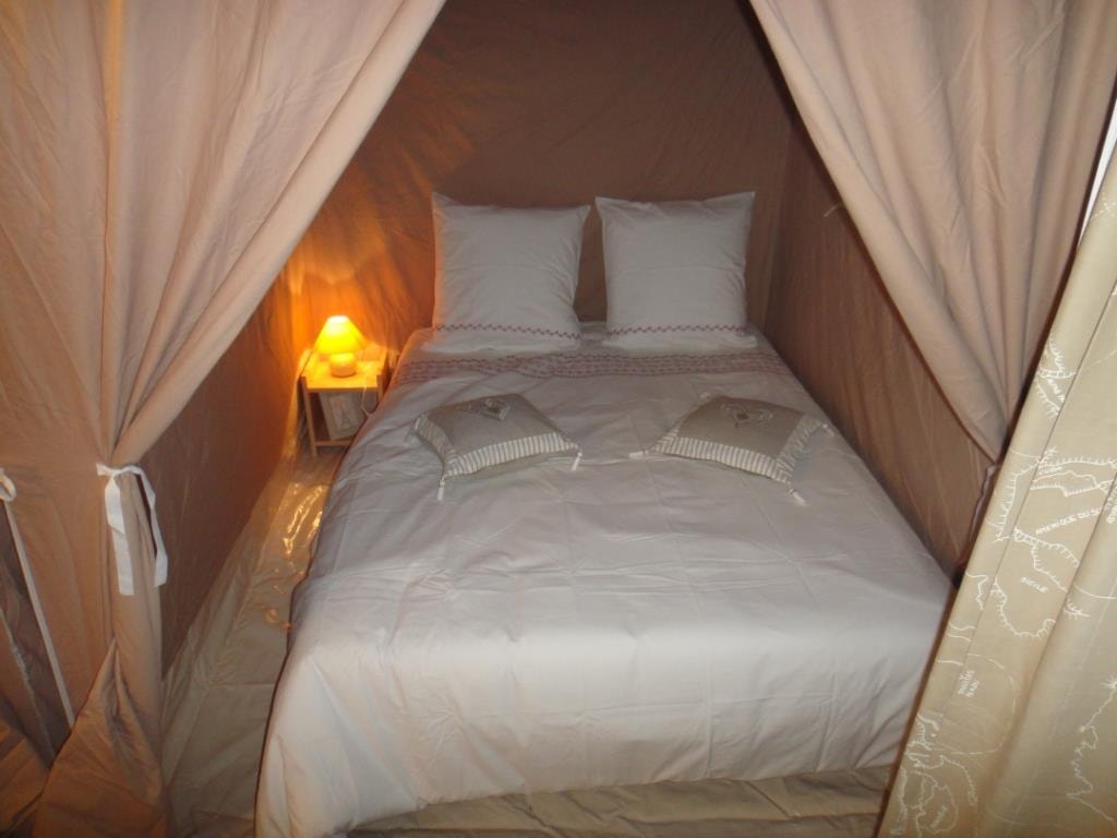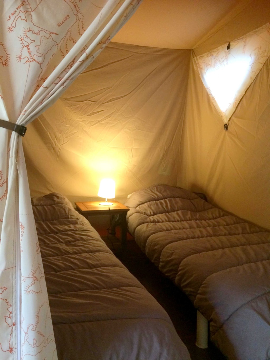 Ungewöhnliche Lodge Kanada ohne Sanitäranlagen. 4 Plätze auf Holzboden mit einer überdachten Terrasse von 10 m2 + 1 Hängematte bietet eine ruhige Lage. 2 Schlafzimmer ( 1 Doppelbett 140x200 und zwei Einzelbetten 80x200), voll ausgestattete Küche im Wohnzimmer (Kühlschrank, Kaffeemaschine, Mikrowelle, Geschirr, Gasherd, Tisch und Stühle). Ohne Bad, eine Wasserstelle auf dem Stellplatz. In der Nähe des Sanitärblocks. Diese Lodge befindet sich oben auf dem Campingplatz, abseits vom Schwimmbad. Es liegt in einer ruhigen Gegend. N° 52 und 58