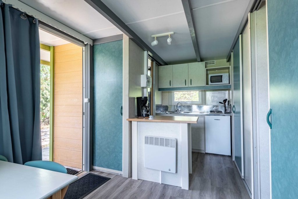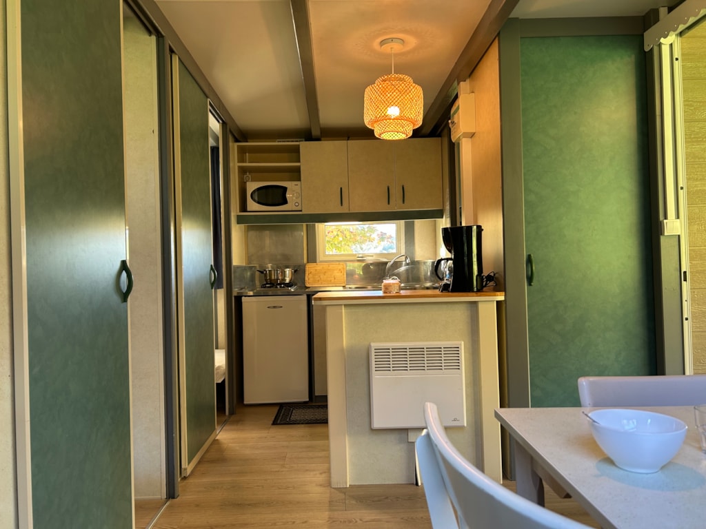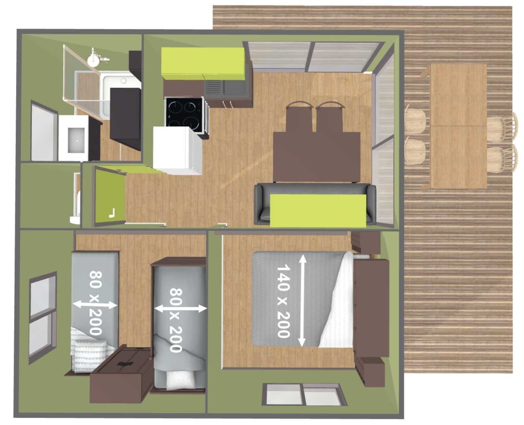 Chalet Titom 4-Sitzer mit Wohnraum innen/außen mit zwei großen Erkerfenstern, die sich vollständig öffnen, unbedeckte Terrasse. 2 separate Schlafzimmer - 2 Einzelbetten (80 x 200) und ein Doppelbett (140 x 200), voll ausgestattete Küche (Spüle, Kühlschrank, Mikrowelle, Geschirr, Herd), Sanitär (Dusche + WC), Tisch und Stühle im Wohnzimmer sowie eine Gartensitzgruppe. 2 chilenische Lafuma und eine Hängematte. Dieses Chalet ist perfekt für einen einfachen Urlaub. Die Chalets Titom befinden sich in der Nähe des Pools. N° 27 à 30