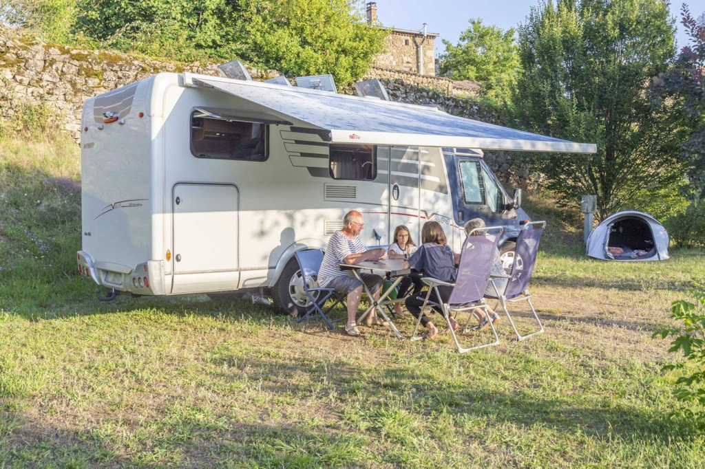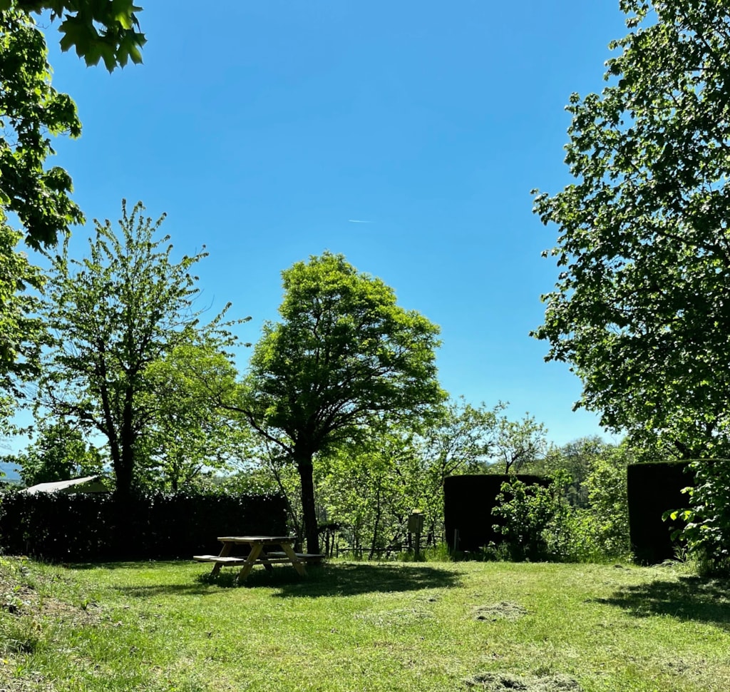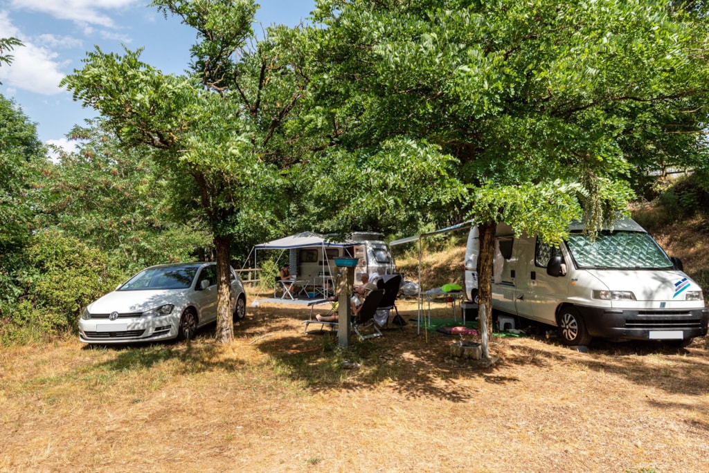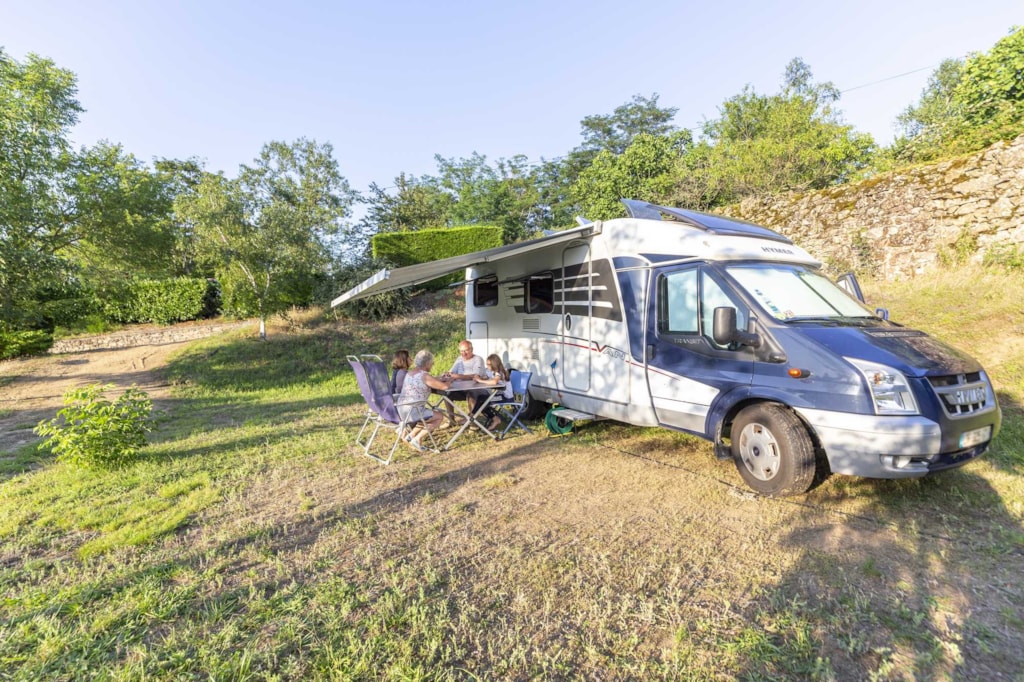 Auf den Höhen des Campingplatzes, Sonne und Schatten mit Blick auf das Tal und den Sonnenuntergang, in der Nähe von Sanitäranlagen und einem Spielplatz. Zugänglich für Campingplätze, da weniger als 6,5 m.