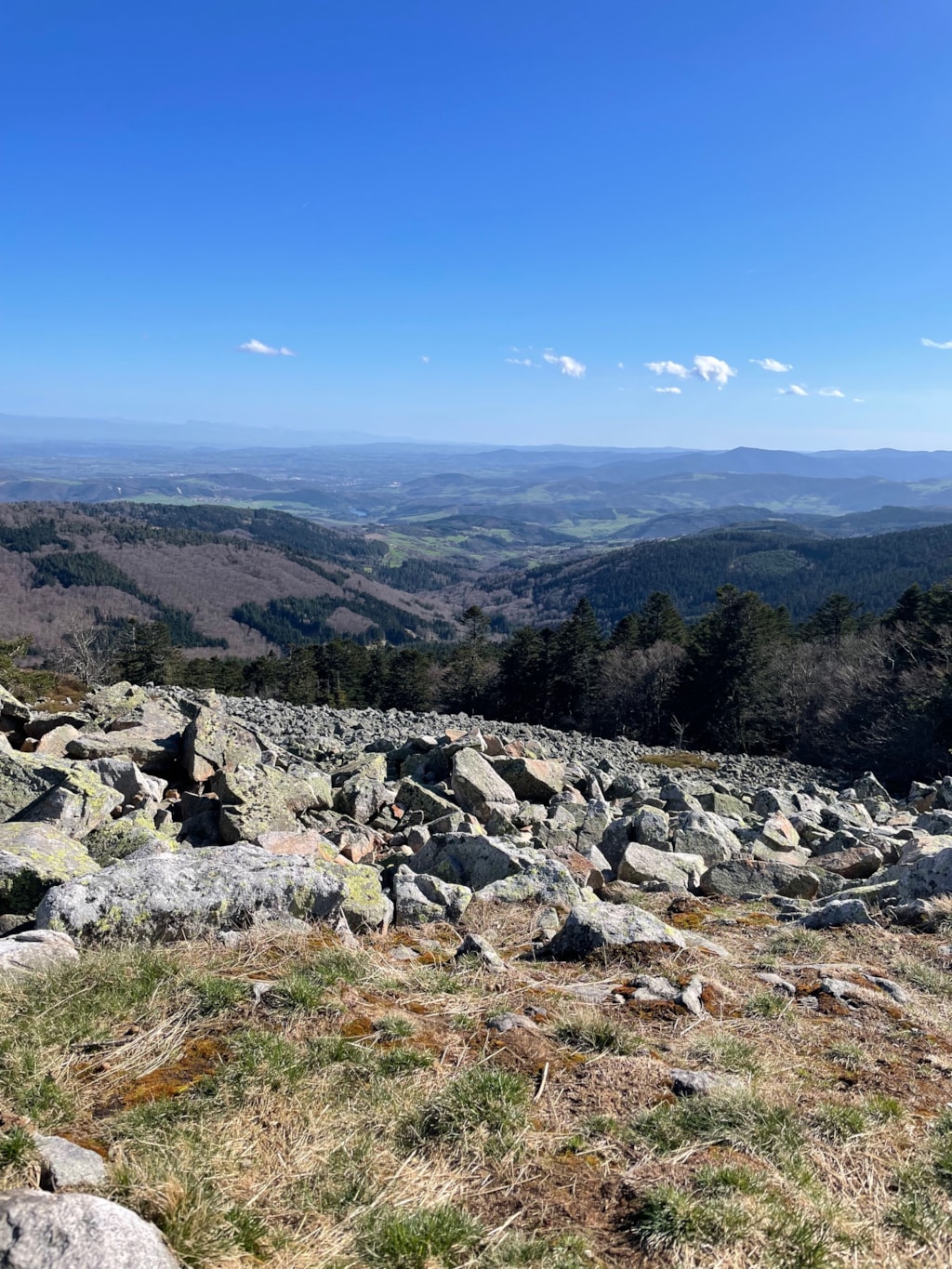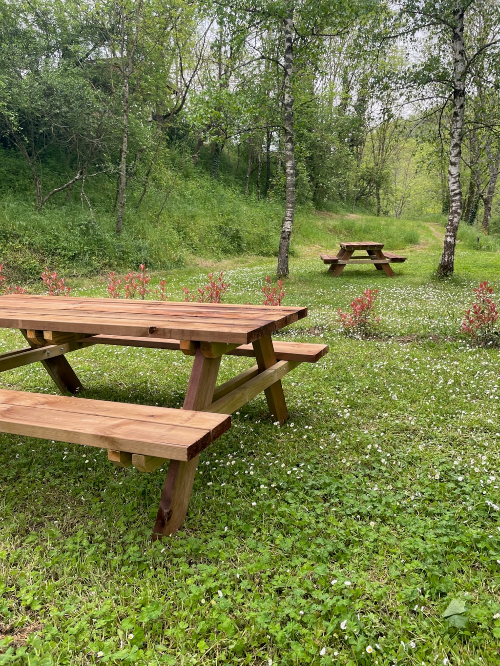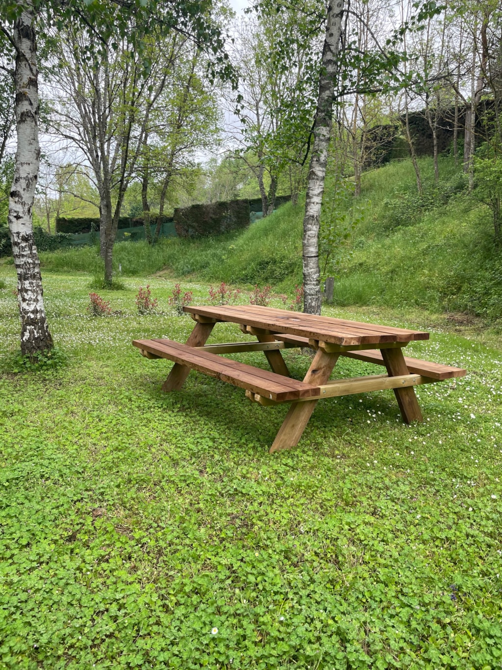 XXL-Stellplatz mit hölzernem Picknicktisch oben auf dem Campingplatz. Schatten und Sonne mit Blick ins Tal, auf die Höhen des Campingplatzes und den Sonnenuntergang, in der Nähe von Sanitäranlagen und einem Spielplatz (auf halber Höhe des Hügels). Barrierefrei Zelt, Van und Wohnmobil bis 7m. Stellplatz Nr. 51 , 53 und 57