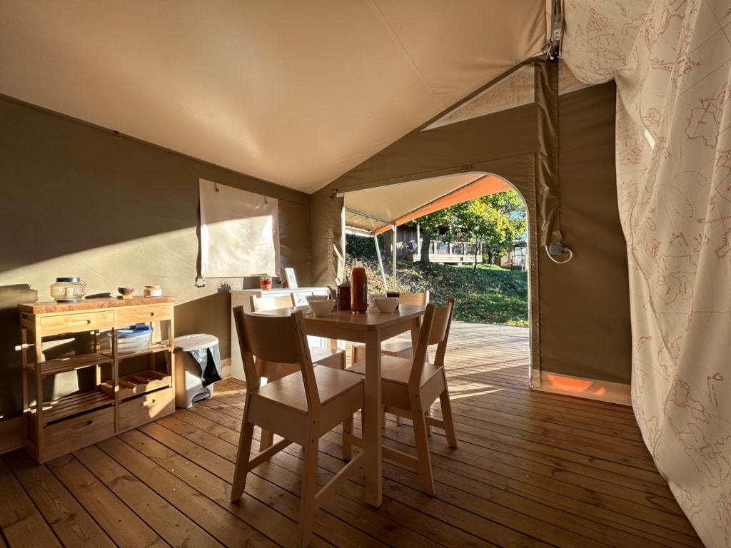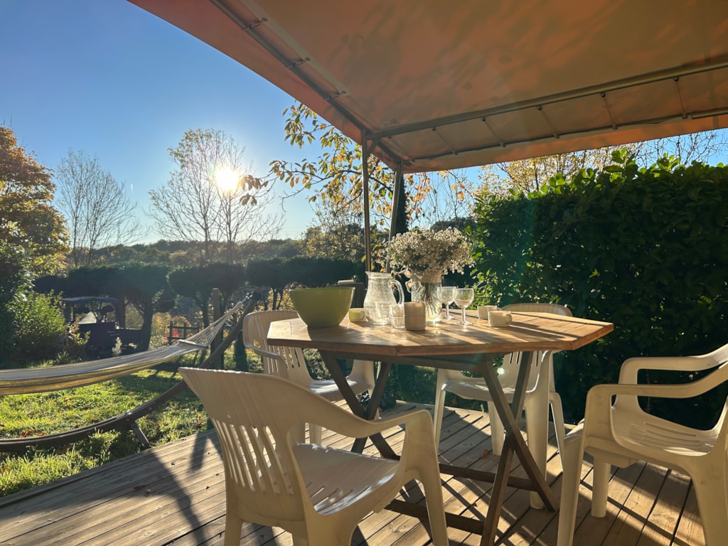 Ungewöhnliche Lodge von 6 Plätzen auf Holzboden mit einer überdachten Terrasse von 15m2 und einem nicht überdachten Teil von 10m2. 2 separate Schlafzimmer mit 4 Betten (80 x 190) im Kinderzimmer, voll ausgestattete offene Küche (Spüle, Kühlschrank, Mikrowelle, Geschirr, Nespresso, Gasherd ), Tisch und Stühle im Wohnzimmer. Bad und WC im selben Raum. Aufenthaltsraum, 2 chilenische Lafuma und Hängematte auf der Terrasse. Herrliche Aussicht auf das Tal von Ay. Kinder lieben diese Art von Unterkunft wegen des Komforts und der Originalität. N° 33 - 34 - 35 - 36