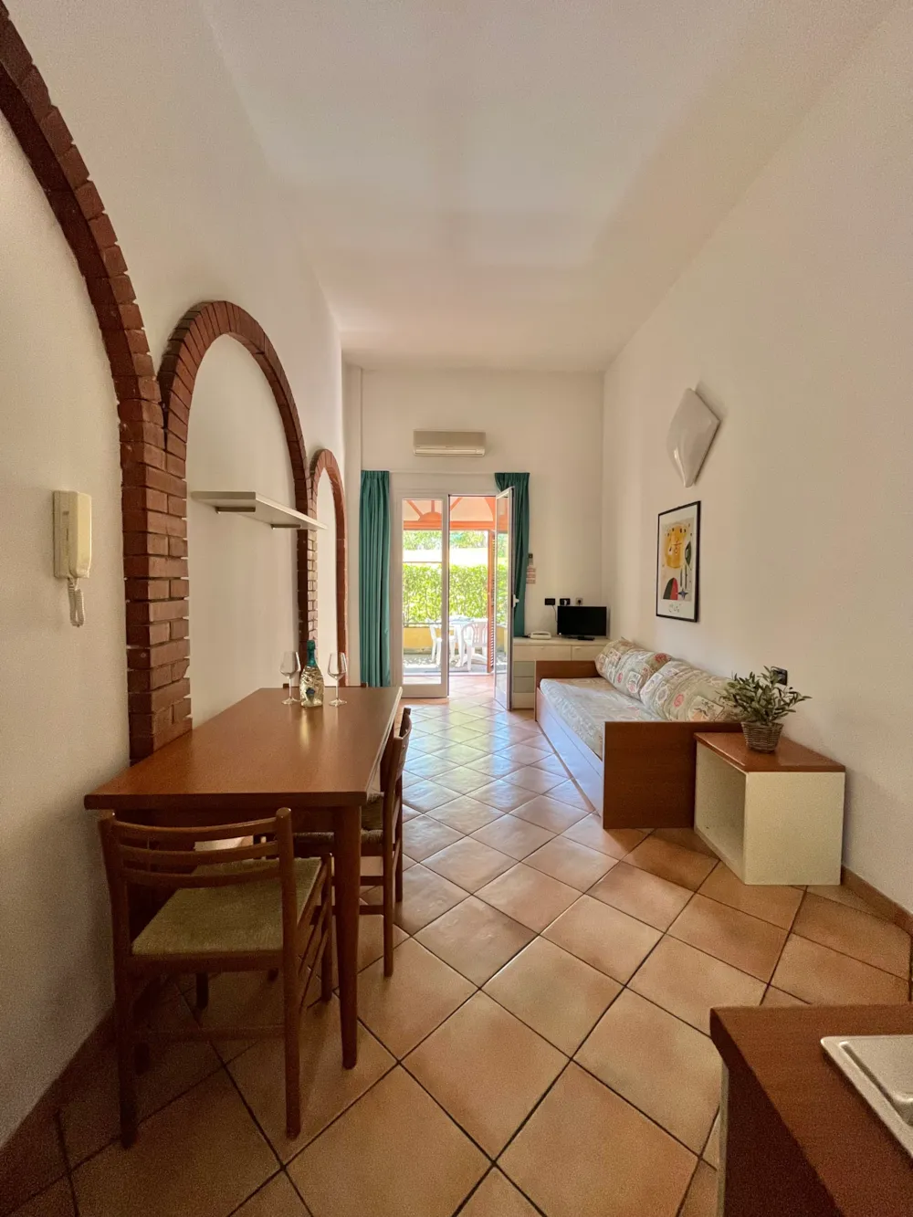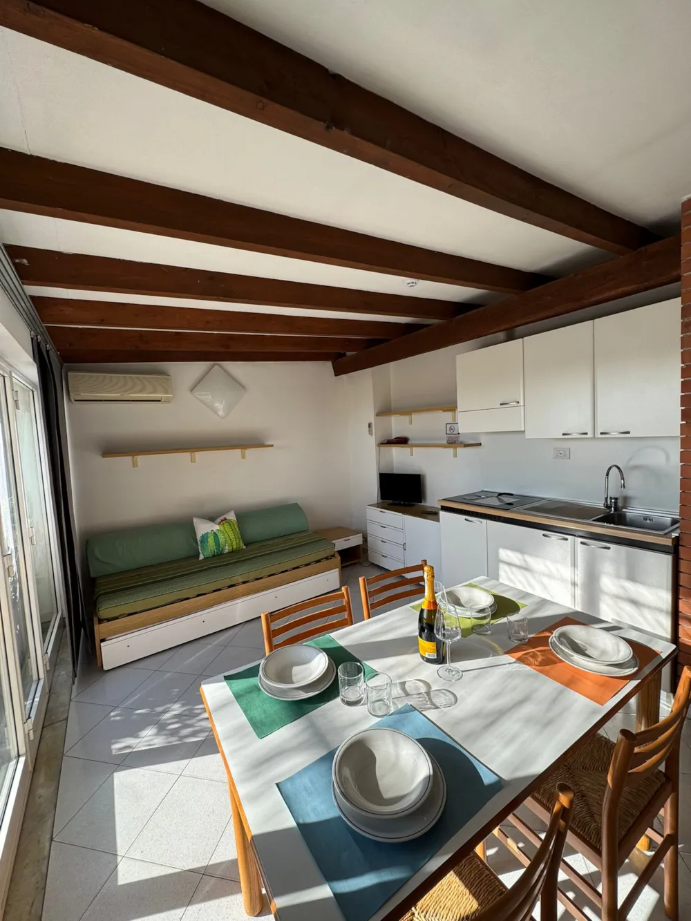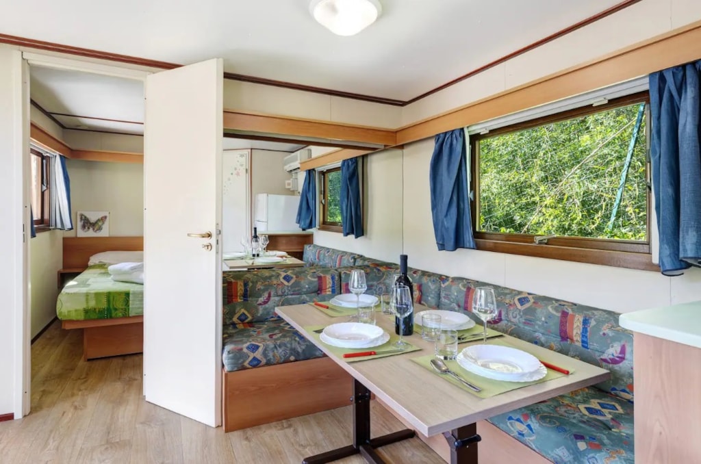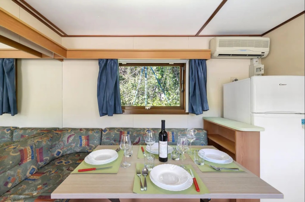 MOBILHOME FUER MAX 4 PERSONEN : bestehend aus zwei Schlafzimmer (Doppelbett bezw. zwei Einzelbetten), Wohnraum mit komplett eingerichteter Kochecke, Badezimmer mit Dusche, Klimaanlage, TV, Foen, Terrasse mit Tischrund Stühlen. Bettwaesche, Handtuecher , Tischdecke und Servietten, Geschirrtuech sind im Preis inbegriffen Moeglichkeit Babybett (kleine Bettwaesche zum mitnehmen) und Hochstuhl zu reservieren (kostenlos) direkt bei der Reservierung. . Kissen und Bettdecken stehen zur Verfuegung. Tiere nicht akzeptiert. Das Rauchen innen ist nicht gestattet.