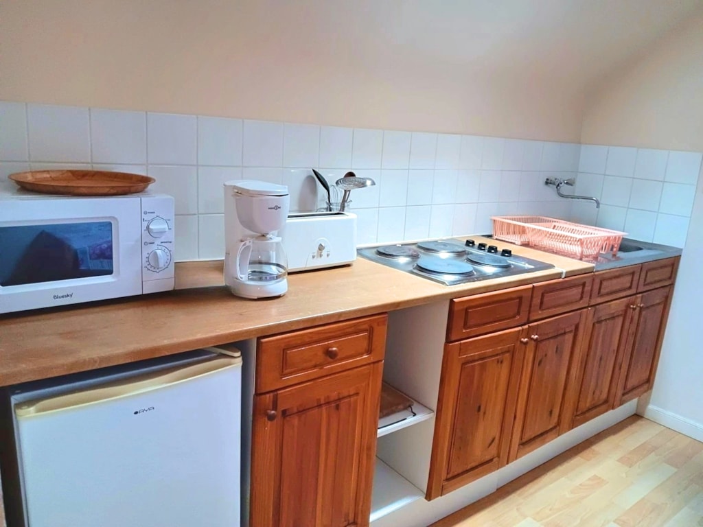 kitchen contains a fridge, 2 cooking plates, toaster , coffee machine , microwave, cutlery , pots+pans. Garden furniture with sun umbrella.