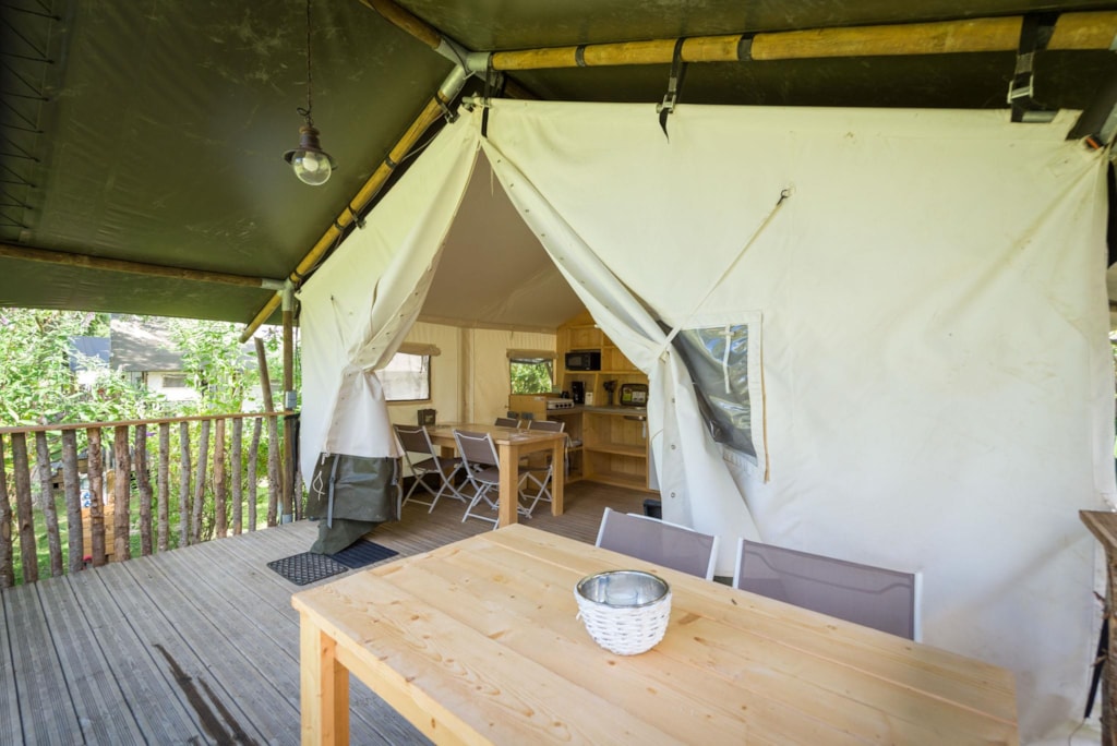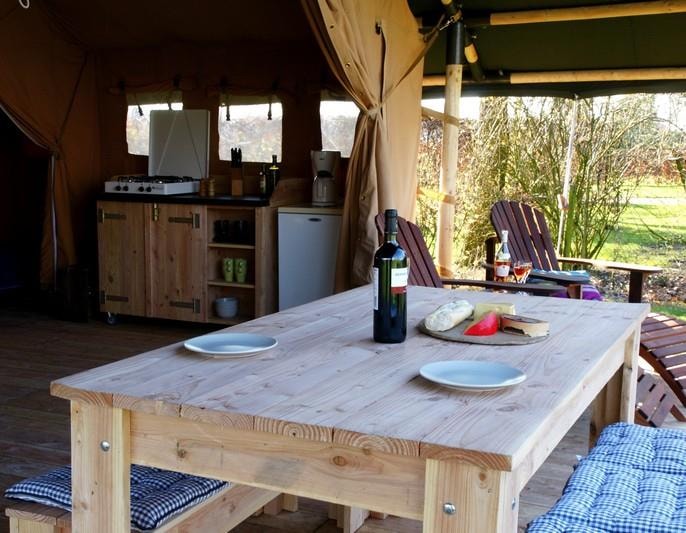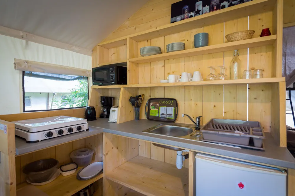 Der einfache Komfort eines großen Zeltes, das für eine ganze Familie aufgebaut wurde, und das zu einem sehr günstigen Preis. Hauptraum Kleiner Kühlschrank, Mikrowelle, Kaffeemaschine, Wasserkocher, 2 Gaskochstellen, Schränke, komplettes Kücheninventar, Tisch, Stühle. Schlafzimmer 1: 1 Bett 140 x 190 cm, Matratzen und Lattenroste (Decken, Kopfkissen und Matratzenschoner). Schlafzimmer 2: 2 Betten 80 x 190 cm Matratzen und Lattenroste auf Füßen (Decken, Kopfkissen und Matratzenschoner). Gartenmöbel und Sonnenschirm. Unsere Eco Lodge-Zelte sind weder mit Toiletten noch mit Duschen ausgestattet (kein Wasseranschluss). Die Sanitäranlagen werden von den Mietern genutzt.