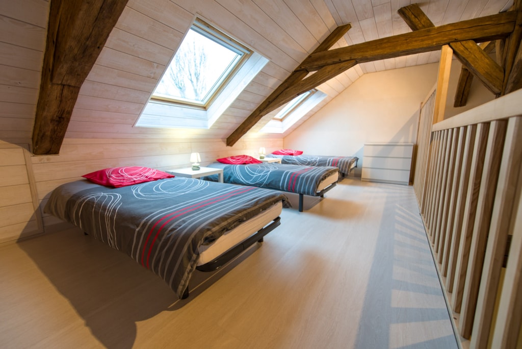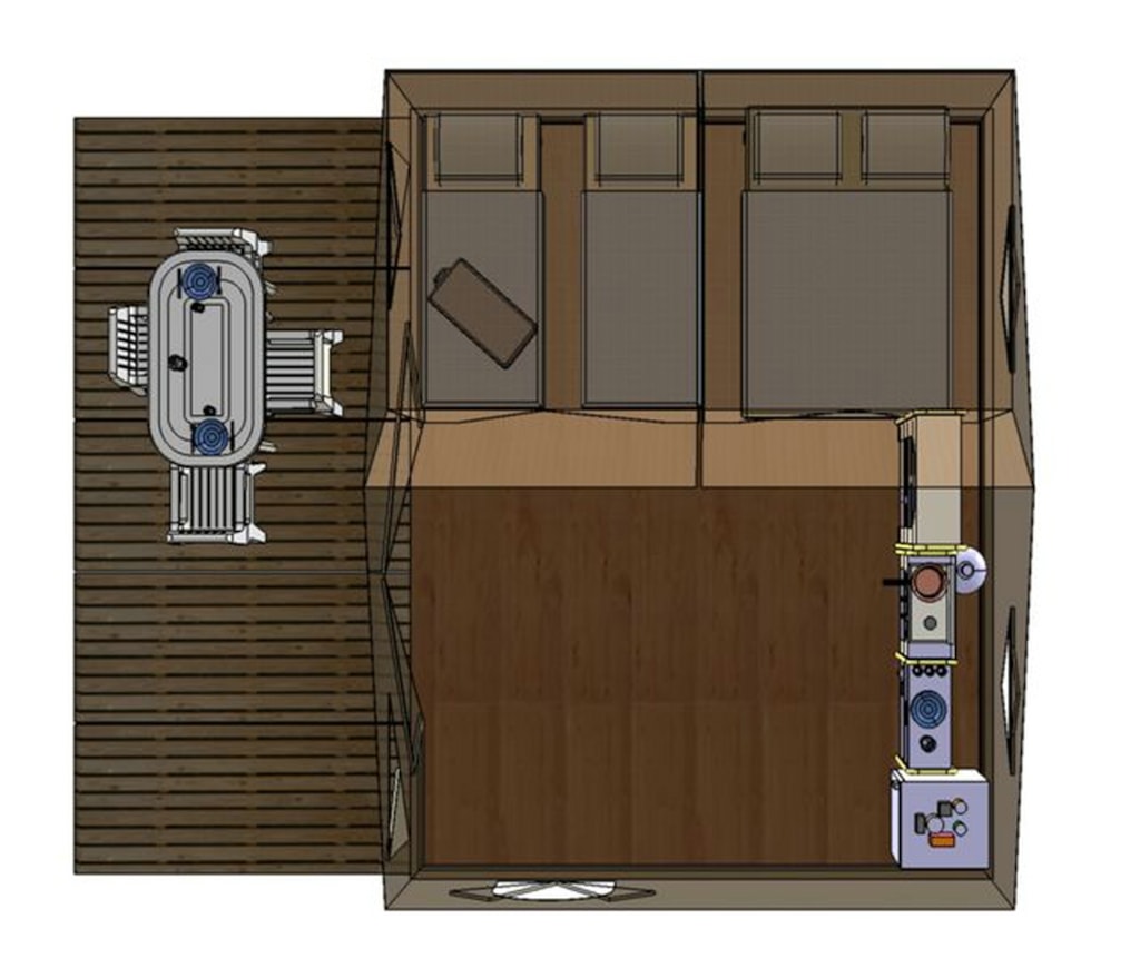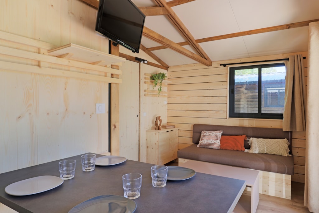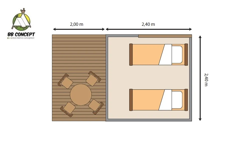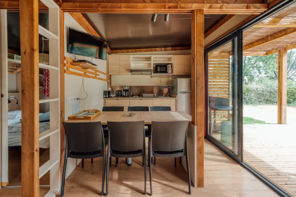 With its 30 m² of interior space, the Chalet Maine combines comfort and conviviality. It can comfortably accommodate 5 to 6 people, including two couples, thanks to its bedrooms, cleverly placed at the ends of the chalet, ensuring privacy and tranquillity for everyone.