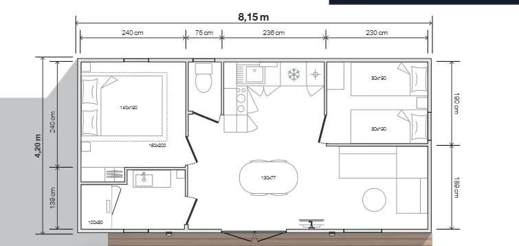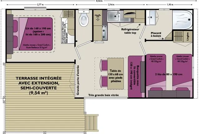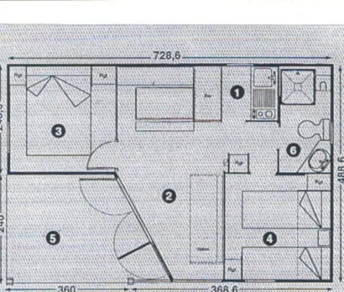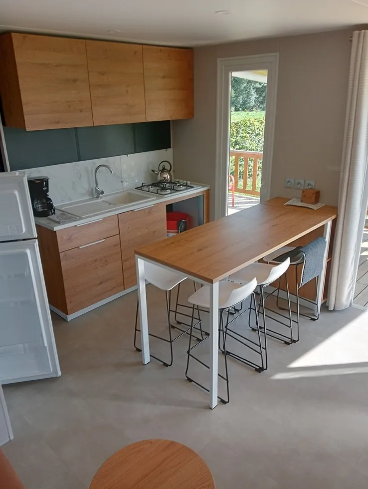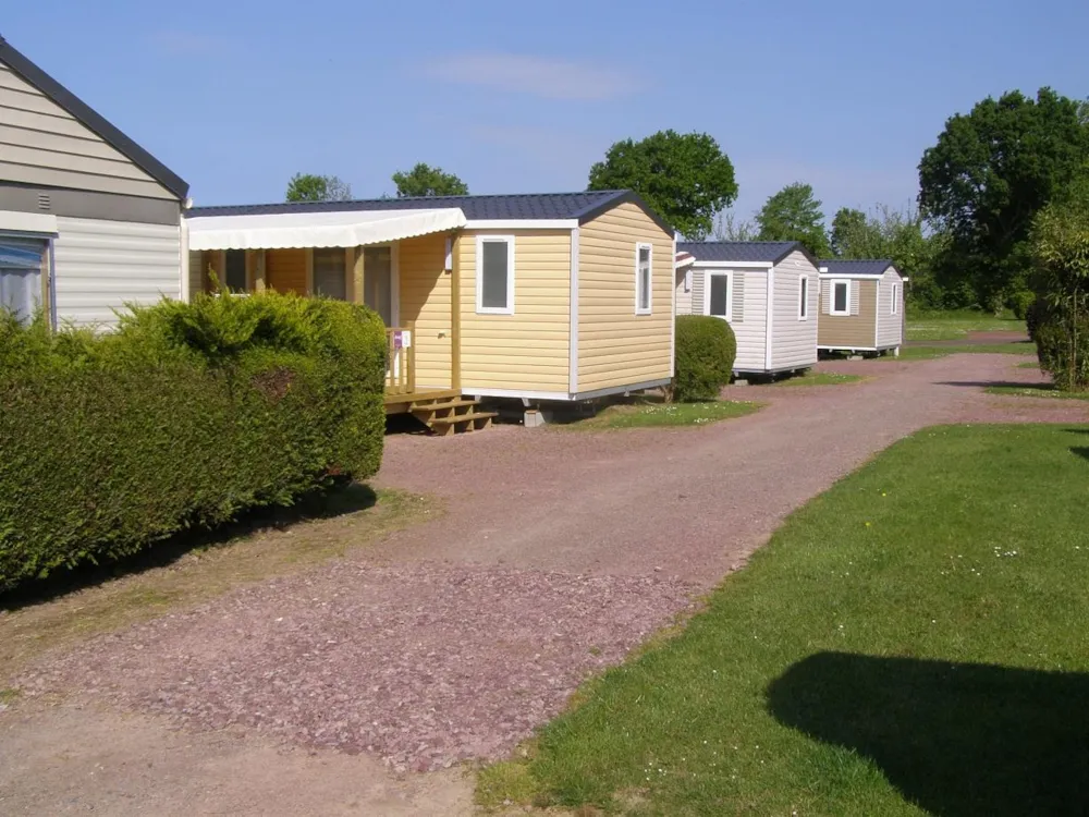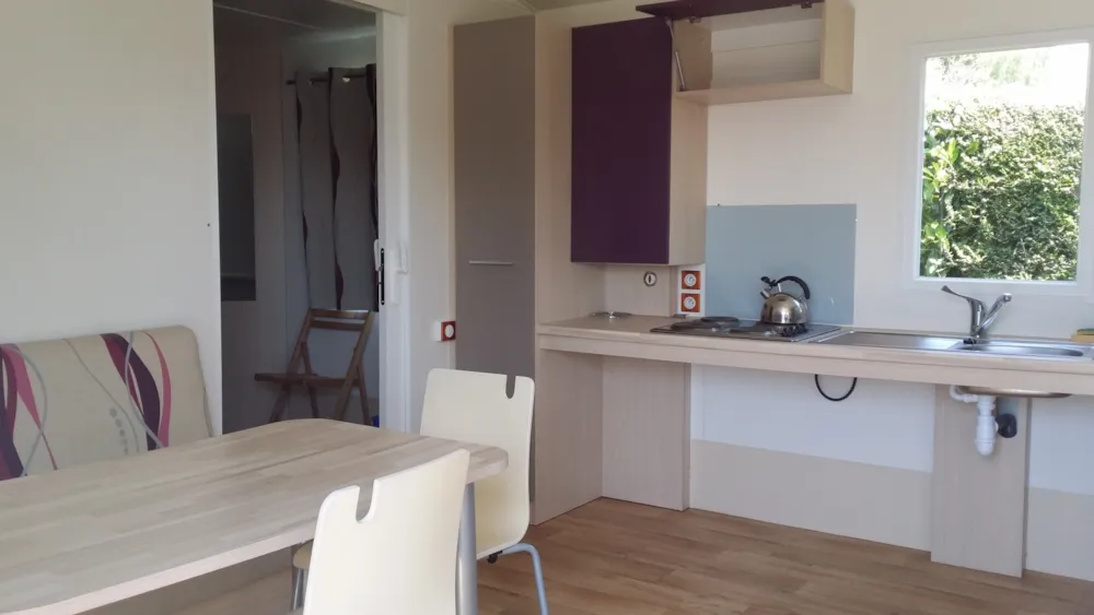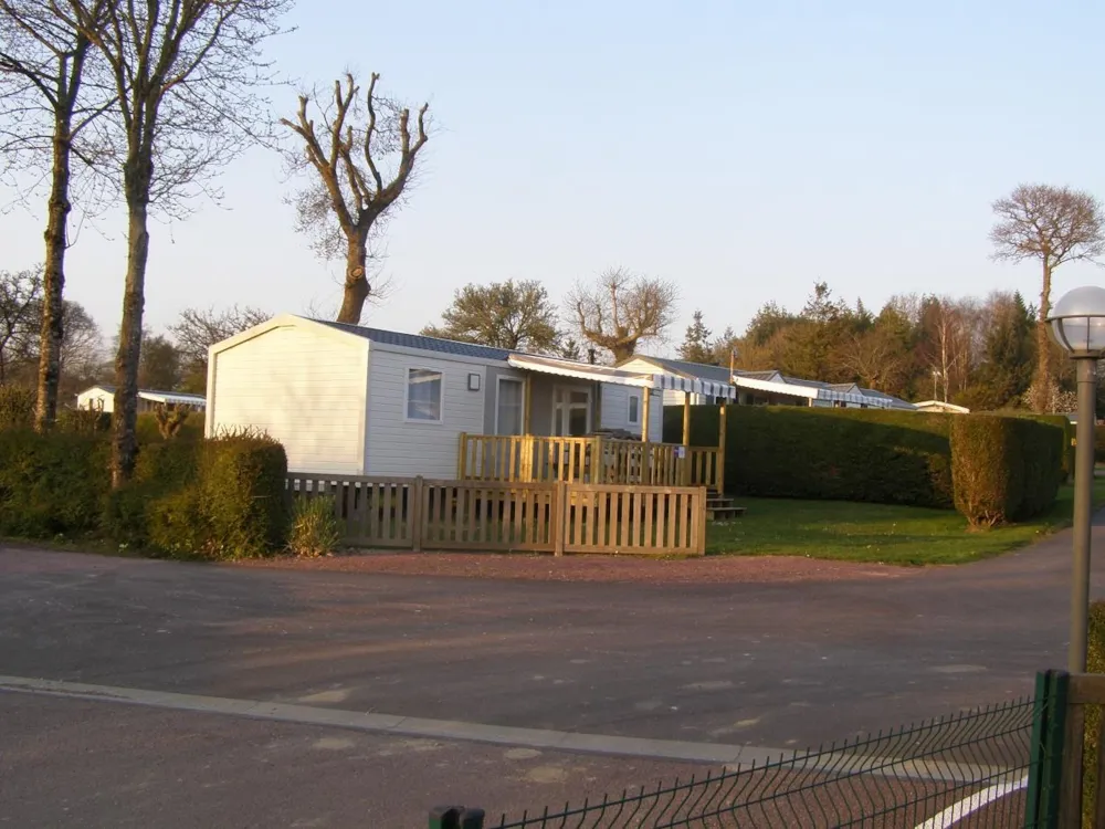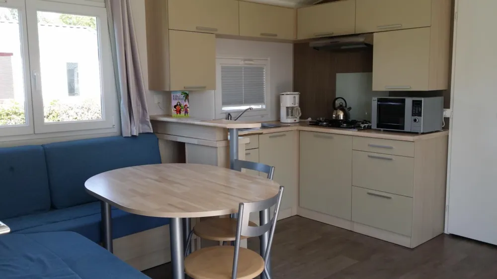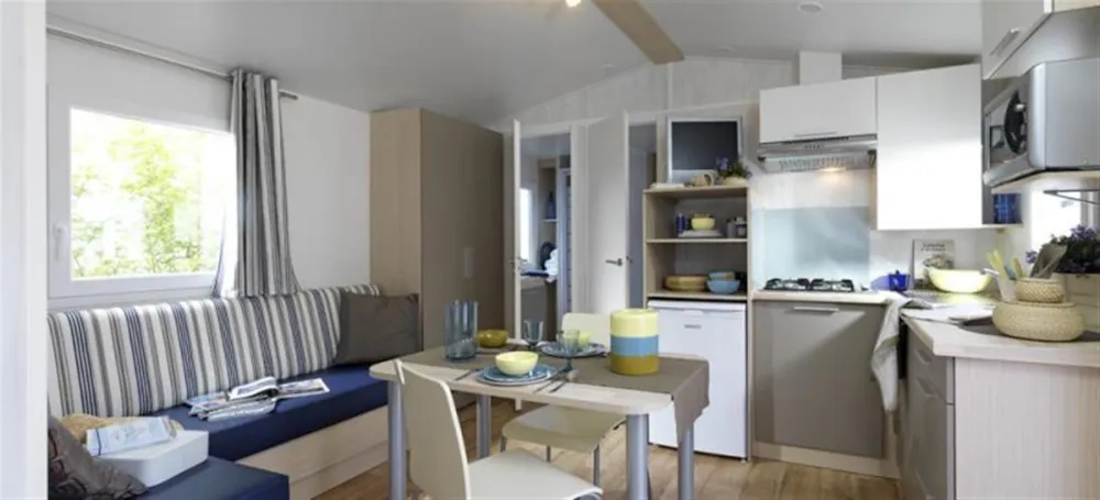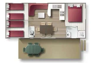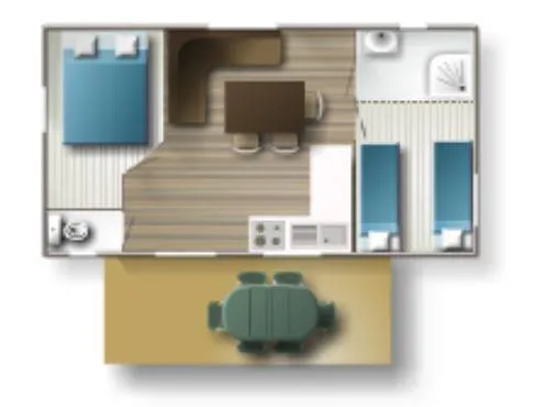 Neu!! Entdecken Sie dieses neue Mobilheim 3 zimmer von 35m², komfortabel und ideal für einen Familienurlaub. Es verfügt über 3 Schlafzimmer mit 1 Doppelbett und 4 Einzelbetten (davon 1 als Etagenbett), mit Schlafmöglichkeit inklusive (Bettwäsche, Duvets und Kissen mit Kissenbezügen). Fernseher im Wohn-Küchenbereich. Überdachte Terrasse mit Grill.