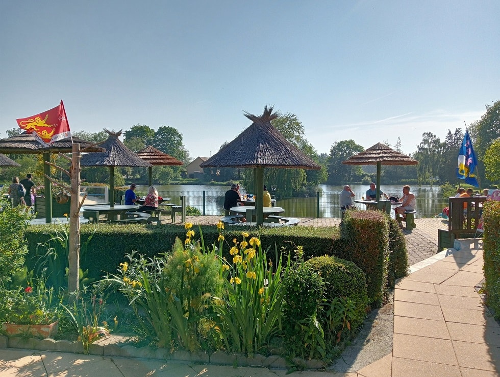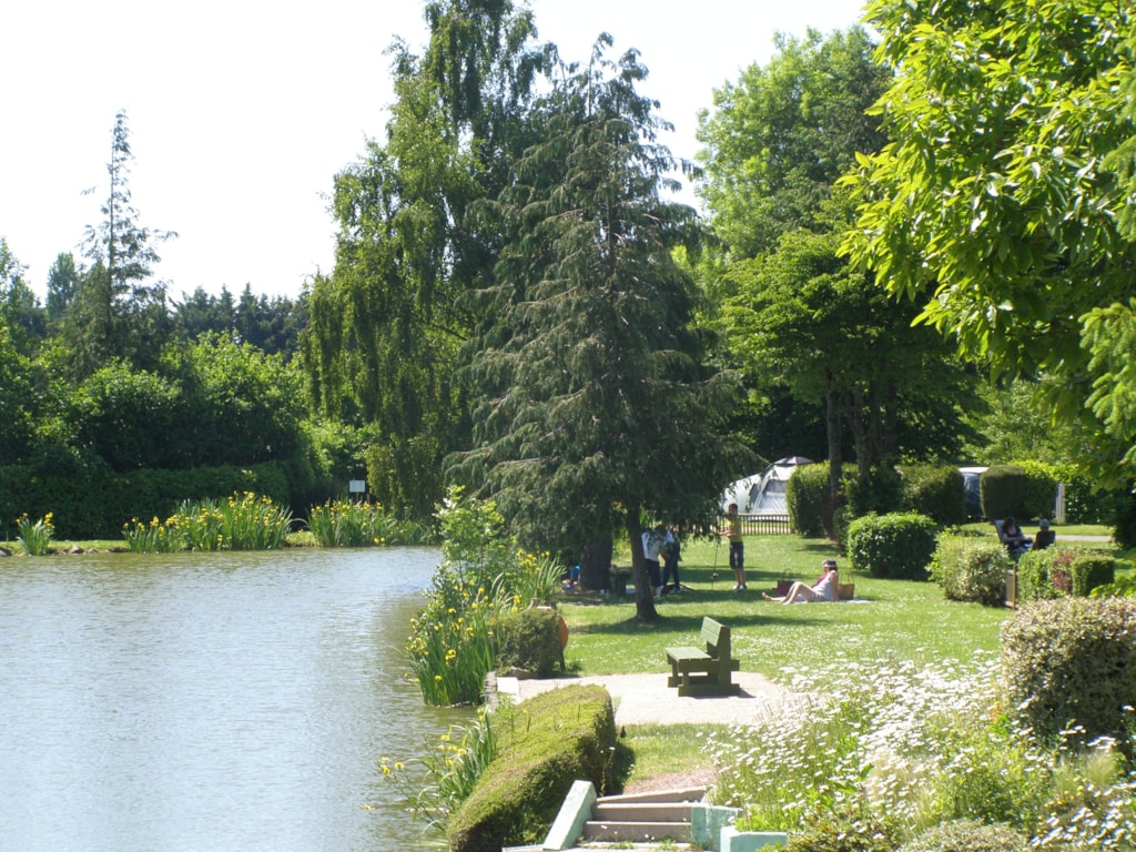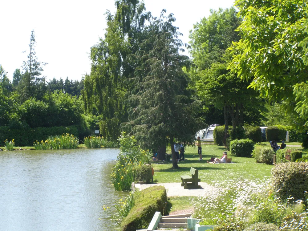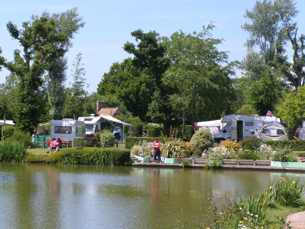 Ihr Stellplatz am Teich, geräumig und grasbewachsen von 90m², je nach Verfügbarkeit. Stellplatz für Zelt oder Wohnwagen mit einem Stromanschluss mit europäischer Steckdose in 10m oder 20m Entfernung von einem Sanitärblock.