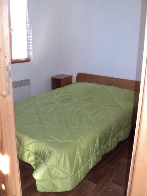 Wooden chalet 5 persons, with covered terrace 12m2, without toilet, no bathroom, 1 bedroom with large bed, 1 bedroom with 3 single beds, fridge, microwaves oven, coffee machine, tableware and equipment for 5 persons, bed sheets not provided, pillows and blanket are provided, toilet block not far from to the chalet, water point near the chalet