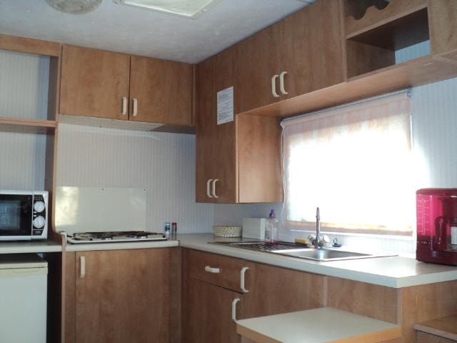 Mobile-home 21 to 26m2, 4 persons, with covered terrace 12m2, bathroom with toilet, 1 bedroom with large bed, 1 bedroom with 2 single beds, kitchen corner with microwaves oven, coffee machine, tableware and equipment for the number of persons, bed sheets not provided, pillows and blanket are provided,