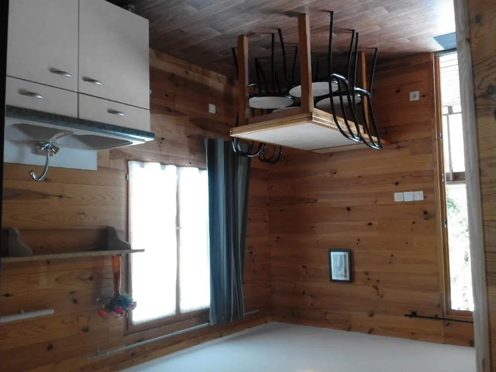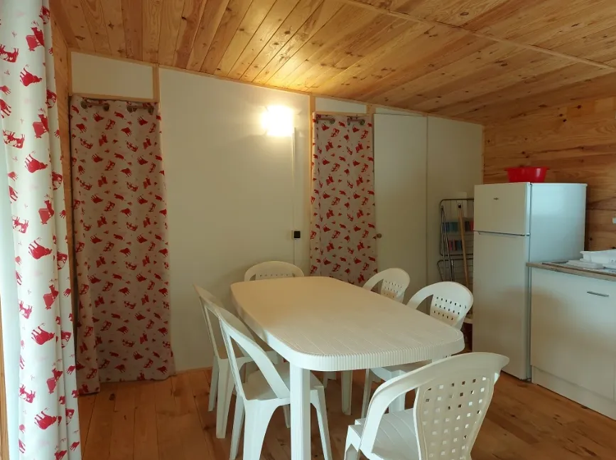 Du Dimanche au dimanche, chalet bois 31 m2 jusqu'à 6 personnes, 1 chambre avec lit double, 1 chambre avec 2 X 2 lits superposés, pièce à vivre avec coin cuisine, salle d'eau, WC séparé ; + terrasse couverte 12 m2.