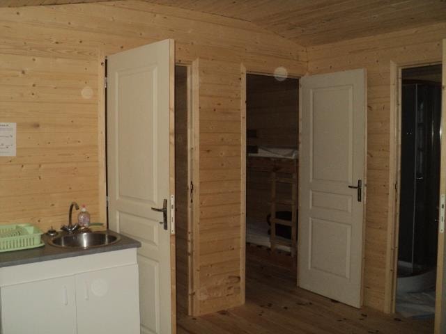 Wooden chalet 7 persons 35m2, with covered terrace 12m2, showeroom with shower and sink, separated toilet, bedroom n° 1 with large bed, bedroom n° 2 with 1 large bunk bed + 1 single bed, + 2 single beds, fridge, kitchen corner, microwaves oven, coffee machine, tableware and equipment for 6 persons, bed sheets not provided, pillows and blanket are provided,