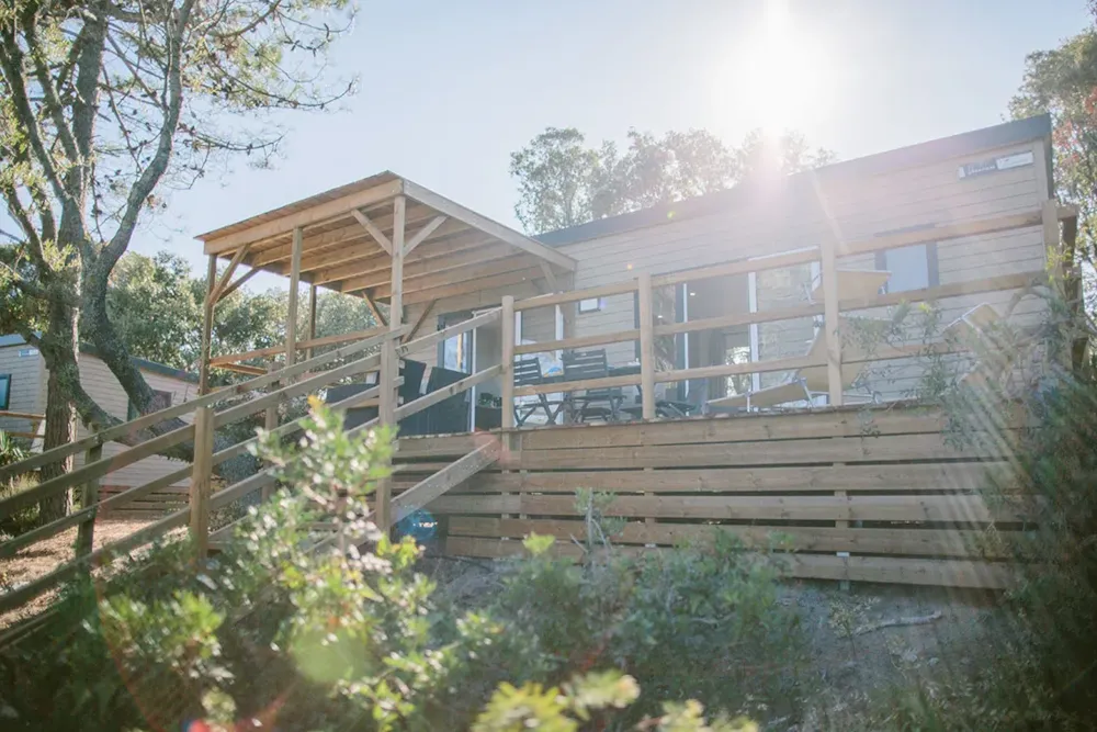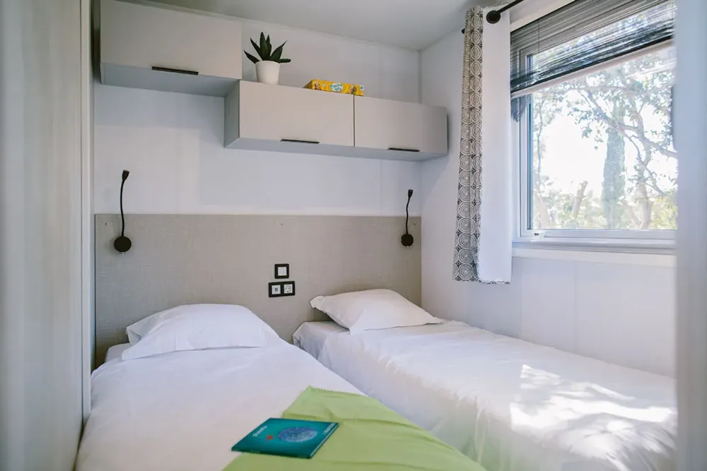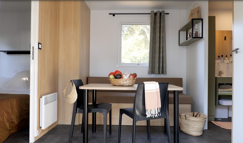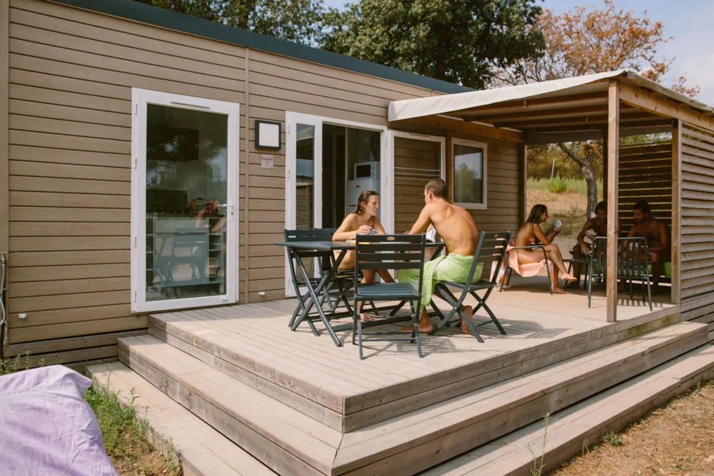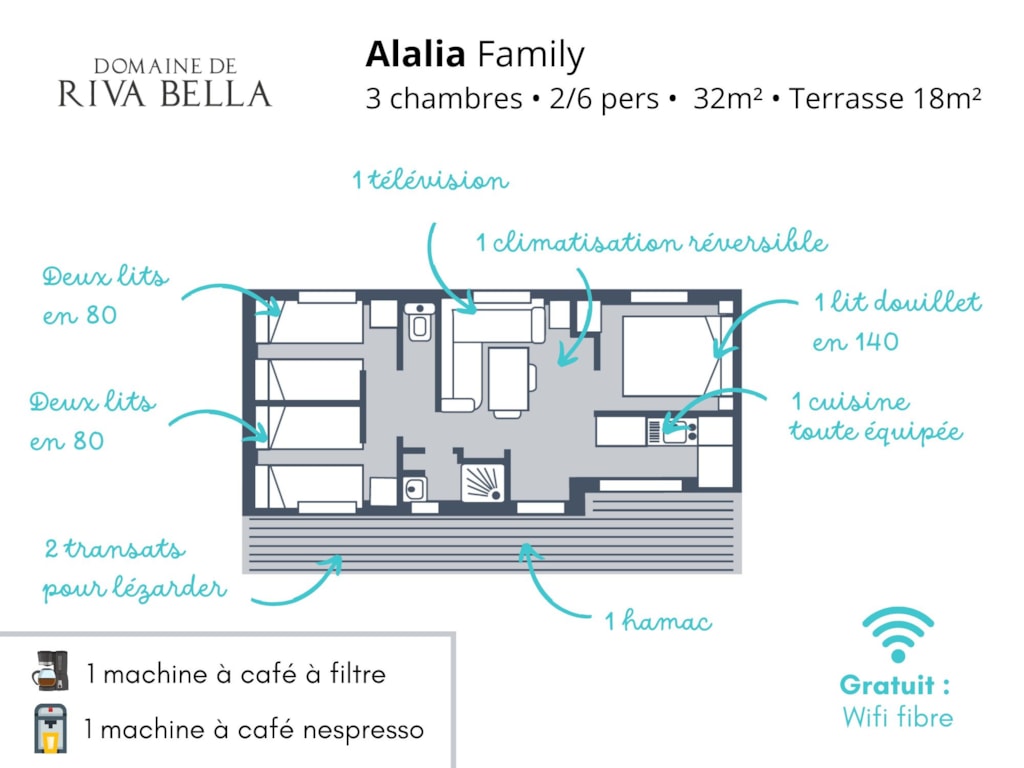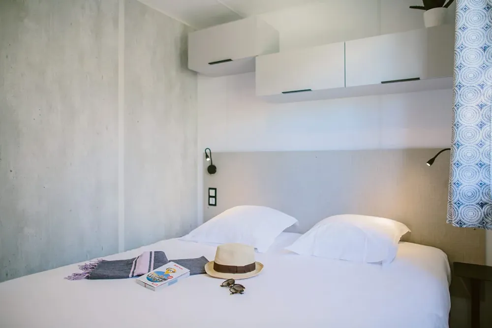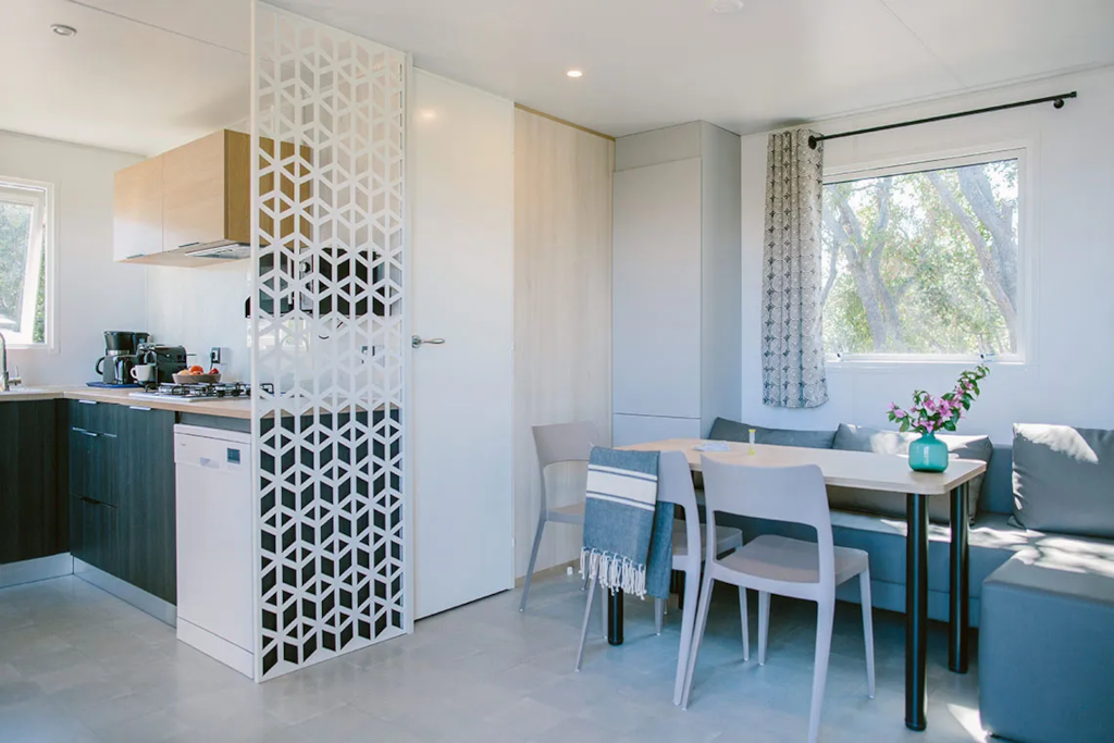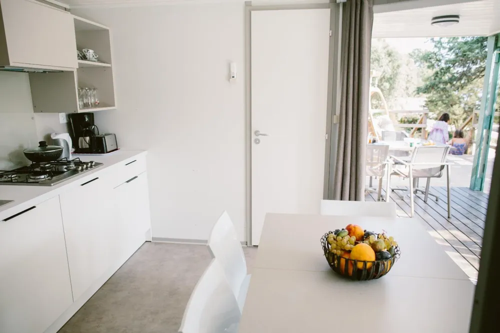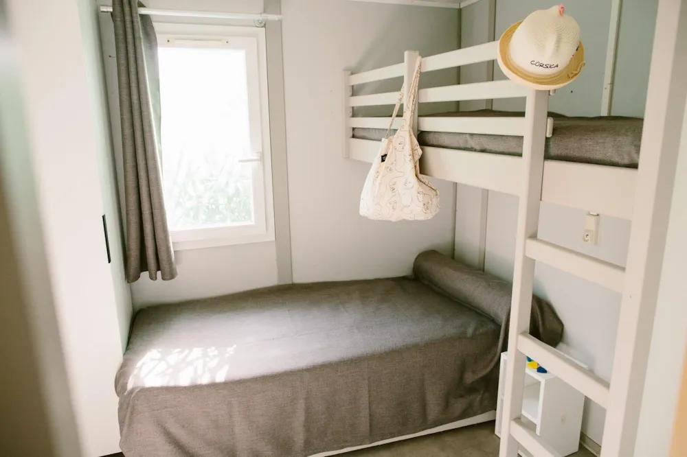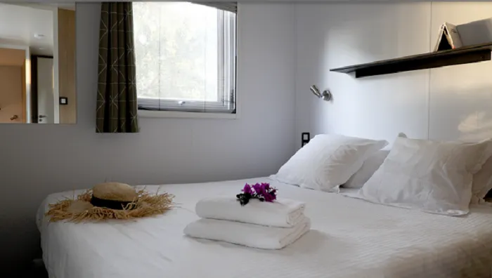 Dieses klimatisierte Mobilheim mit einer Fläche von 32 m² verfügt über eine 18 m² große Terrasse, von der ein Teil überdacht ist. Es ist ideal für bis zu sechs Personen, mit einem Elternschlafzimmer, das mit einem 140 cm Bett ausgestattet ist, und zwei Schlafzimmern, die jeweils mit zwei 80 cm Betten ausgestattet sind.