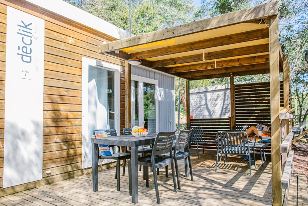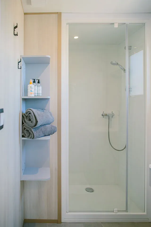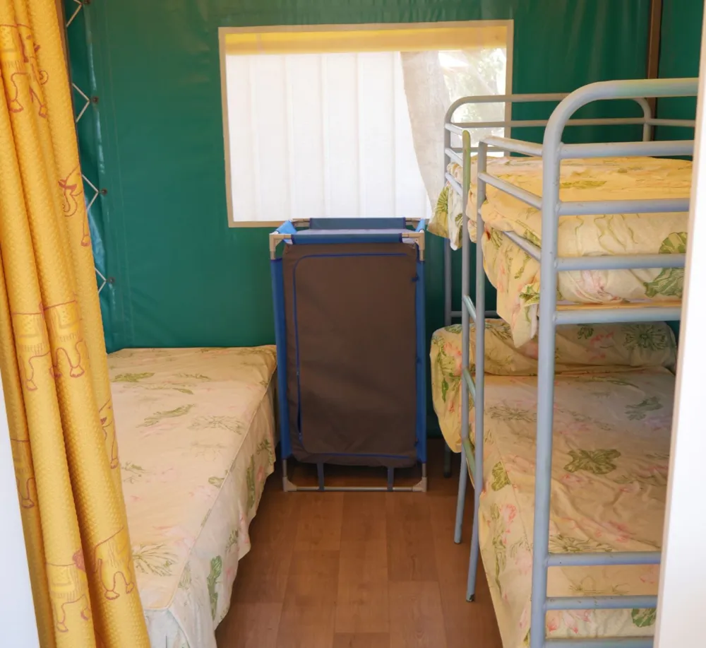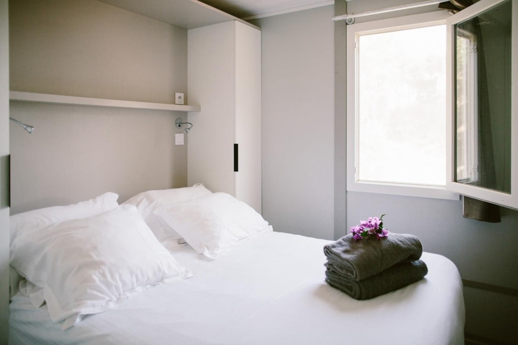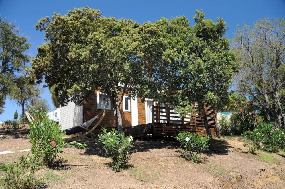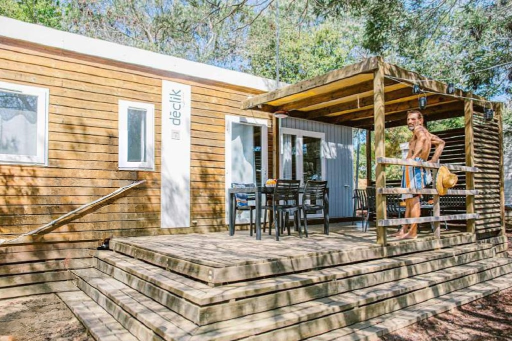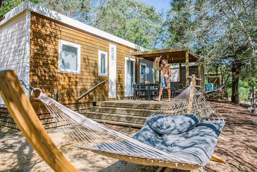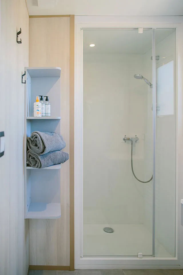 Dieses klimatisierte Mobilheim mit einer Fläche von 32 m² verfügt über eine 18 m² große Terrasse, von der ein Teil überdacht ist. Es ist ideal für bis zu sechs Personen, mit einem Elternschlafzimmer, das mit einem 140 cm Bett ausgestattet ist, und zwei Schlafzimmern, die jeweils mit zwei 80 cm Betten ausgestattet sind.
