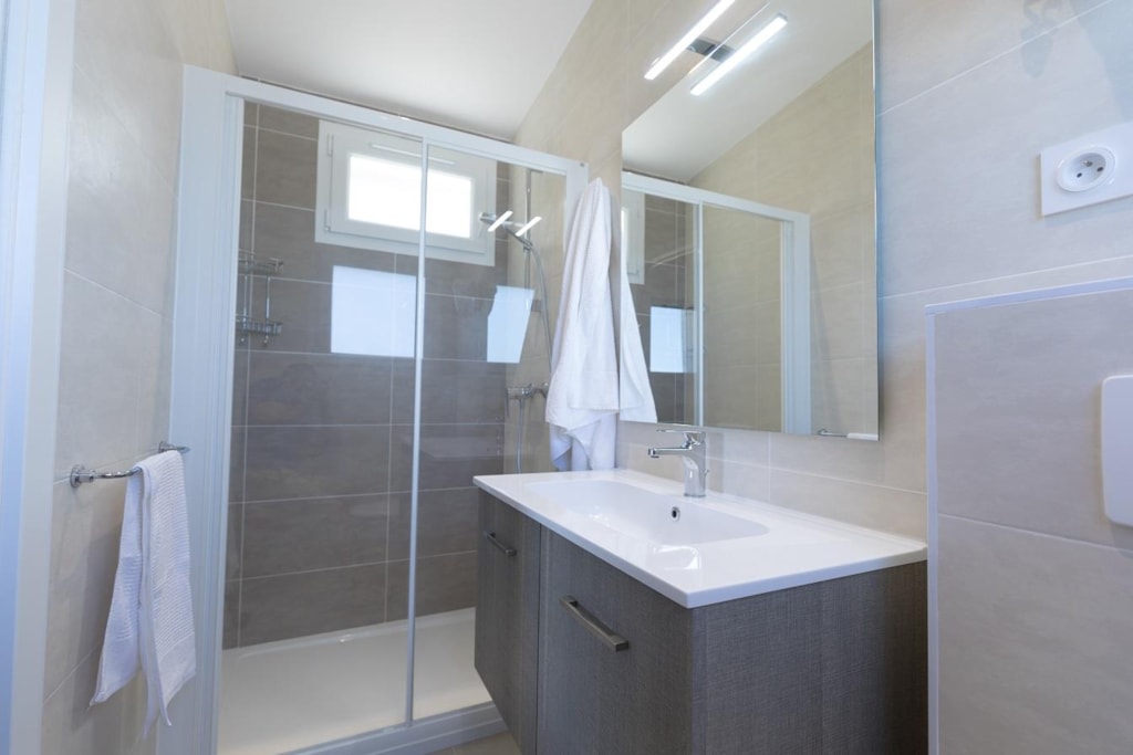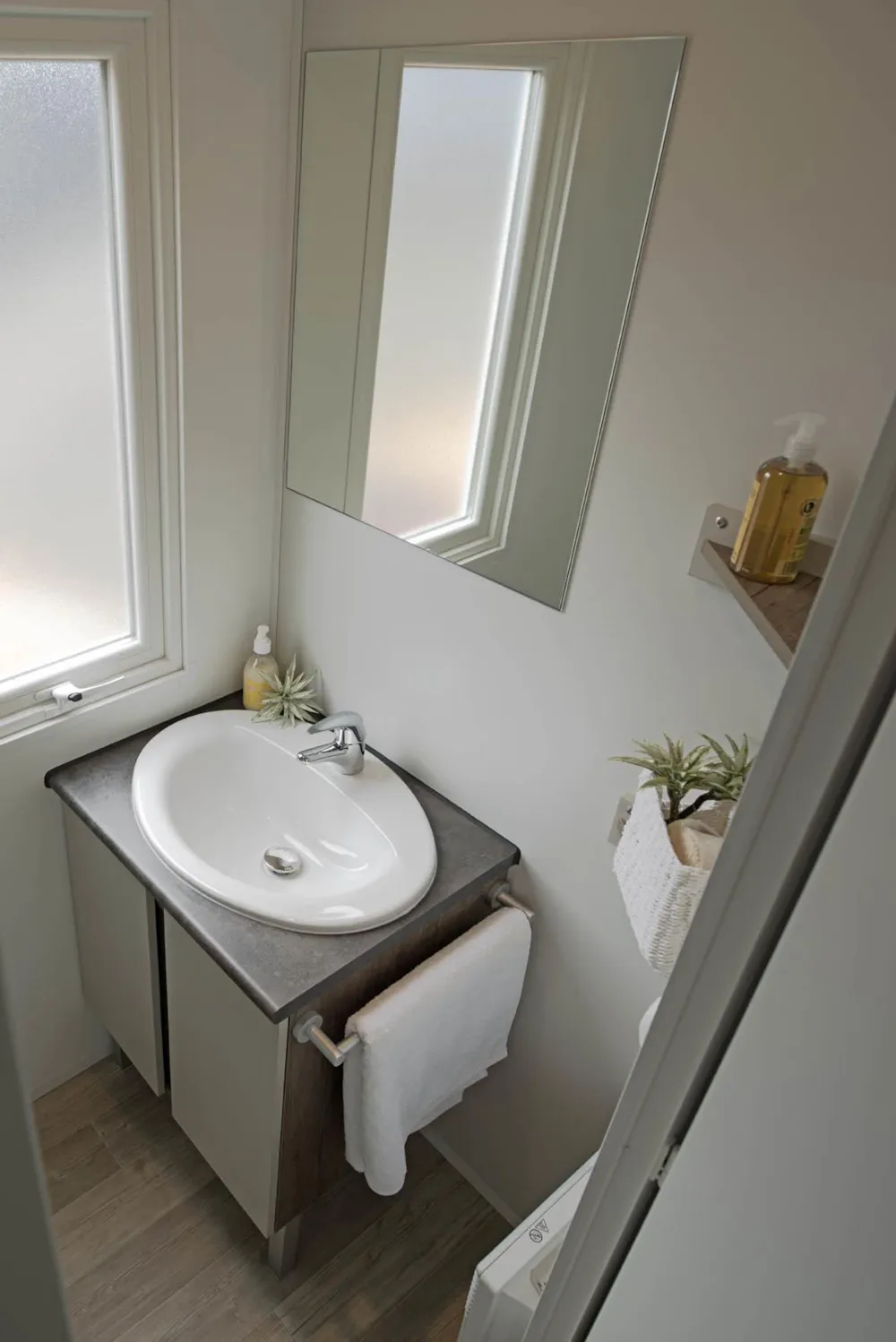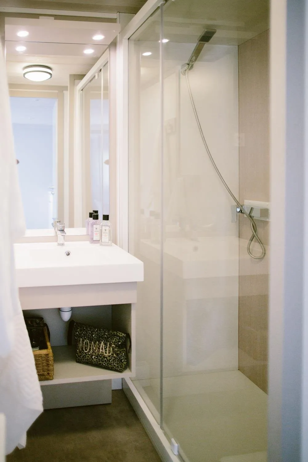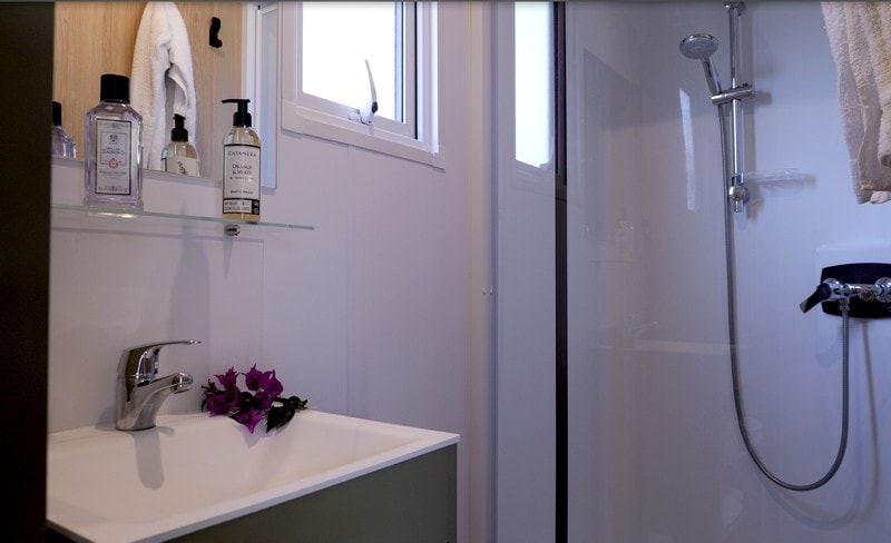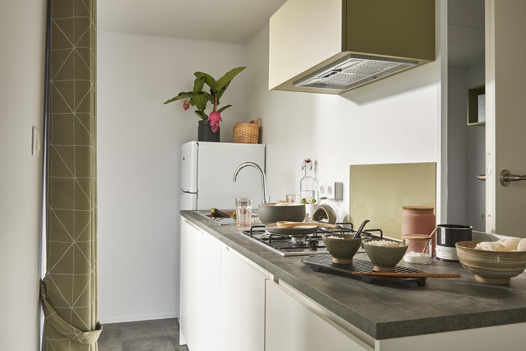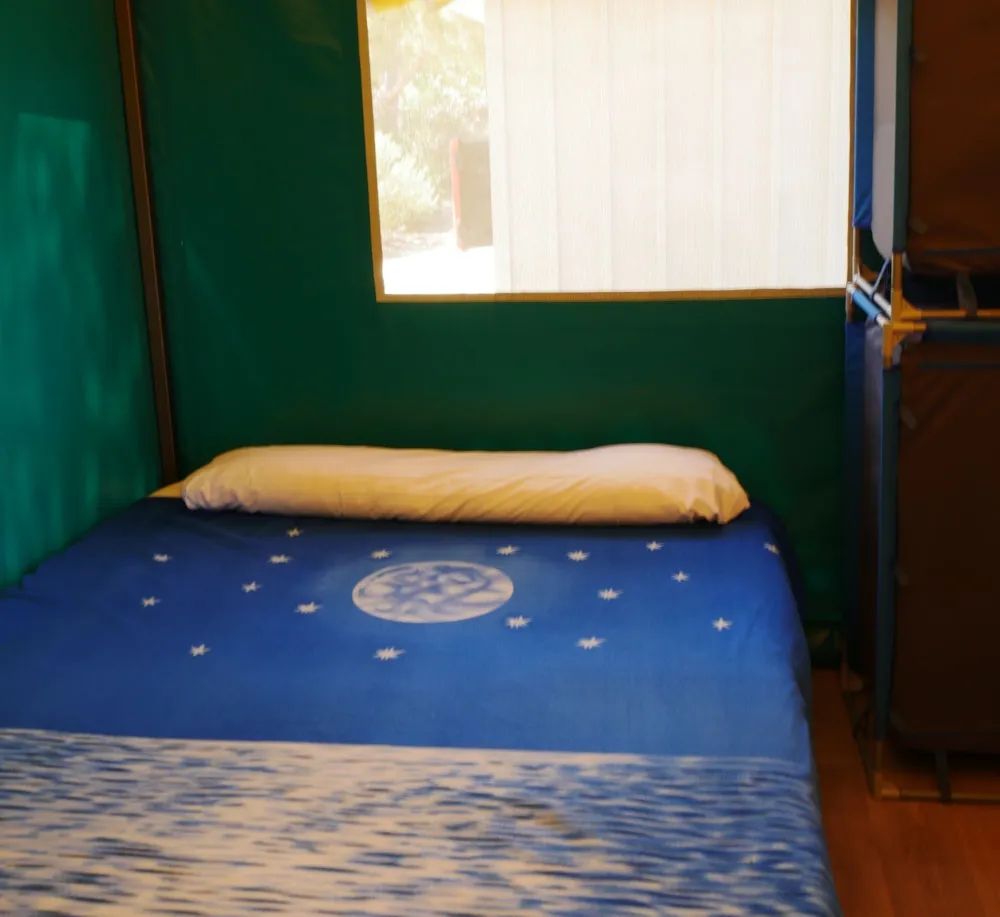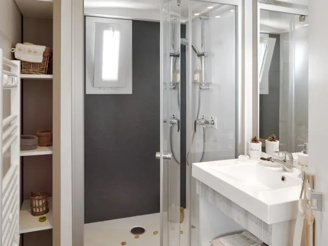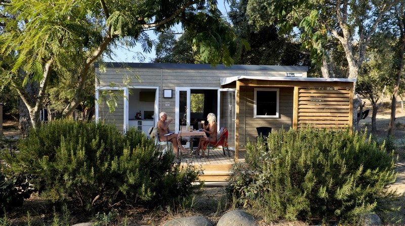 Dieses klimatisierte Mobilheim mit einer Fläche von 32 m² verfügt über eine 18 m² große Terrasse, von der ein Teil überdacht ist. Es ist ideal für bis zu sechs Personen, mit einem Elternschlafzimmer, das mit einem 140 cm Bett ausgestattet ist, und zwei Schlafzimmern, die jeweils mit zwei 80 cm Betten ausgestattet sind.
