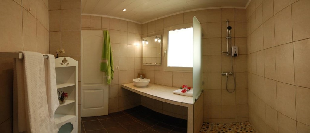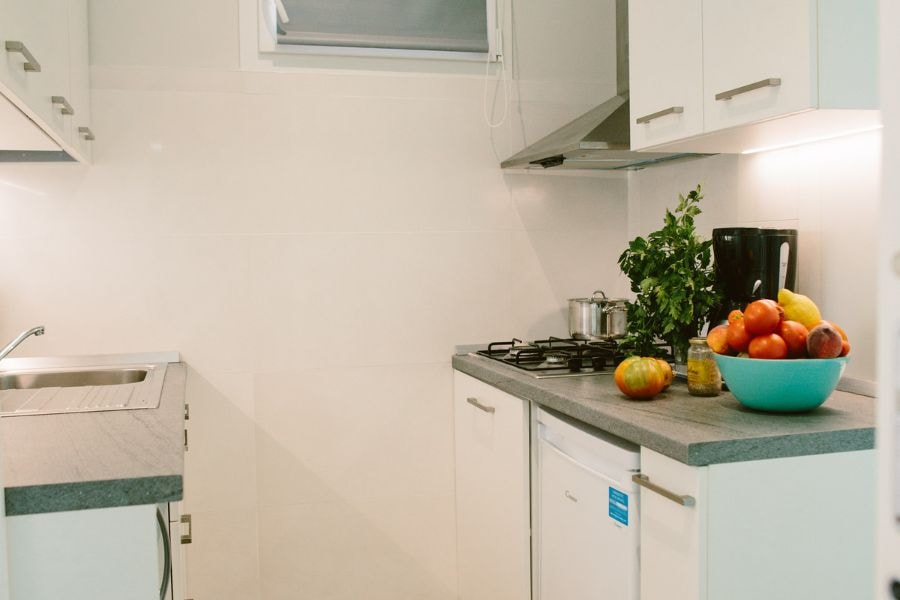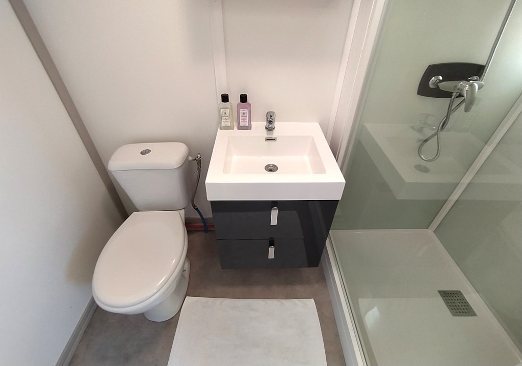 Die offene Küche zur Terrasse ist vollständig ausgestattet mit einem Waschbecken, einem Gasherd, einem Kühlschrank-Gefrierschrank, einer Mikrowelle, Geschirr und einer Kaffeemaschine. Der Wohnbereich umfasst einen Tisch, Stühle, eine Bank und einen TV. Das Badezimmer ist mit einer Dusche und einem Waschbecken ausgestattet, zusätzlich gibt es separate WC.