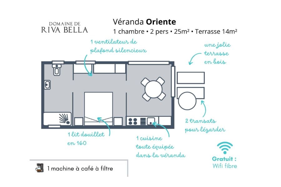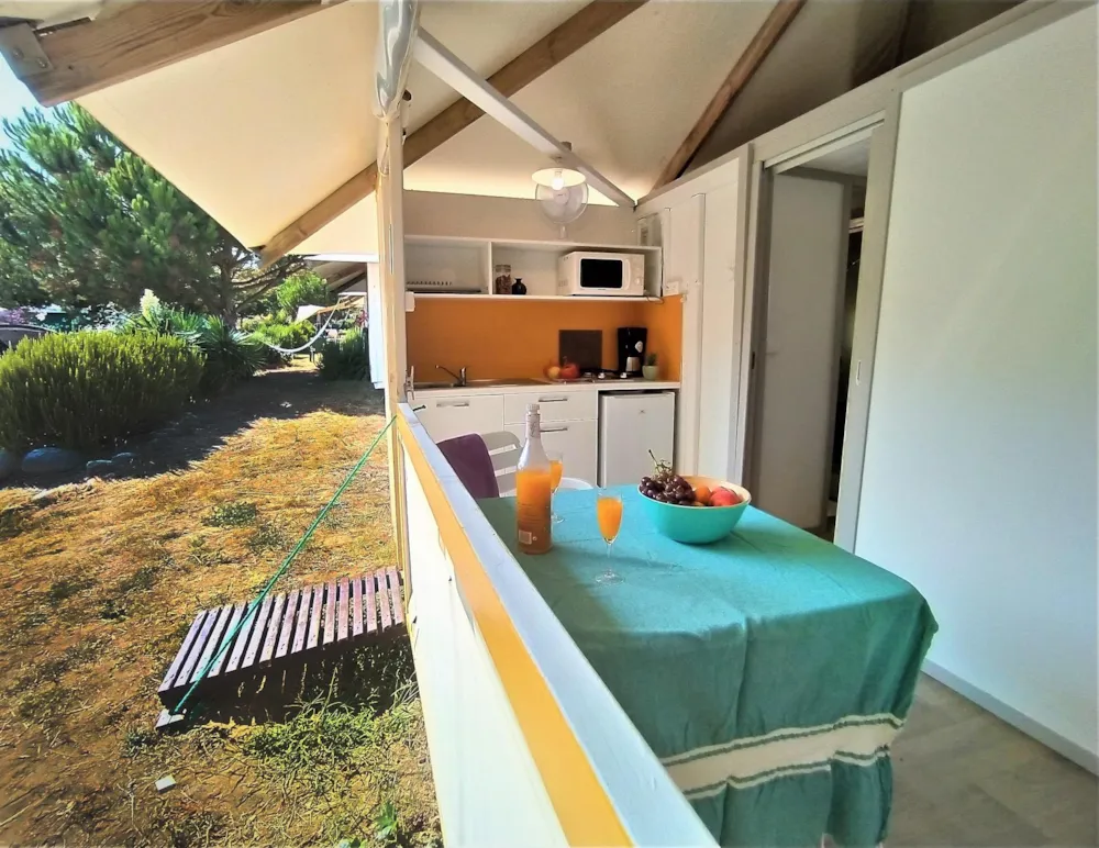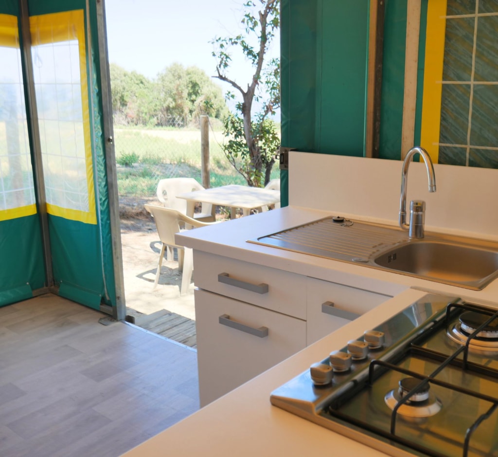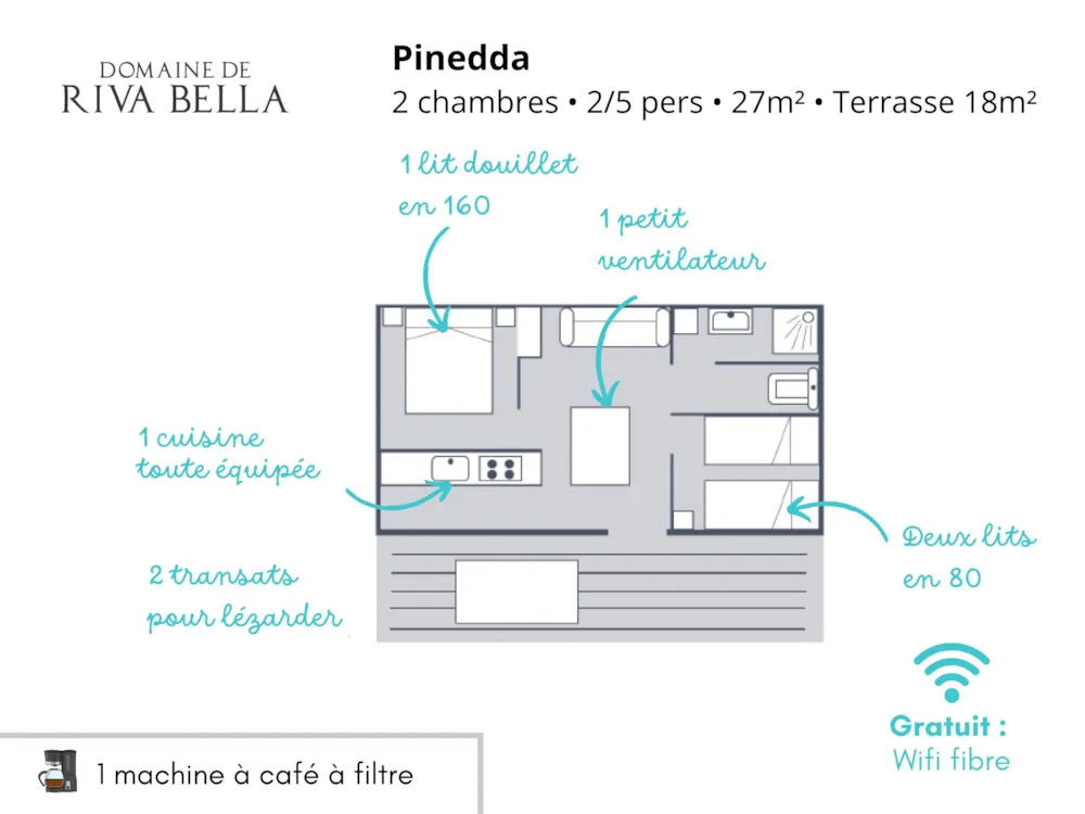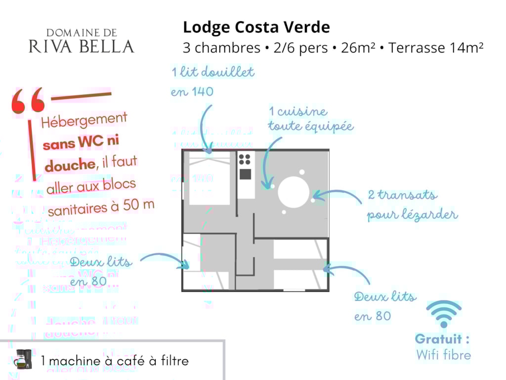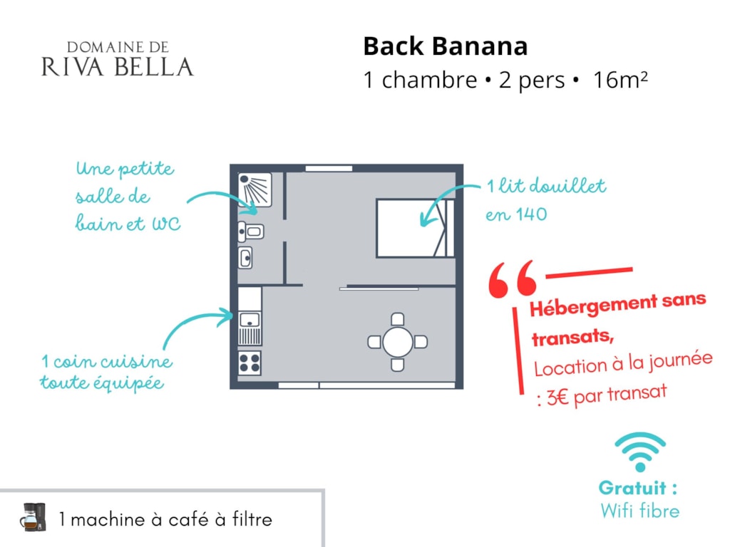Mit seinen 16 m² umfasst der Back Banana Filetta ein gemütliches Schlafzimmer mit einem 140 cm Bett, einer Garderobe und Kleiderbügeln für Ihre Sachen. Das praktische Badezimmer verfügt über ein Waschbecken, eine Dusche und WC. Die Küche ist vollständig ausgestattet mit einem Küchenmöbel, einem Gasherd, einem Kühlschrank, einer Mikrowelle und einer elektrischen Kaffeemaschine – ideal, um köstliche Mahlzeiten zuzubereiten. Der Essbereich, der zur Terrasse hin geöffnet ist, lädt Sie ein, Ihre Mahlzeiten im Freien zu genießen.