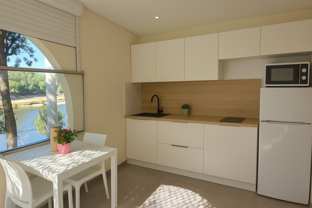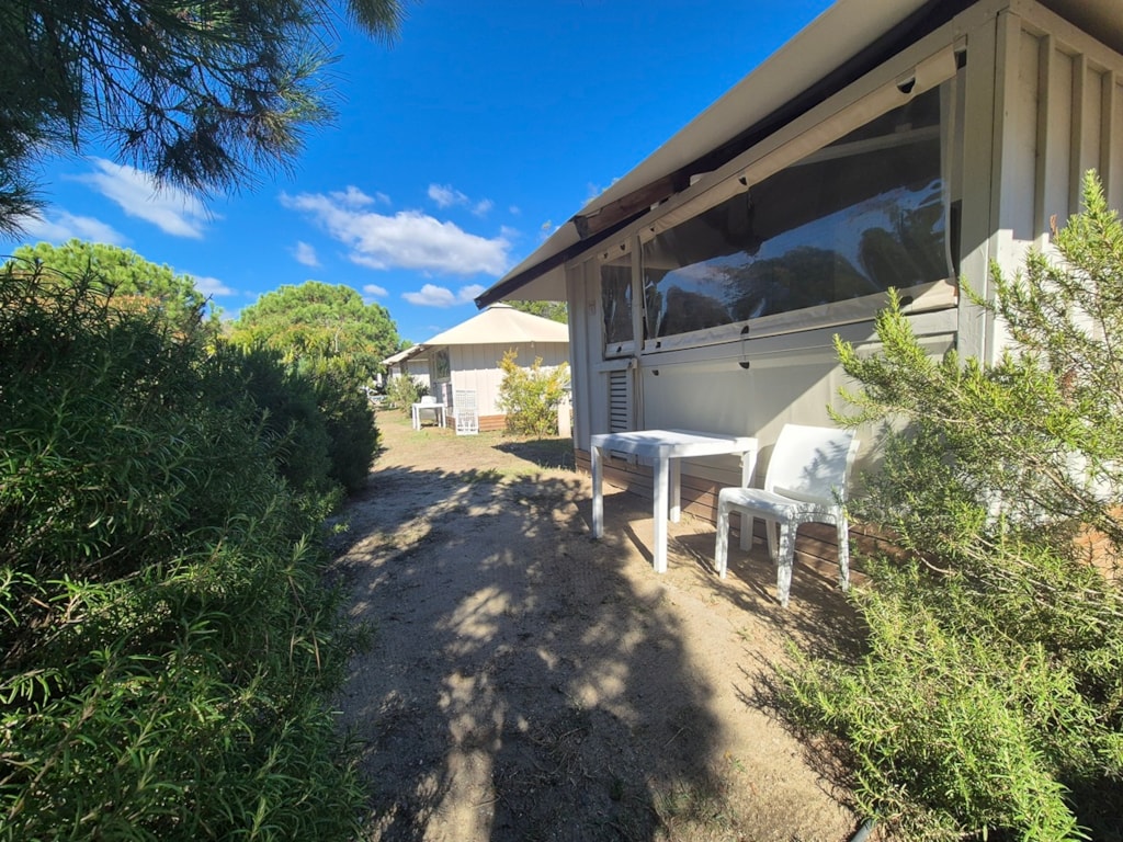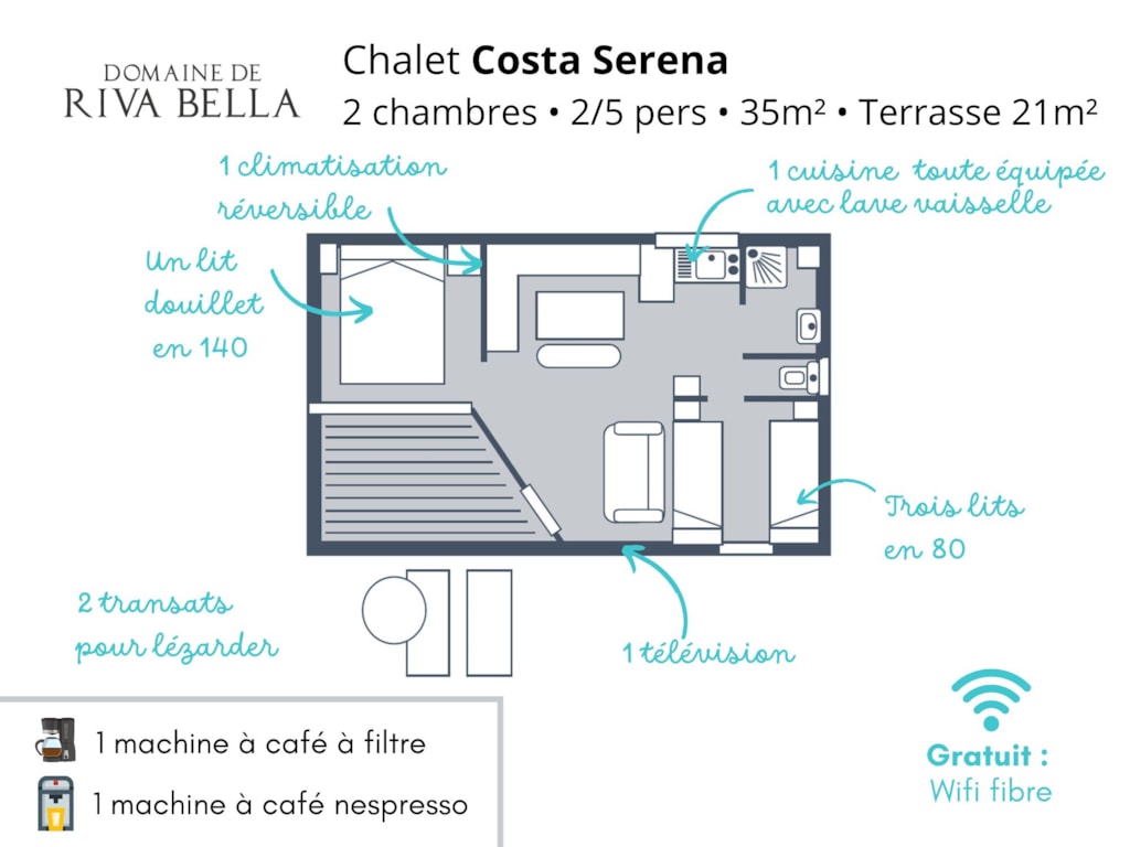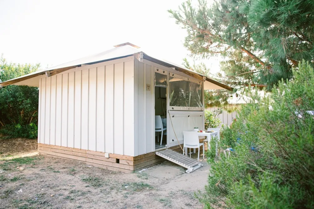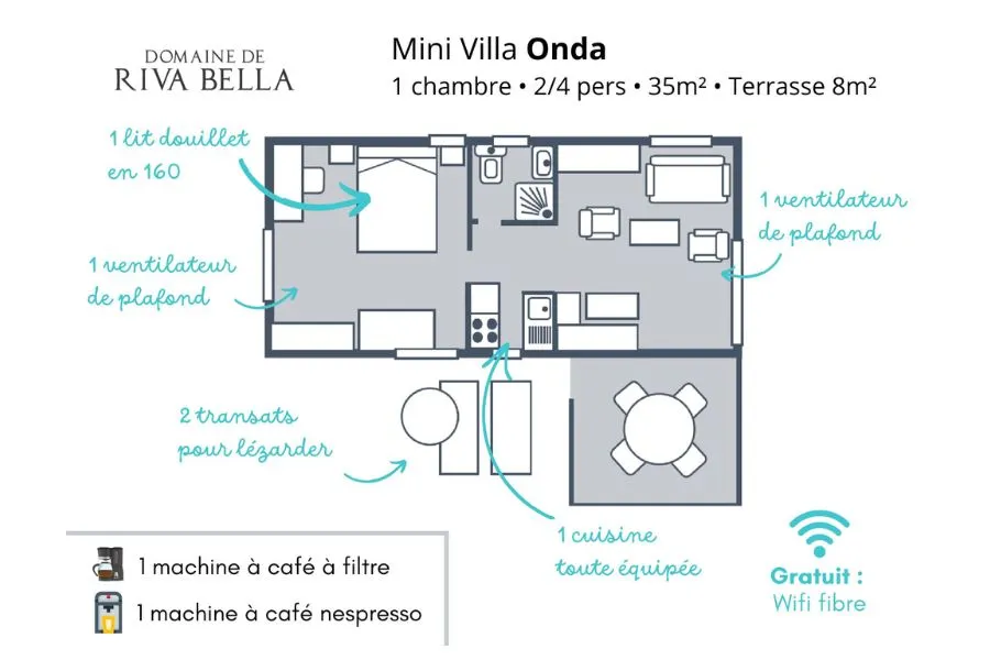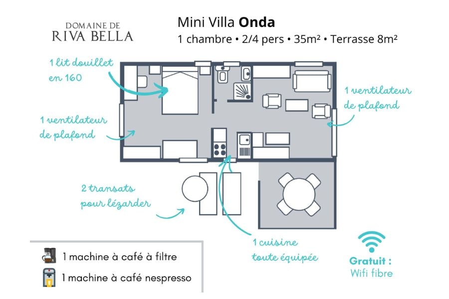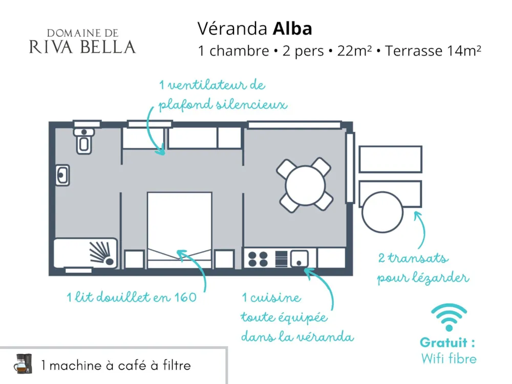 Mit seinen 16 m² umfasst der Back Banana Filetta ein gemütliches Schlafzimmer mit einem 140 cm Bett, einer Garderobe und Kleiderbügeln für Ihre Sachen. Das praktische Badezimmer verfügt über ein Waschbecken, eine Dusche und WC. Die Küche ist vollständig ausgestattet mit einem Küchenmöbel, einem Gasherd, einem Kühlschrank, einer Mikrowelle und einer elektrischen Kaffeemaschine – ideal, um köstliche Mahlzeiten zuzubereiten. Der Essbereich, der zur Terrasse hin geöffnet ist, lädt Sie ein, Ihre Mahlzeiten im Freien zu genießen.