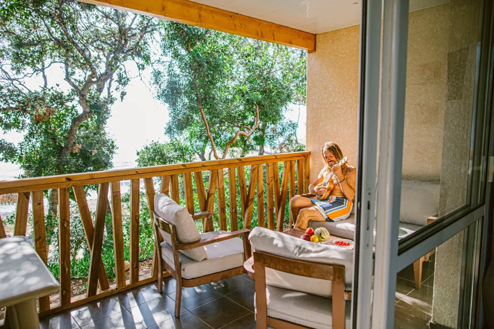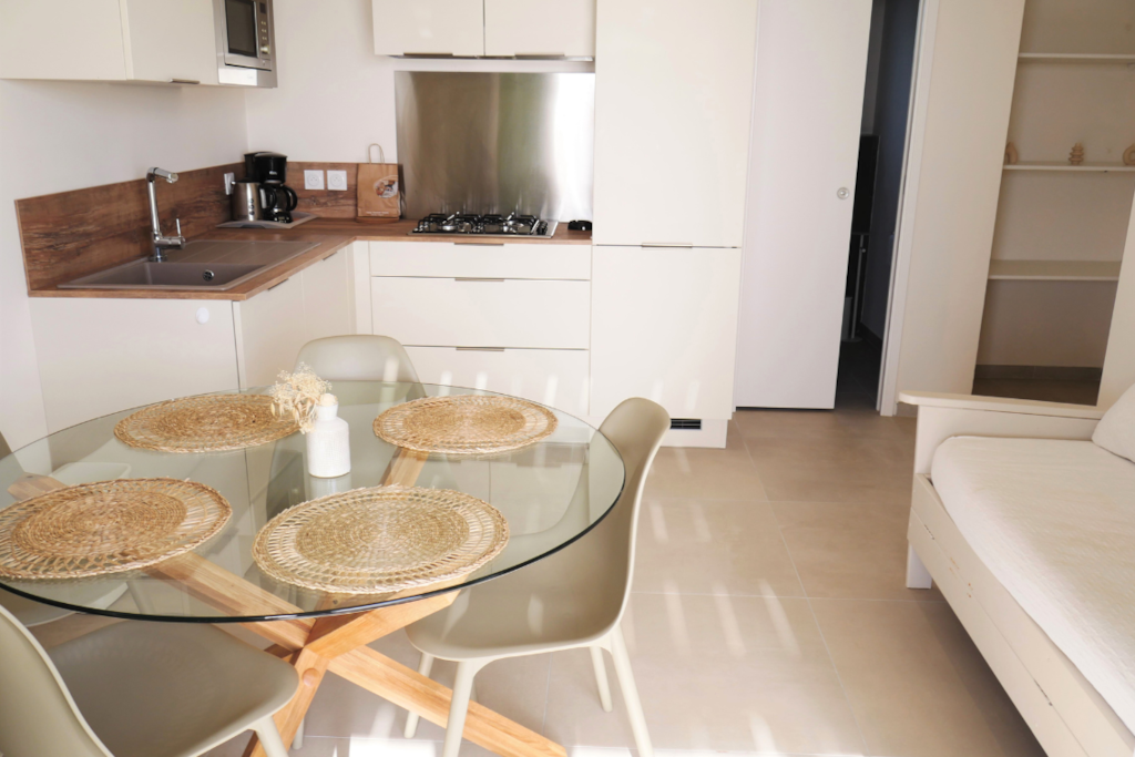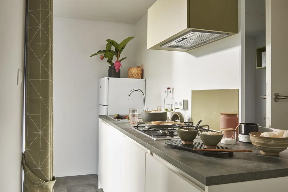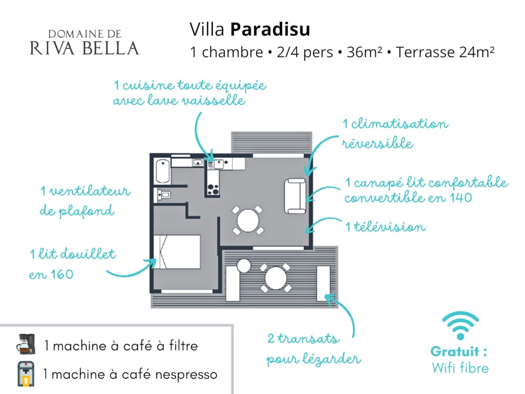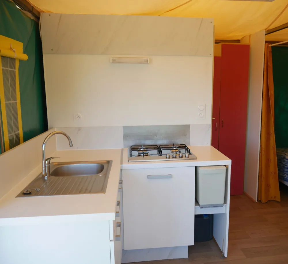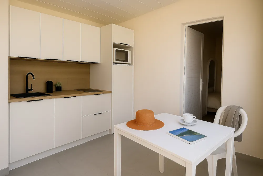 Mit seinen 16 m² umfasst der Back Banana Filetta ein gemütliches Schlafzimmer mit einem 140 cm Bett, einer Garderobe und Kleiderbügeln für Ihre Sachen. Das praktische Badezimmer verfügt über ein Waschbecken, eine Dusche und WC. Die Küche ist vollständig ausgestattet mit einem Küchenmöbel, einem Gasherd, einem Kühlschrank, einer Mikrowelle und einer elektrischen Kaffeemaschine – ideal, um köstliche Mahlzeiten zuzubereiten. Der Essbereich, der zur Terrasse hin geöffnet ist, lädt Sie ein, Ihre Mahlzeiten im Freien zu genießen.