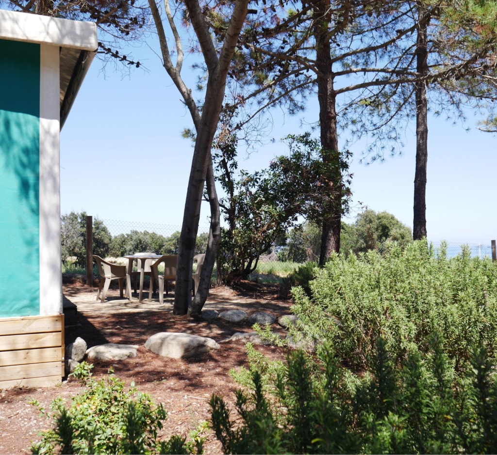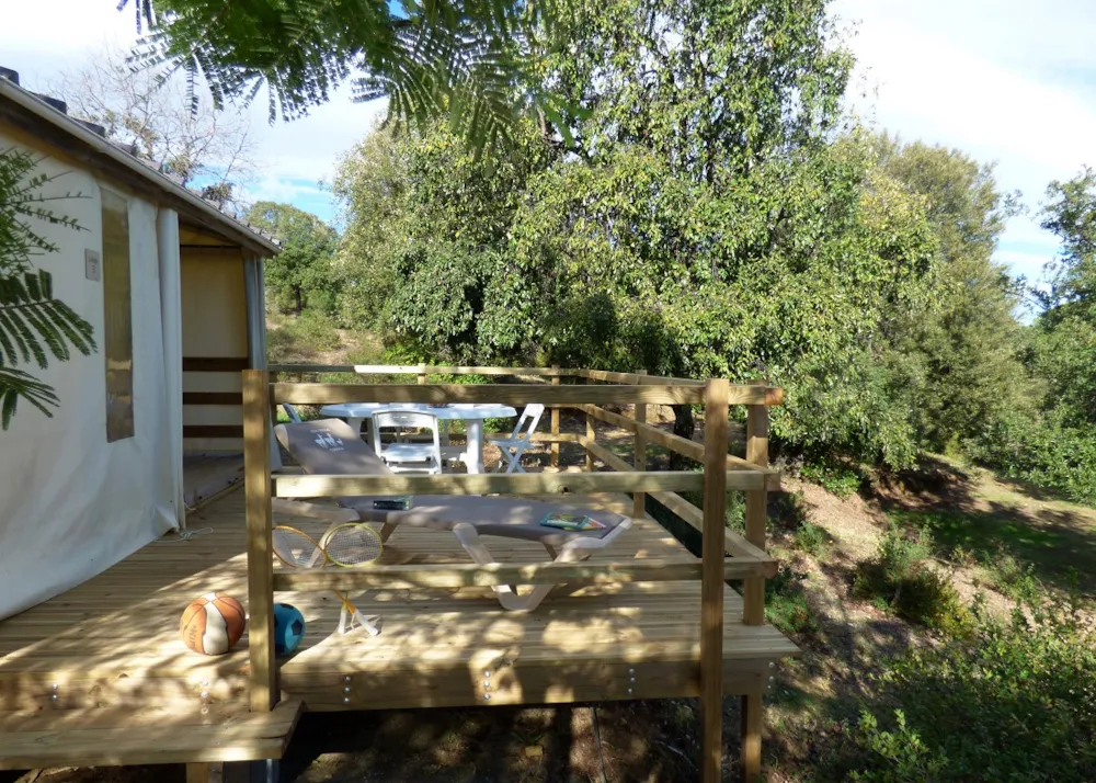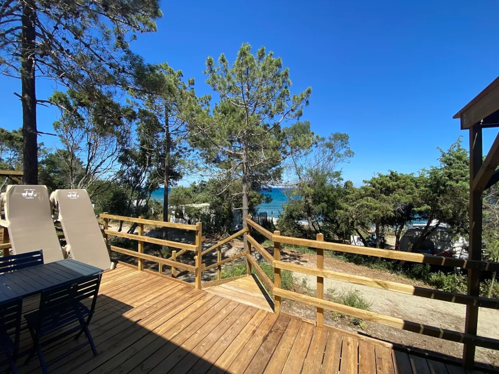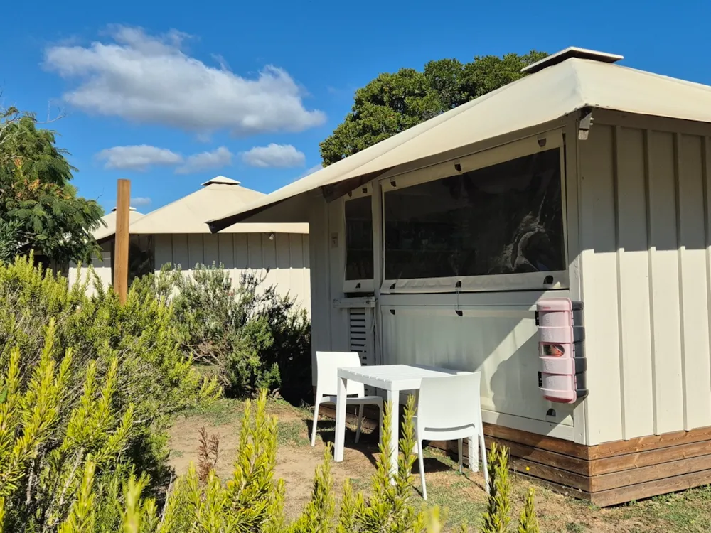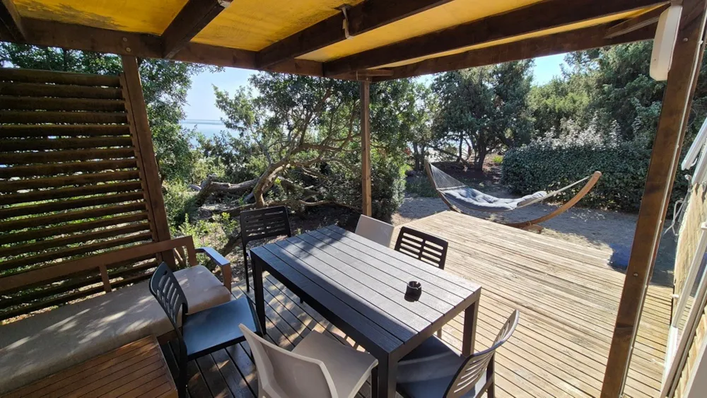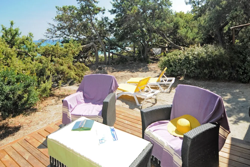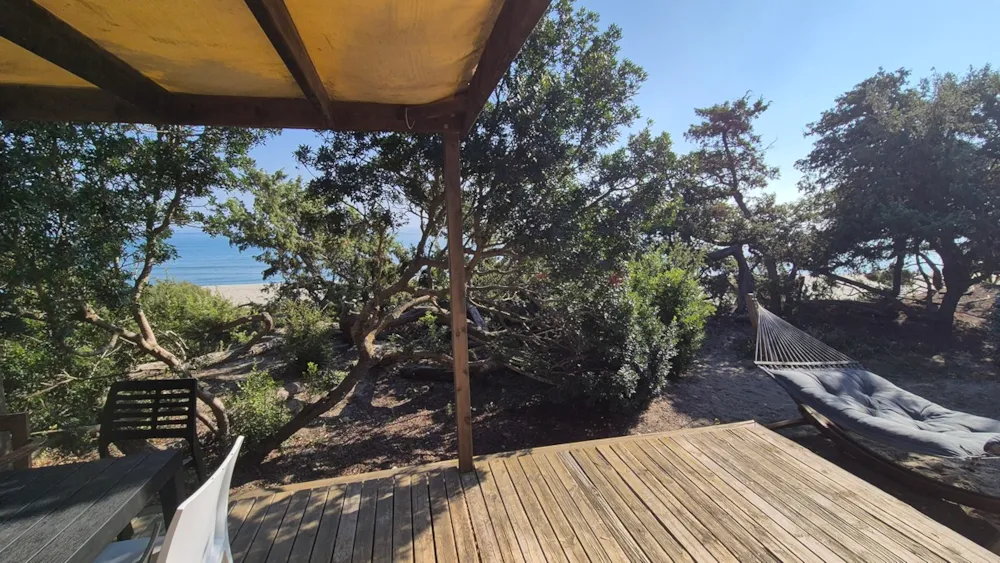 Entdecken Sie unser vollständig ausgestattetes Zelt, einen friedlichen Rückzugsort, der nur 80 Meter vom Meer entfernt in der Natur liegt und eine teilweise Aussicht auf das Meer von der Terrasse bietet.