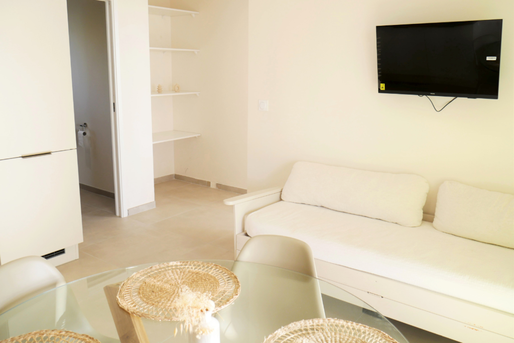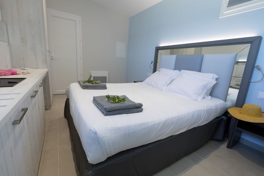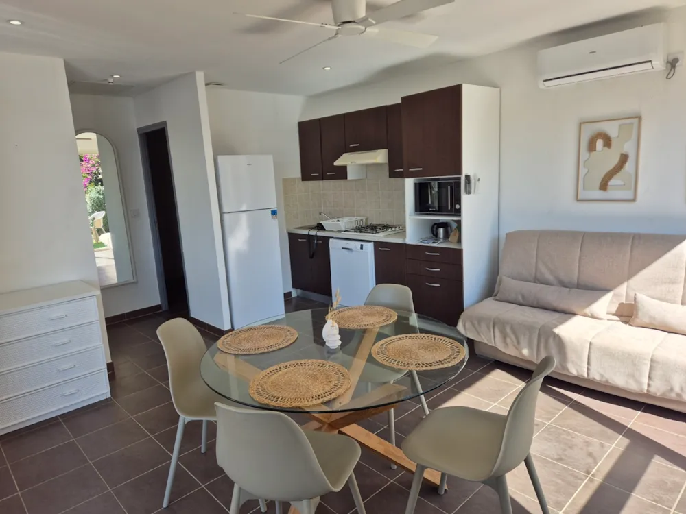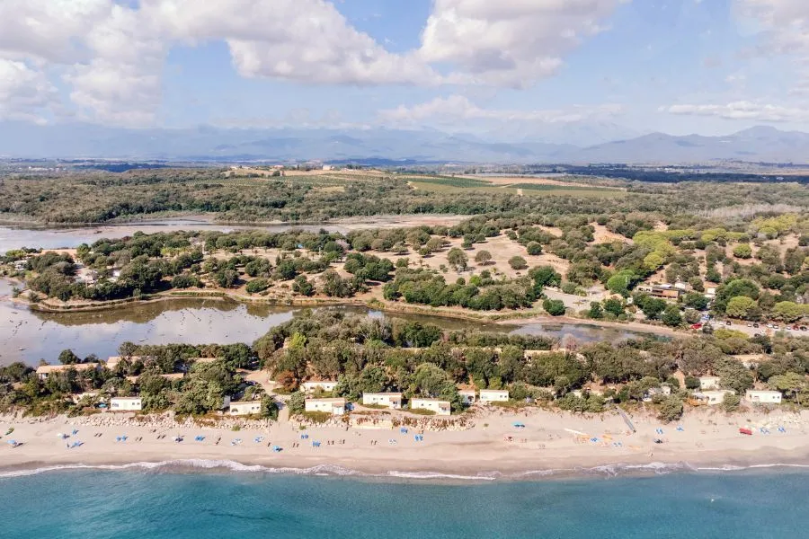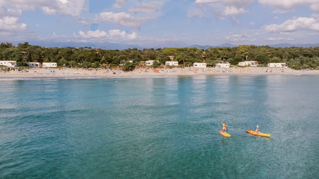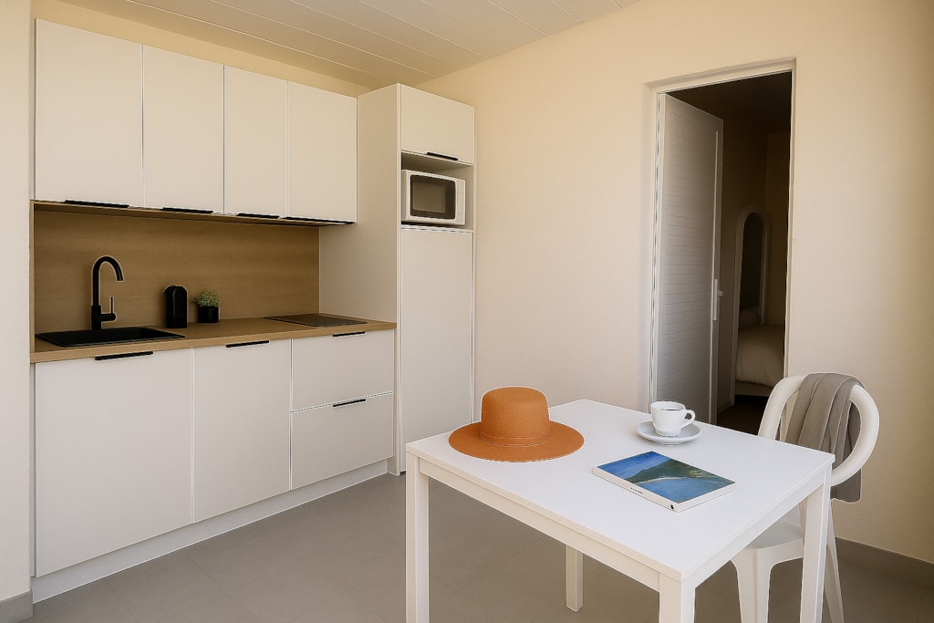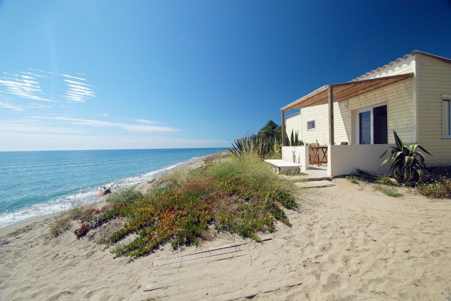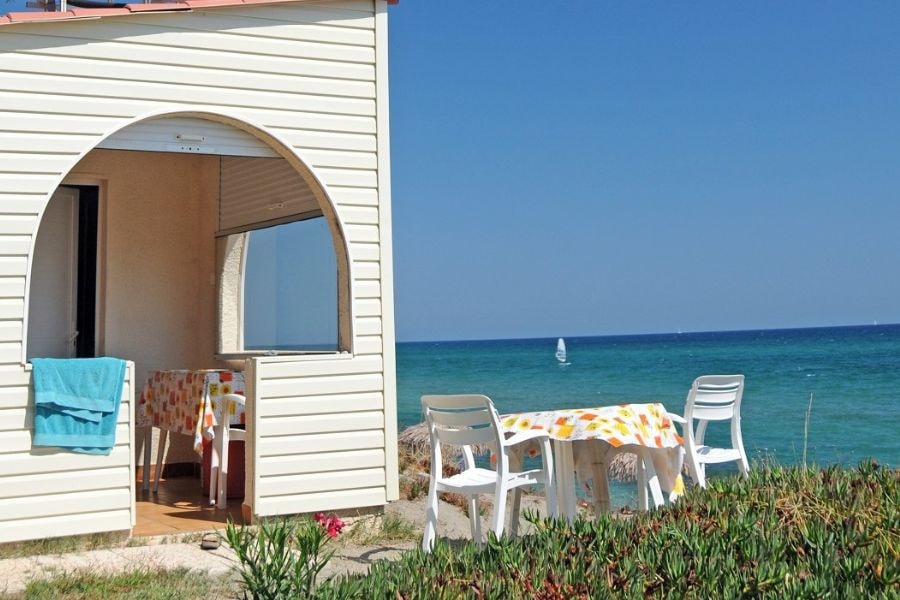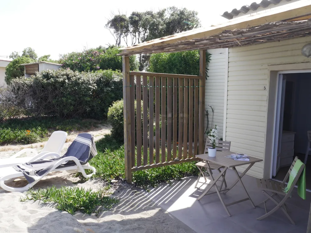 Dieser charmanter Bungalow mit 32 m² Wohnfläche liegt direkt am Strand und ist der ideale Ort für einen erholsamen und komfortablen Aufenthalt. Voll klimatisiert, bietet es ein gemütliches Schlafzimmer mit einem 160 cm breiten Doppelbett, eine moderne, voll ausgestattete Küchenzeile im Wohnbereich, ein Badezimmer mit WC sowie eine sonnige Terrasse – perfekt, um das schöne Wetter in vollen Zügen zu genießen.
