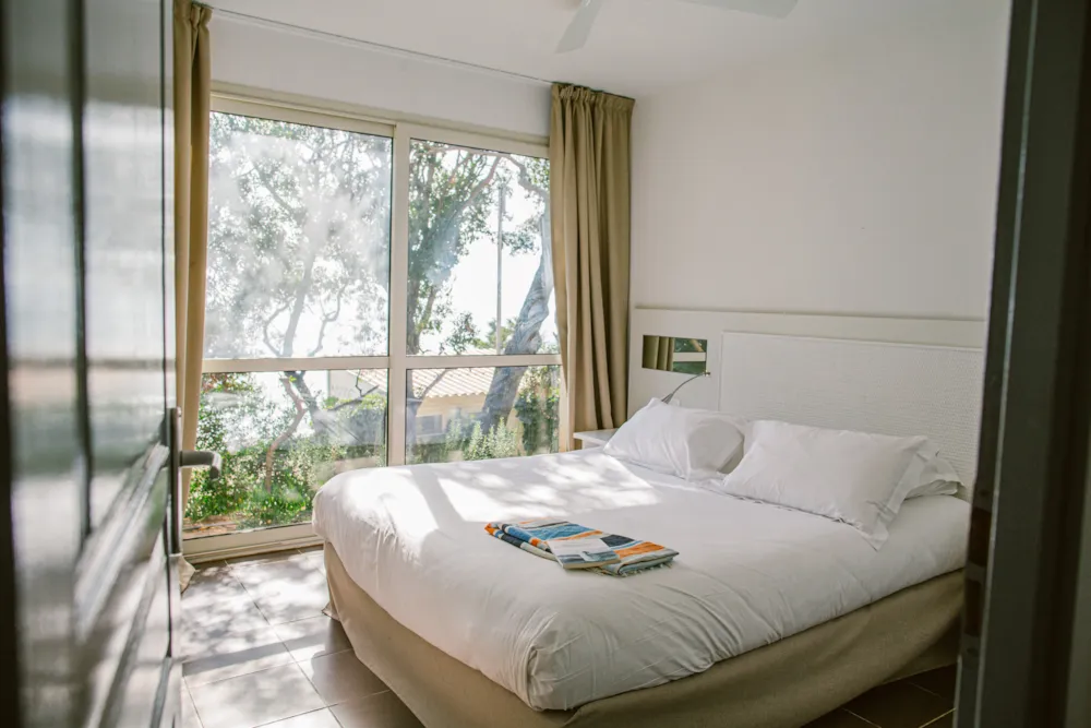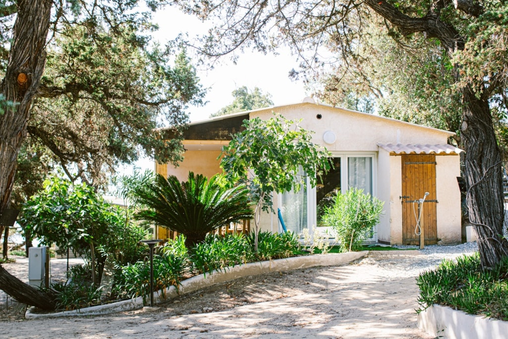 Ideal für Familien- oder Freundesurlaube verfügt es über ein Schlafzimmer mit einem Doppelbett und ein zweites Schlafzimmer mit zwei Einzelbetten, sowie über eine voll ausgestattete Küchenzeile und ein Badezimmer für Ihren Komfort. Draußen genießen Sie einen Tisch und Stühle für Mahlzeiten im Freien, begleitet von einem Stoffschirm (an der Rezeption gegen eine Kaution von 20 € erhältlich) und 2 Liegestühlen für entspannende Momente. Die Betten sind bei Ihrer Ankunft gemacht, sodass Sie Ihren Aufenthalt sorgenfrei beginnen können.