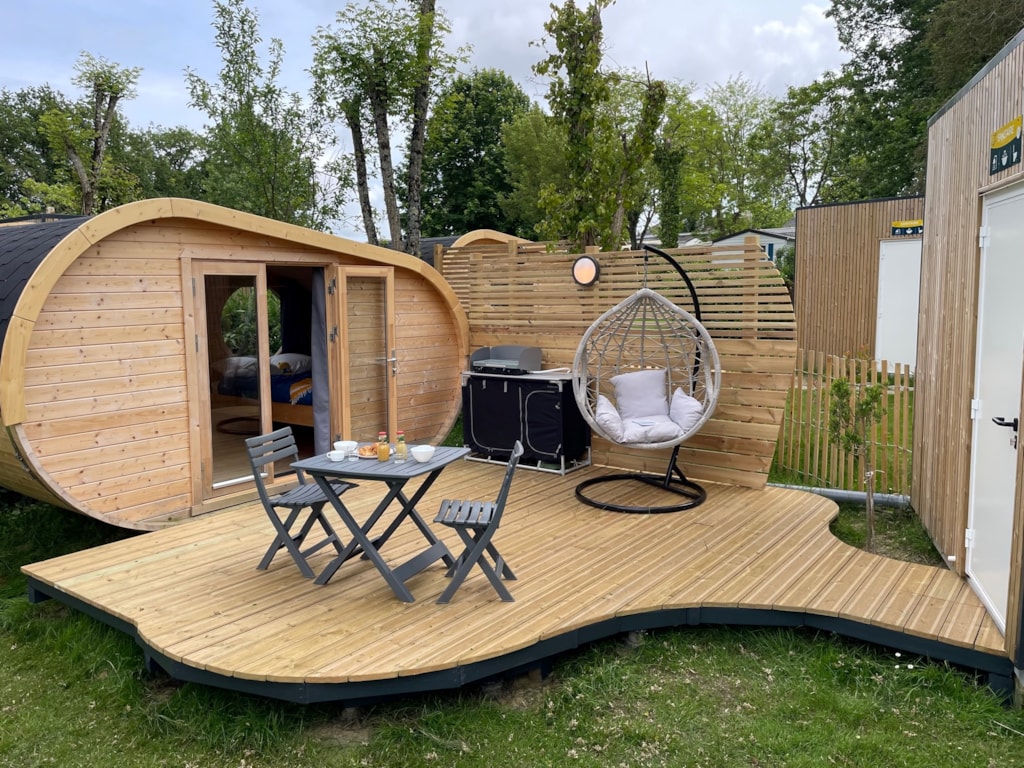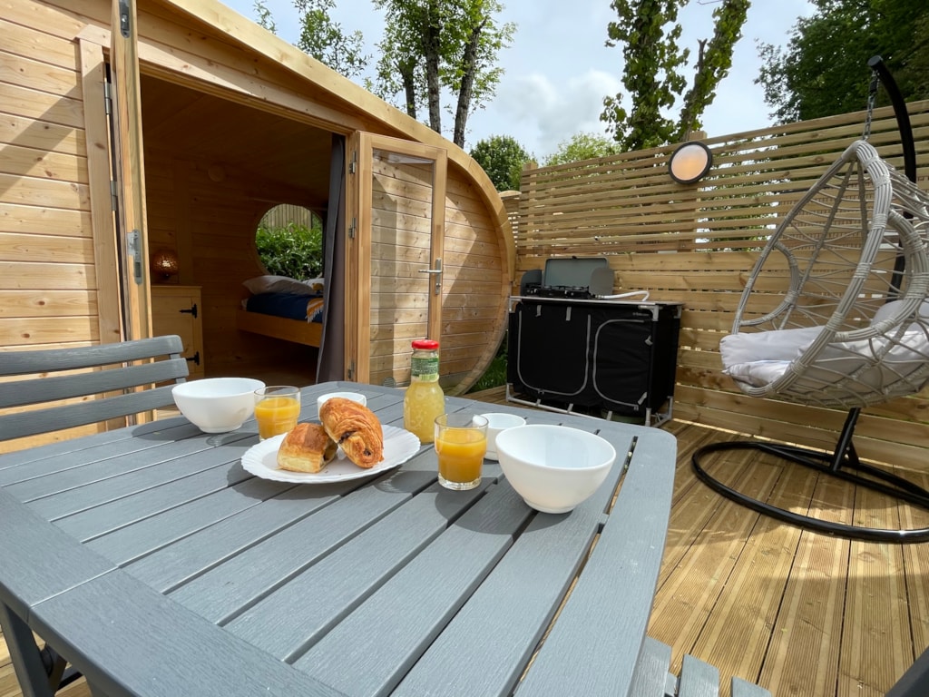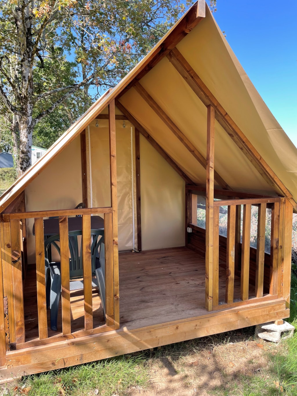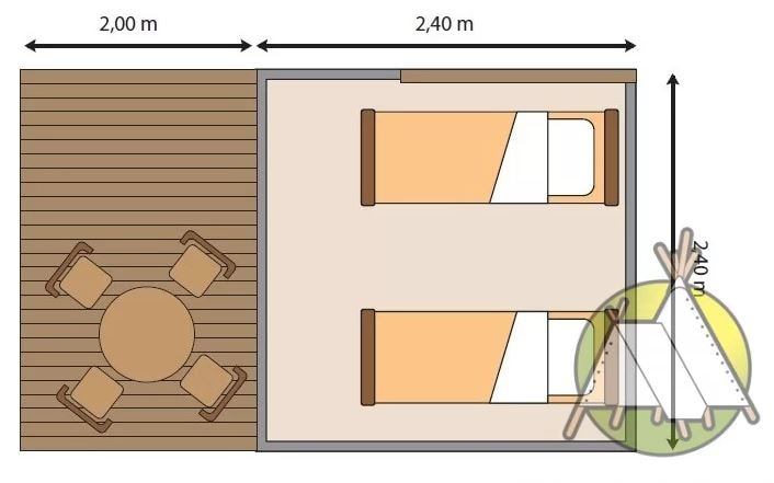 The "cyclotente" is a half wood / half canvas tent equipped with 2 single beds, a bedside table, electricity and a bedside lamp. An awning with a table and two chairs allows you to have meals outside in comfort. A bicycle shed is adjacent to this tent to store your bikes for the night.