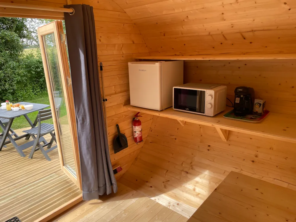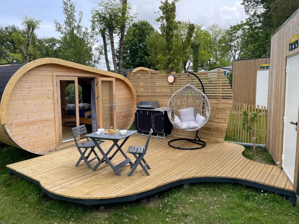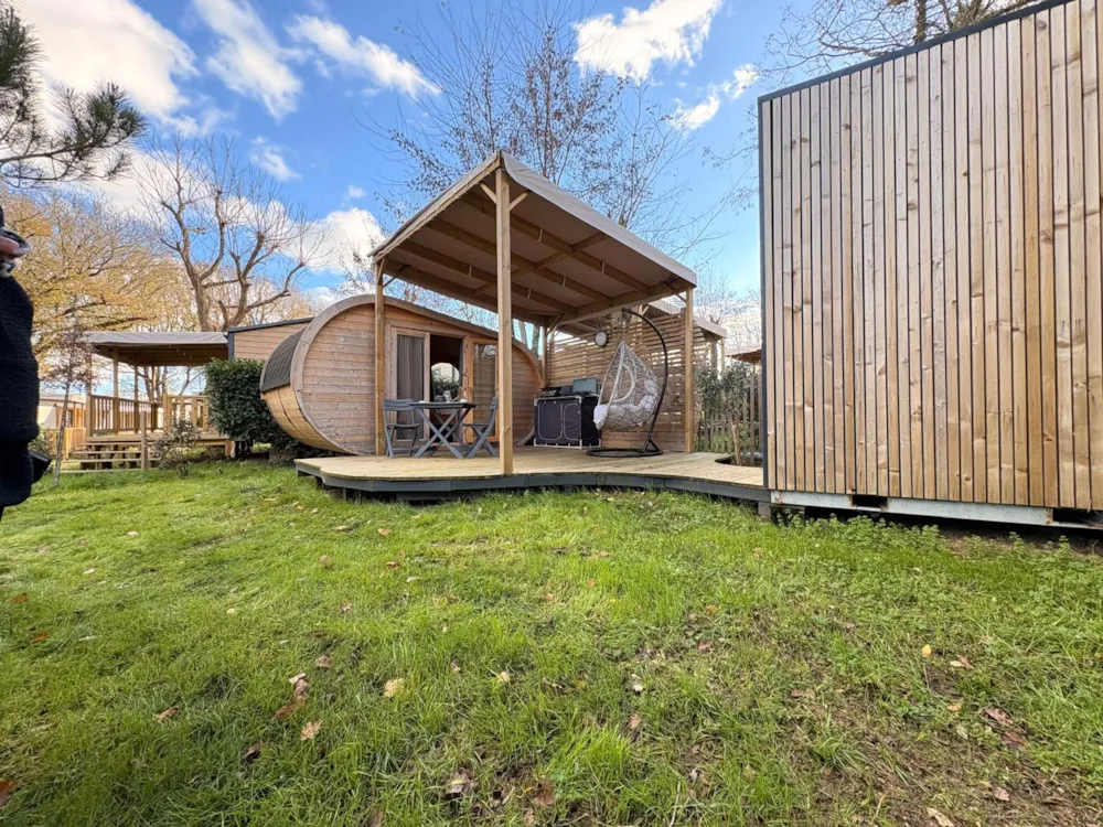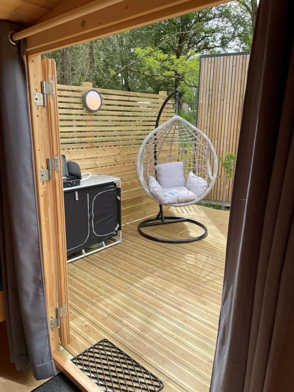 The "cyclotente" is a half wood / half canvas tent equipped with 2 single beds, a bedside table, electricity and a bedside lamp. An awning with a table and two chairs allows you to have meals outside in comfort. A bicycle shed is adjacent to this tent to store your bikes for the night.