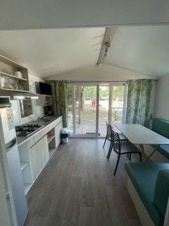 Ausstattung: Bettwäsche (Bettdecken und Kissen) (Bettlaken nicht vorhanden), eine halbüberdachte Terrasse mit Gartenmöbeln und 2 Liegestühlen für Ihre Momente der Entspannung. Elektrischer Konvektor im Hauptraum.