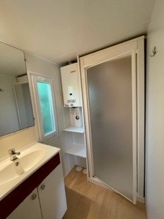 Description : a bedroom with 1 double bed (140x190) and cupboard, a bedroom with 2 single beds (80x190) and cupboard, a living room - dining room - kitchen, a shower room with shower and separate toilet. No TV
