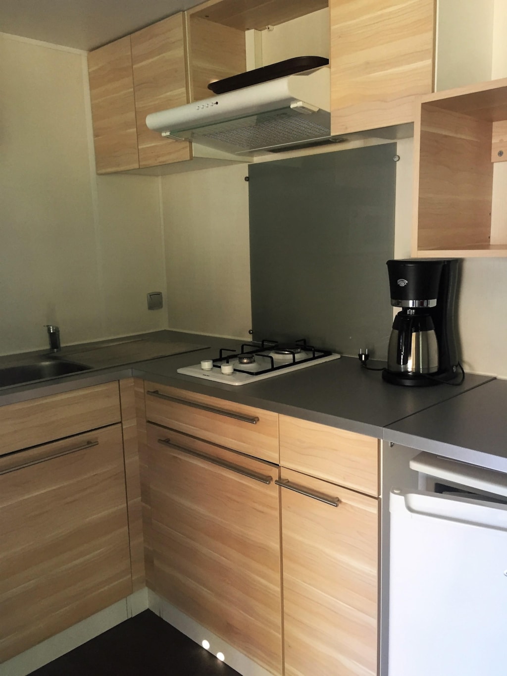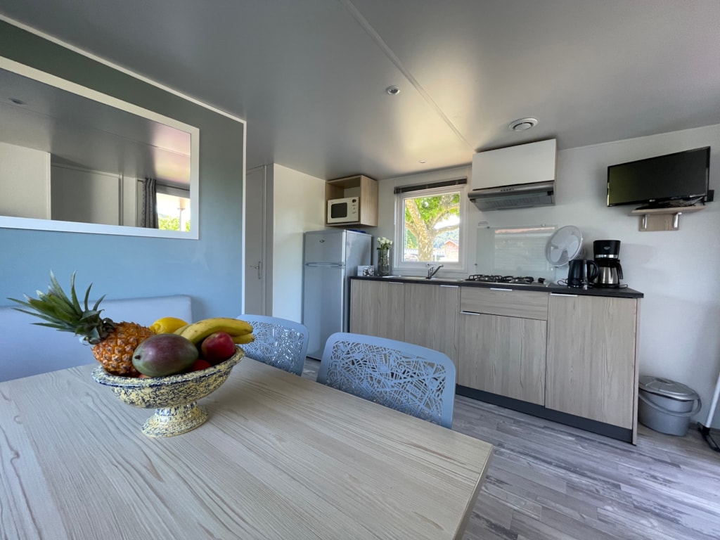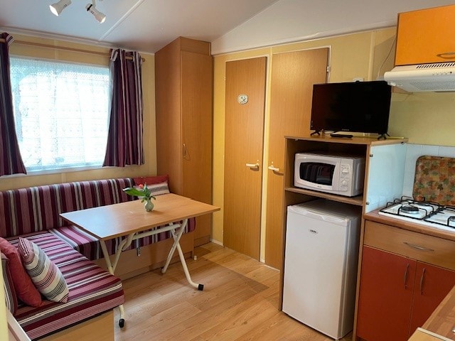 Mobilheim 2 Schlafzimmer (1 Bett 140 und 2 Betten 80) Feste Klimaanlage - 1 Ventilator - TV - Duschraum - separates WC - Küche/Wohnzimmer mit (Kühlschrank mit Gefrierfach, Mikrowelle, Filterkaffeemaschine, Wasserkocher) - überdachte Terrasse - Parkplatz für 1 Fahrzeug in der Nähe Ihres Mietobjekts. Beheizter Gemeinschaftspool. WIFI INKLUSIVE