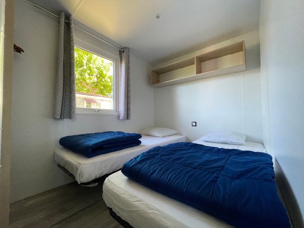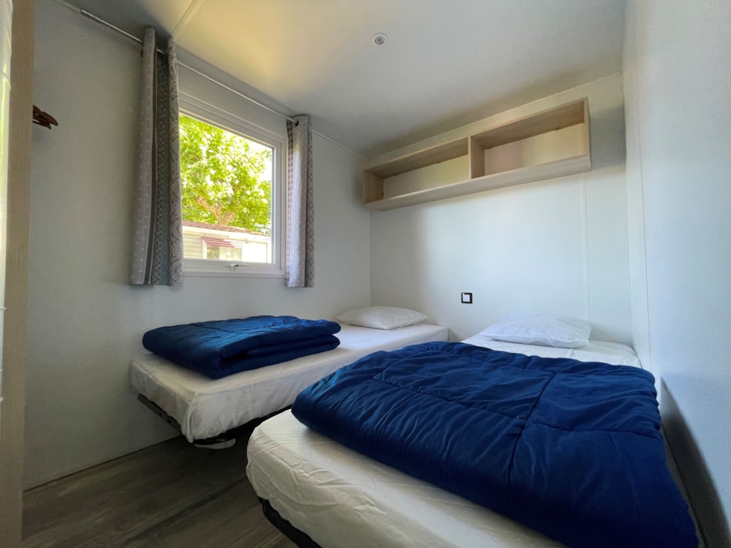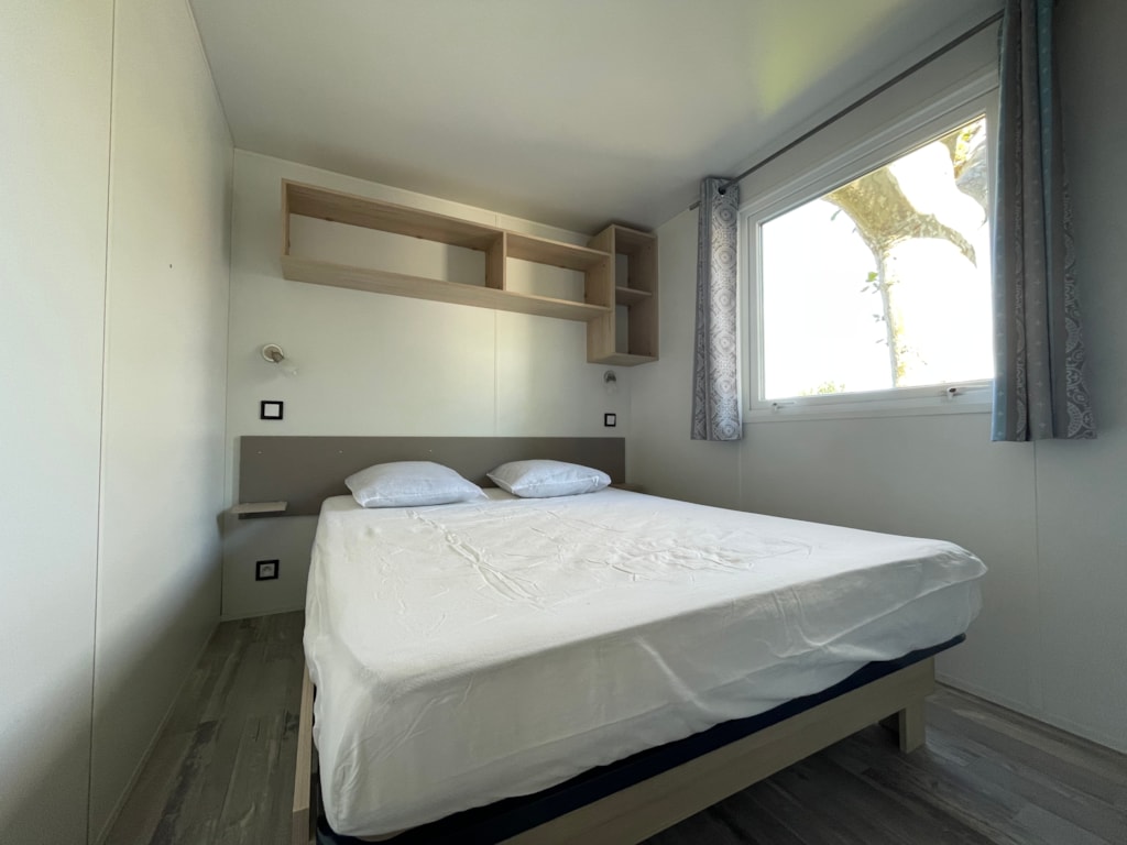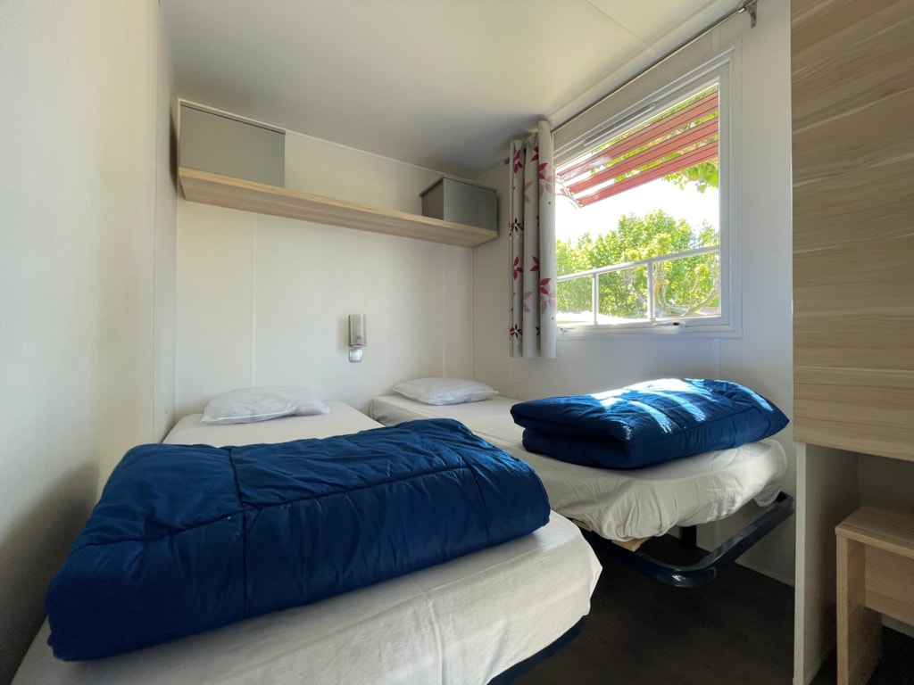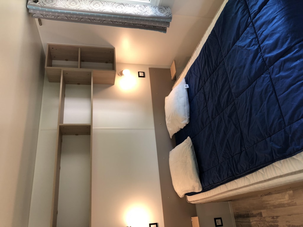 Das Mobilheim IRM verfügt über ein Schlafzimmer mit einem 140 cm breiten Bett. Eine dritte Person (gegen Aufpreis) kann in einem kleinen Zimmer mit einem 80 cm breiten Bett übernachten.