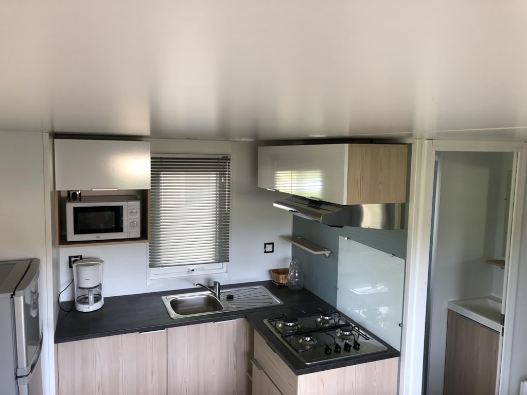Dieses Mobilheim mit 3 Schlafzimmern besteht aus: 1 Schlafzimmer mit einem Doppelbett 140/200 und 2 Schlafzimmern mit 2 x 2 Einzelbetten 80/190, Badezimmer mit Duschecke und separater Toilette, einer Küchenzeile mit allen notwendigen Küchenutensilien (Kühlschrank, Gefrierschrank, Mikrowelle , Ventilator und Kaffeemaschine), Klimaanlage. Eine Fenstertür führt auf eine halbüberdachte Terrasse. Gartenmöbel werden Ihnen zur Verfügung gestellt. KOSTENLOSES WIFI