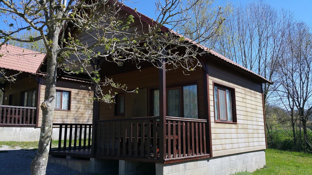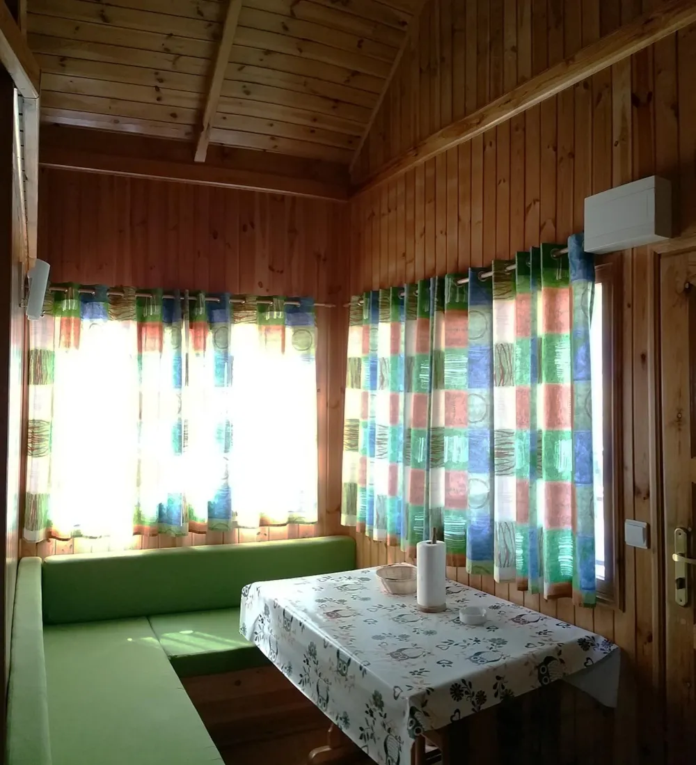 6 Pax Holzbungalows, 1 Schlafzimmer mit Doppelbett + Mezzanine mit 1 Doppelbett und 2 Einzelbetten. Ausgestattete Küche, Kleidung, Bett, TV und Heizung. Es gibt keine Handtücher.