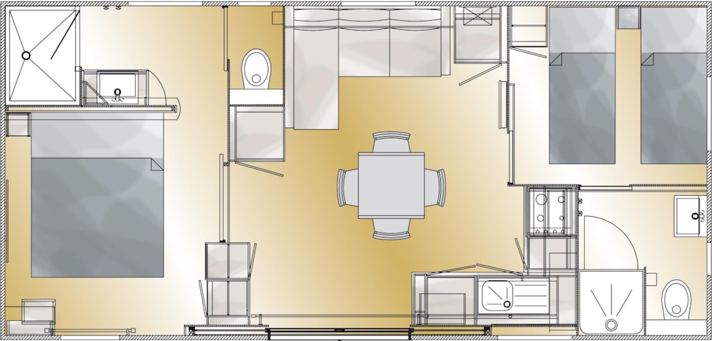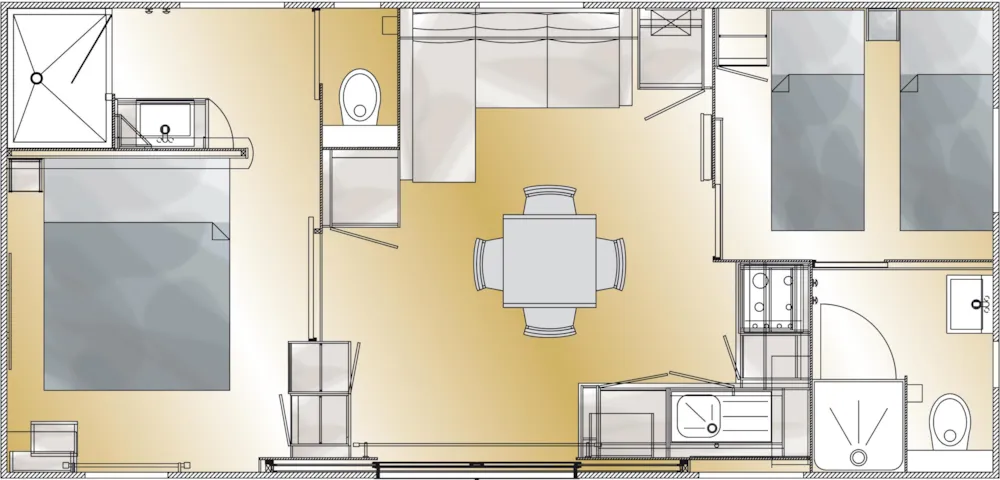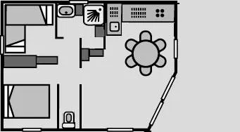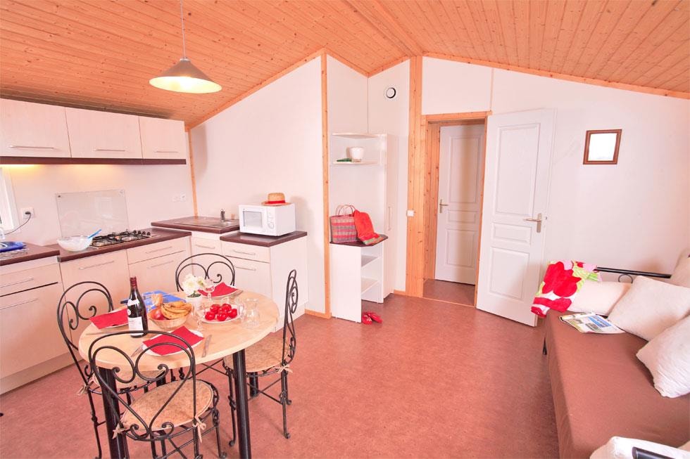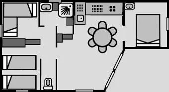 1 Schlafzimmer mit Bett 160x200 cm, 1 Zimmer mit 2 Einzelbetten, 1 Zimmer mit Etagenbett (2 Pers.), Wohnzimmer, Kochnische, Waschraum (Dusche, Waschbecken), WC separat. Heizung in den 4 Zimmer. Holzterrasse, Gartenmöbel, 2 Liegestühle, Grill inklusive.