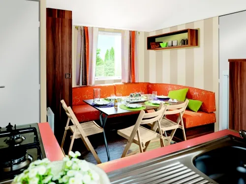Ce tout nouveau grand mobil home est idéalement placé avec une grande terrasse semie couverte et une magnifique vue sur le paysage environnant. Parking privatif et télévision.