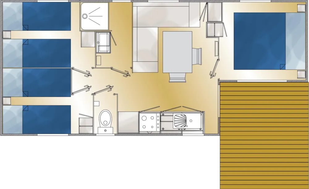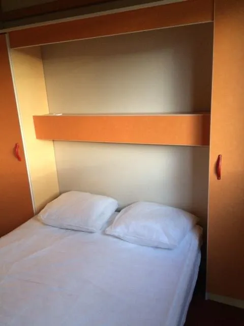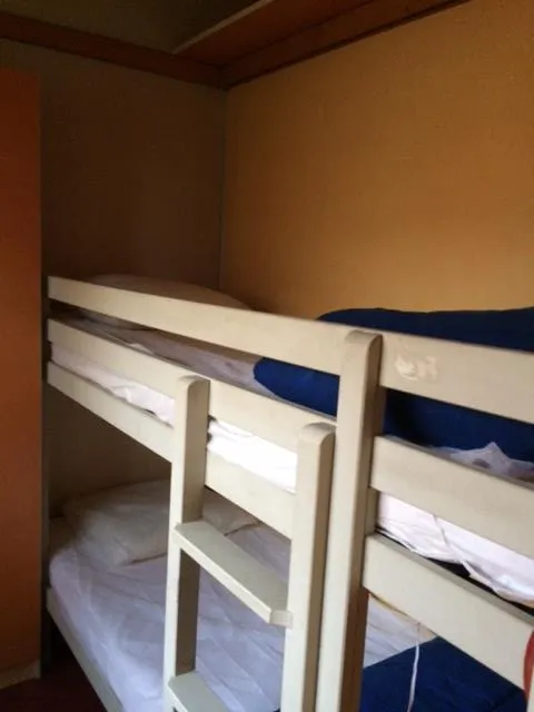Dieses komplett ausgestattete Holzchalet umfasst 2 Schlafzimmer: eines mit einem Doppelbett (140x200) und eines mit 2 Etagenbetten (80x200) und einem zusätzlichen Einzelbett (80x200). Decken und Kopfkissen werden gestellt, aber keine Bettwäsche. Profitieren Sie von einer voll ausgestatteten Küche (Kühlschrank, Kaffeemaschine, Mikrowelle, 2 Gaskochstellen, Geschirr). Dieses Chalet umfasst außerdem ein Badezimmer mit Dusche und separaten Sanitäranlagen. Angenehme Terrasse von 12m², um den Aufenthalt im Freien zu genießen.