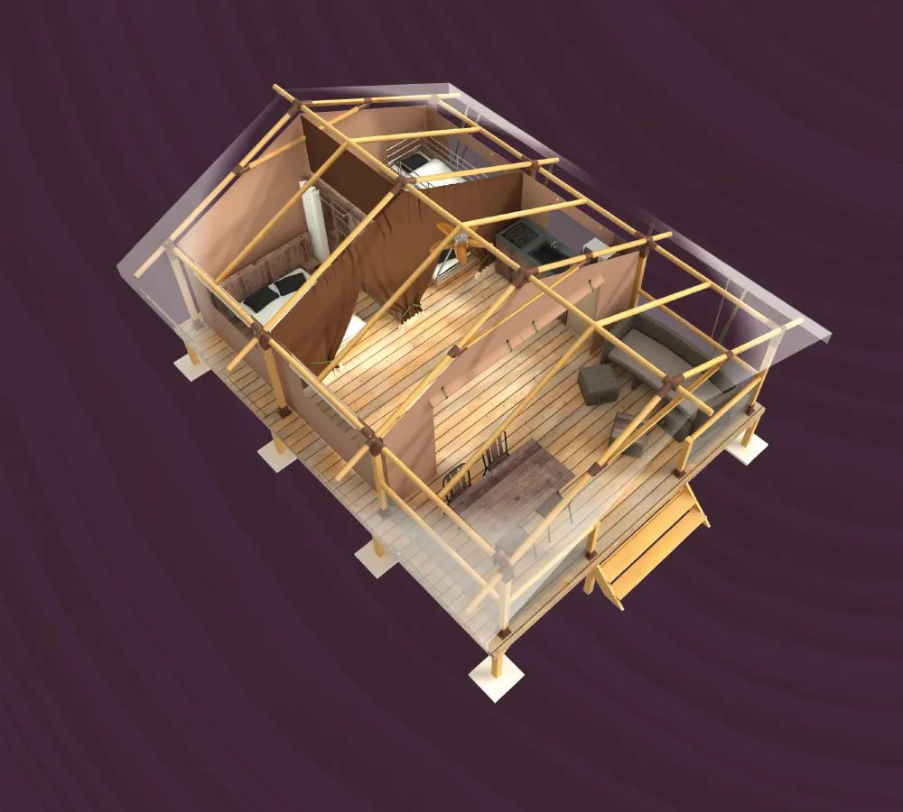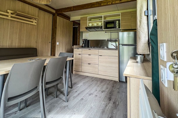 Nouveauté 2022 ! Découvrez en famille les lodges Kenya, construits en bois avec du mobilier vintage. Hébergement sans salle de bain ni wc (sanitaire du camping en accès libre juste en face)