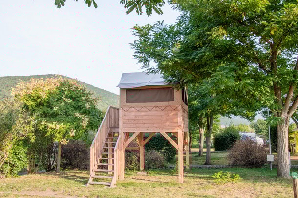 Es ist die ideale Unterkunft für einen Zwischenstopp während Ihrer Fahrradtour! Dieses ungewöhnliche Zelt aus Stoff und Holz auf Stelzen umfasst im Obergeschoss einen 7 m² großen Schlafbereich (über eine Treppe erreichbar) mit einem Doppelbett (140x190) mit Decken und Kopfkissen und einem Stromanschluss. Dieses Zelt verfügt über keine Sanitäranlagen (Gemeinschaftssanitäranlagen des Campingplatzes).