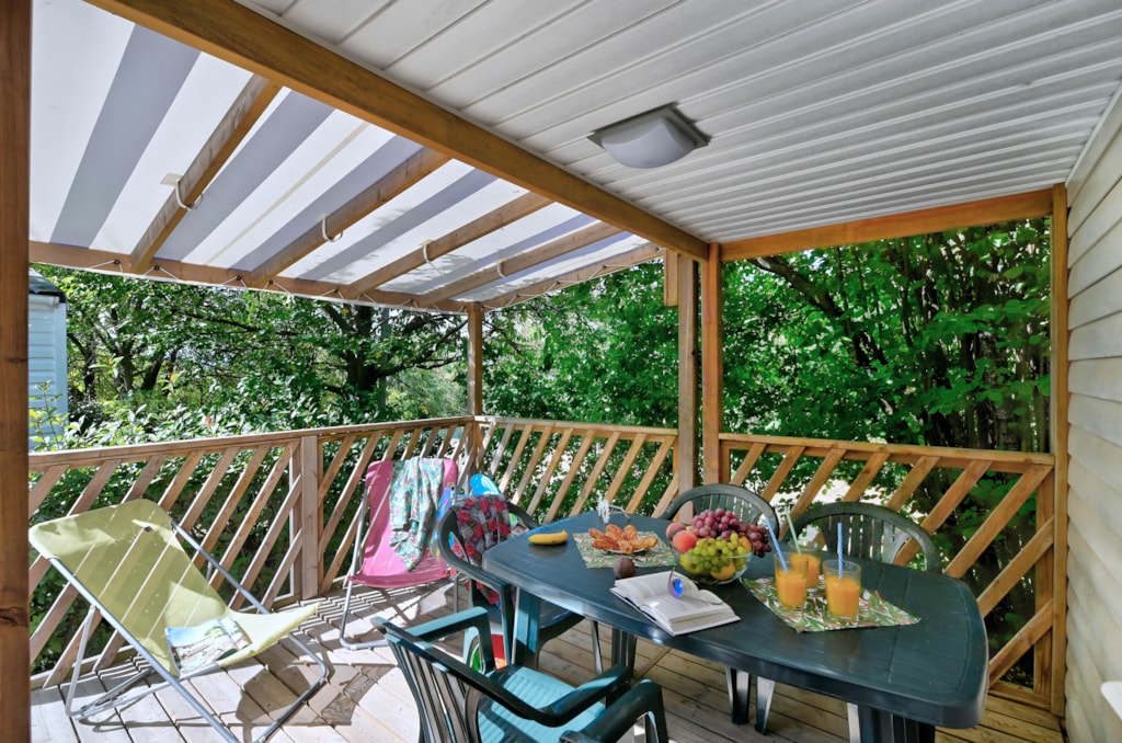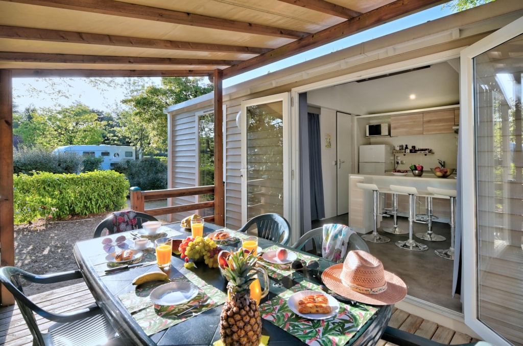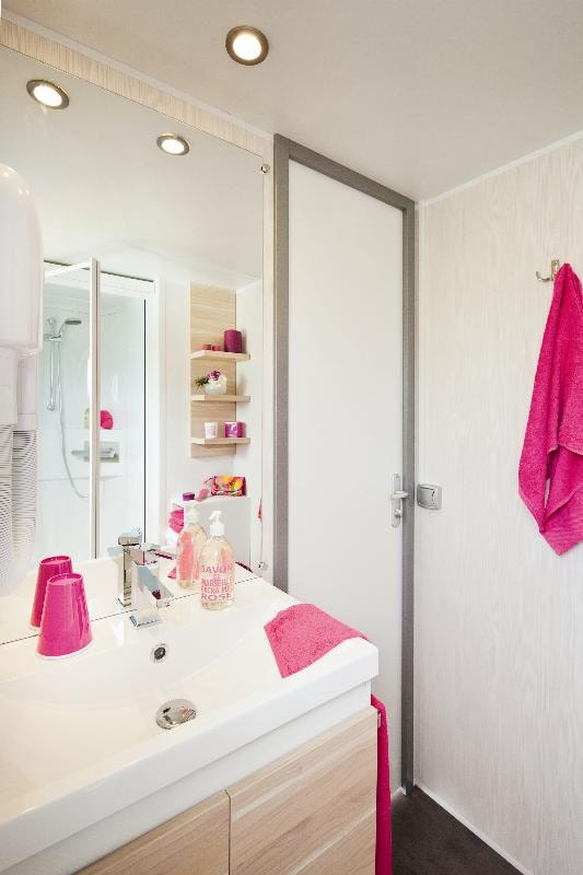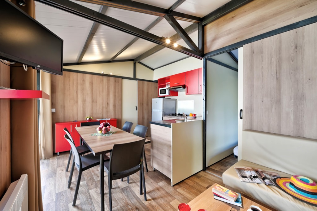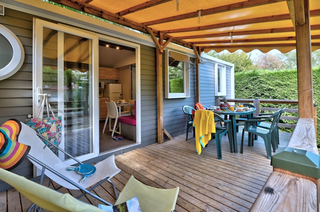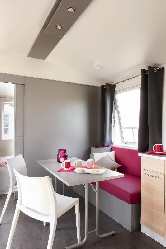 Auf einer Fläche von 29m ² mit 2 Schlafzimmer getrennten um einen zentralen Wohnzimmer anstelle eines Cocooning und Lounge-Bereich, die einen dritten Schlafzimmer bilden können, können unsere Mobile Homes Platz für 4-6 Personen in Komfort und sind mit einer Klimaanlage ausgestattet. Sie werden sich wie zu Hause mit Fuer Herd mit Dunstabzugshaube, Kühlschrank mit Gefrierschrank, Mikrowelle, Tisch und Stühlen für Mahlzeiten innerhalb oder außerhalb Bad, separates WC, überdachte Terrasse, Garten fühlen. .. Alles ist da!
