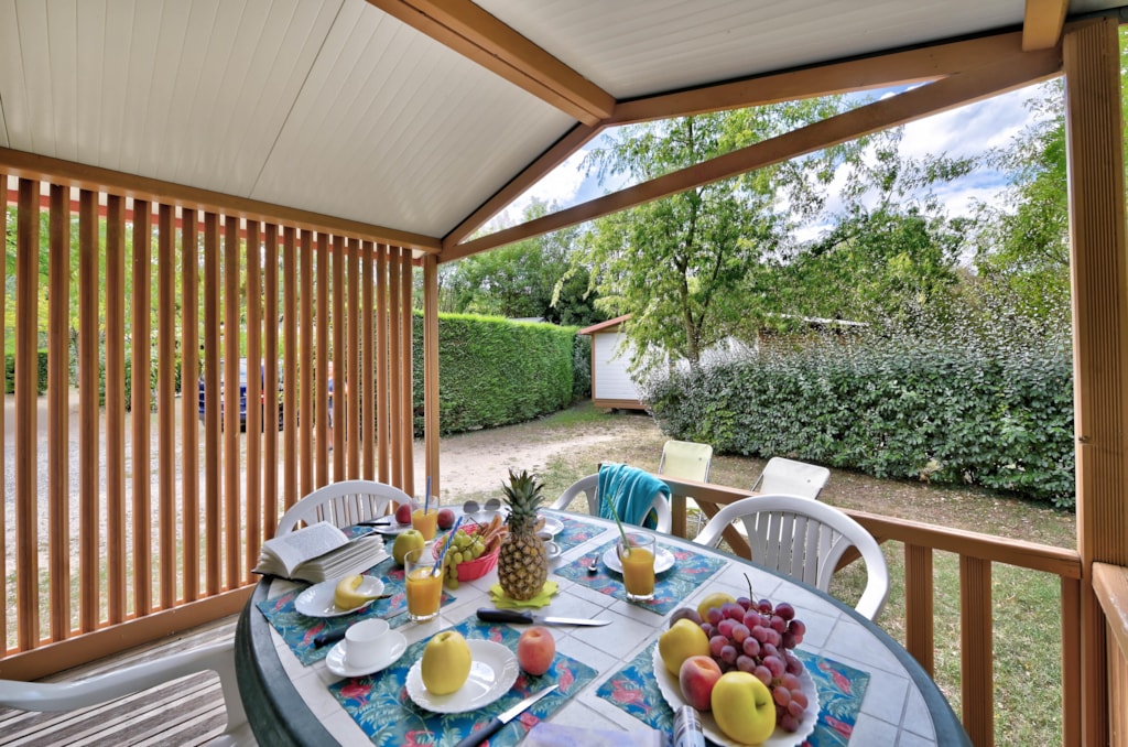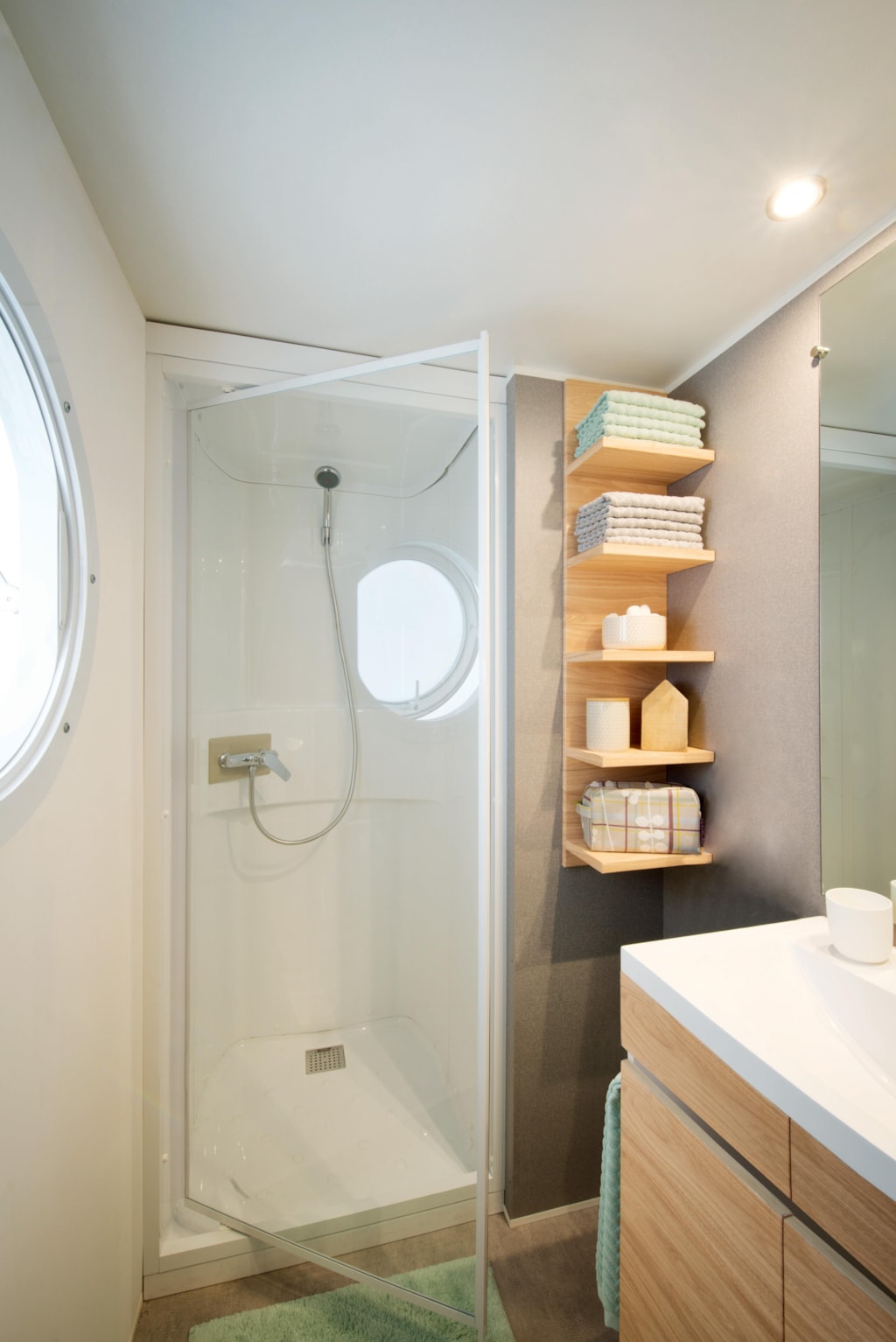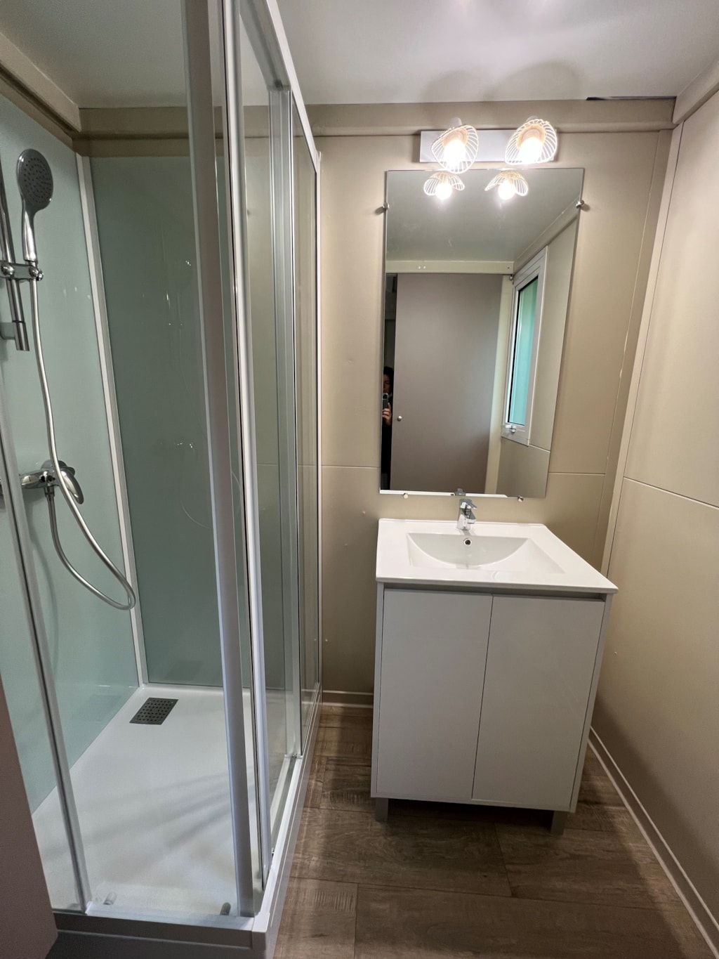 Auf einer Fläche von 29m ² mit 2 Schlafzimmer getrennten um einen zentralen Wohnzimmer anstelle eines Cocooning und Lounge-Bereich, die einen dritten Schlafzimmer bilden können, können unsere Mobile Homes Platz für 4-6 Personen in Komfort und sind mit einer Klimaanlage ausgestattet. Sie werden sich wie zu Hause mit Fuer Herd mit Dunstabzugshaube, Kühlschrank mit Gefrierschrank, Mikrowelle, Tisch und Stühlen für Mahlzeiten innerhalb oder außerhalb Bad, separates WC, überdachte Terrasse, Garten fühlen. .. Alles ist da!