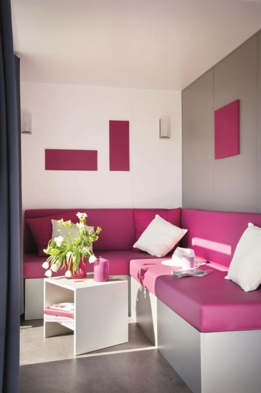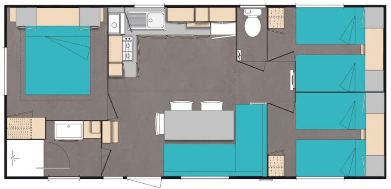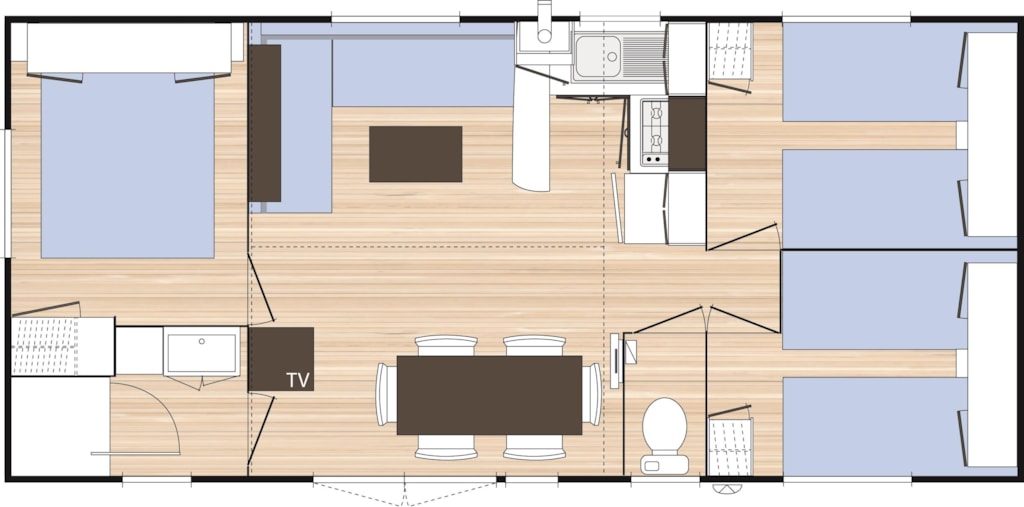 Das Mobilheim verfügt über 3 Schlafzimmer, ideal für Urlaub mit große Familie oder Kurzurlaub mit Freunden. Der Hauptraum ist mit einer Klimaanlage ausgestattet