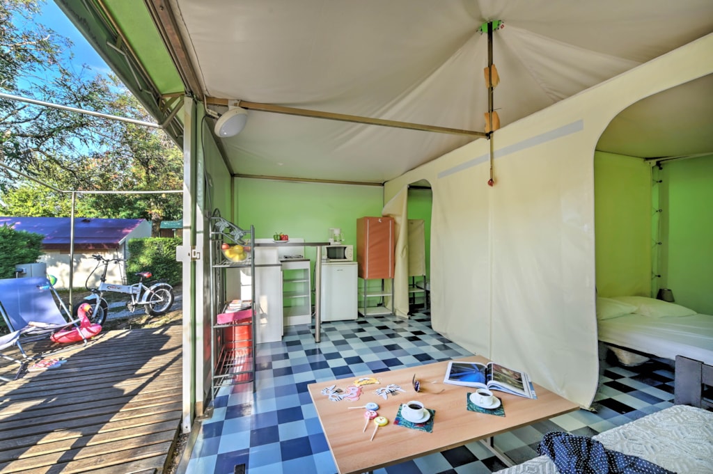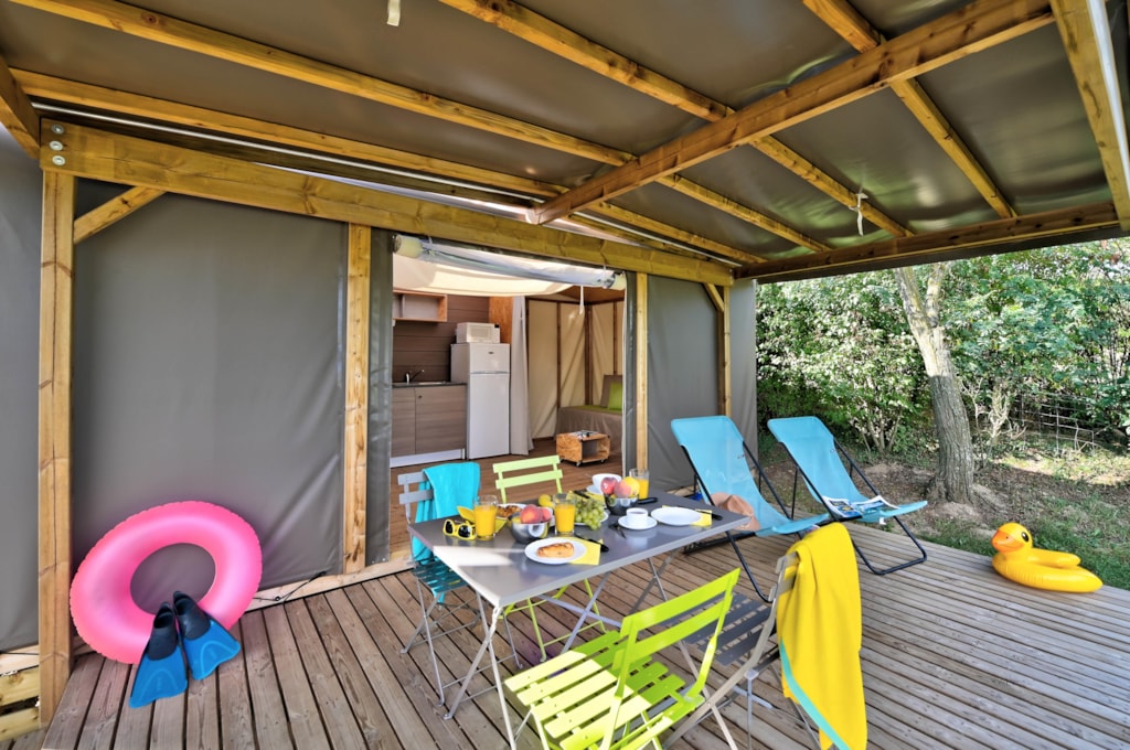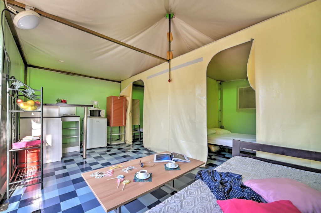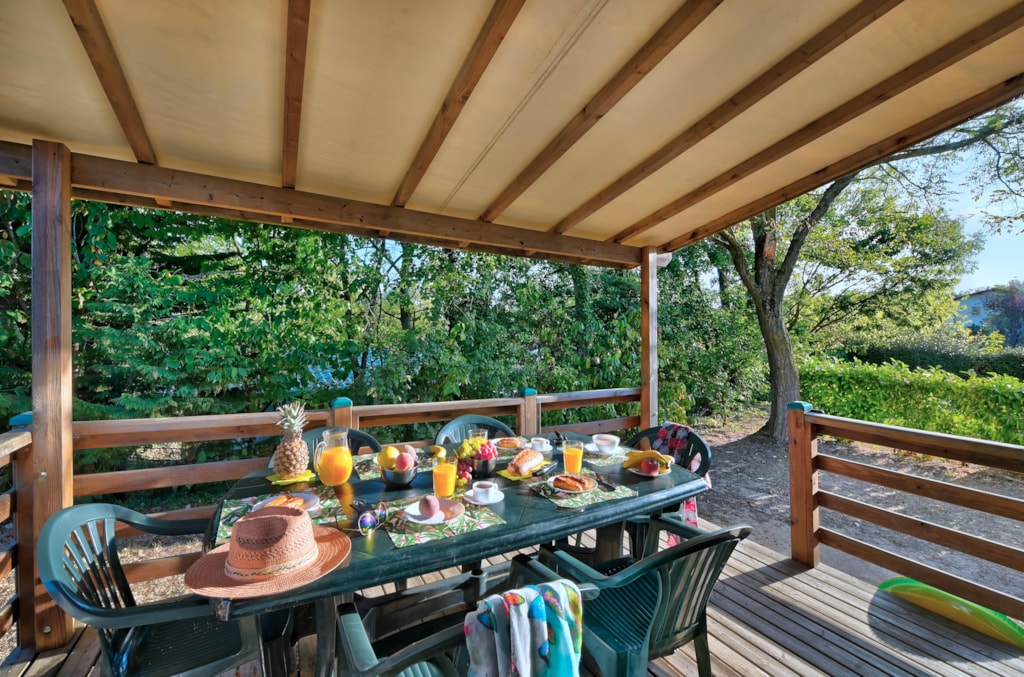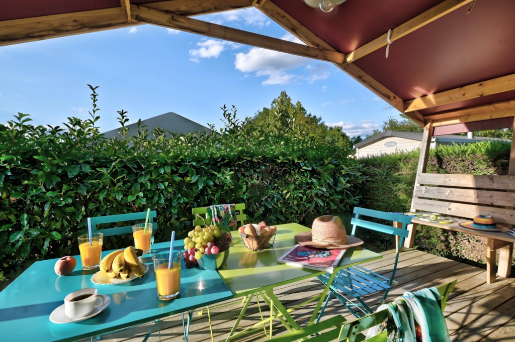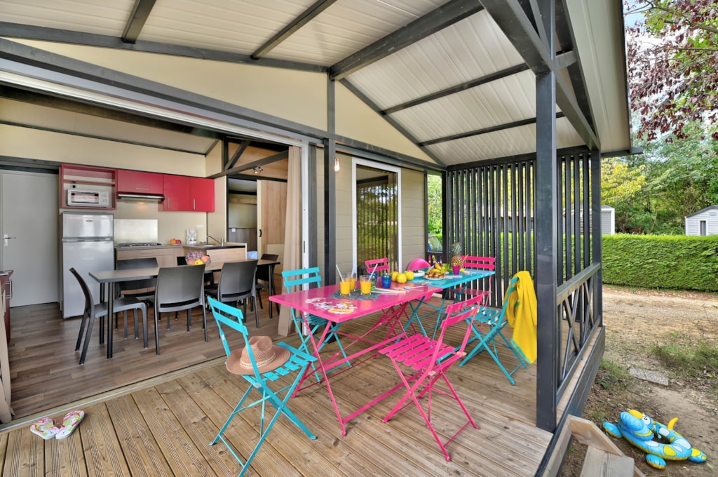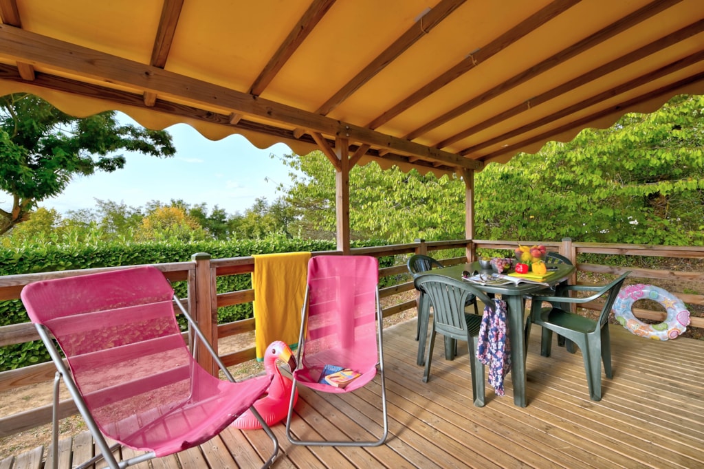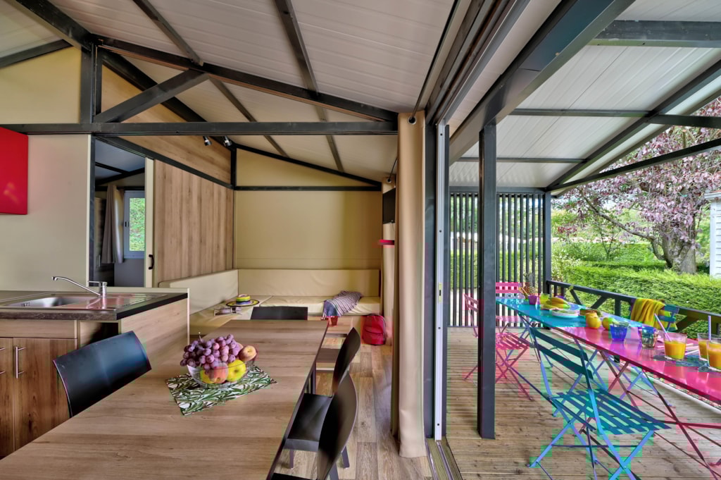 Dieses Tribe-Angebot bietet Platz für maximal 12 Personen. Ideal für z. B. eine große Patchwork-Familie oder zwei befreundete Familien. Es besteht aus zwei gegenüberliegenden Mobilheimen, die durch eine große, überdachte Terrasse von ca. 50 m² verbunden sind. Sie haben ein Komfort-Mobilheim für 6 Personen mit 3 Schlafzimmern, 1 Badezimmer, separatem WC und ausgestatteter Küche sowie ein Komfort-Mobilheim für 4/6 Personen mit 2 Schlafzimmern und der Möglichkeit, den Vorhang im Wohnzimmer zu schließen, um ein drittes Schlafzimmer, 1 Badezimmer, separates WC und ausgestattete Küche zu schaffen. Die Terrasse ist mit Gartenmöbeln für 12 Personen sowie Liegestühlen ausgestattet.