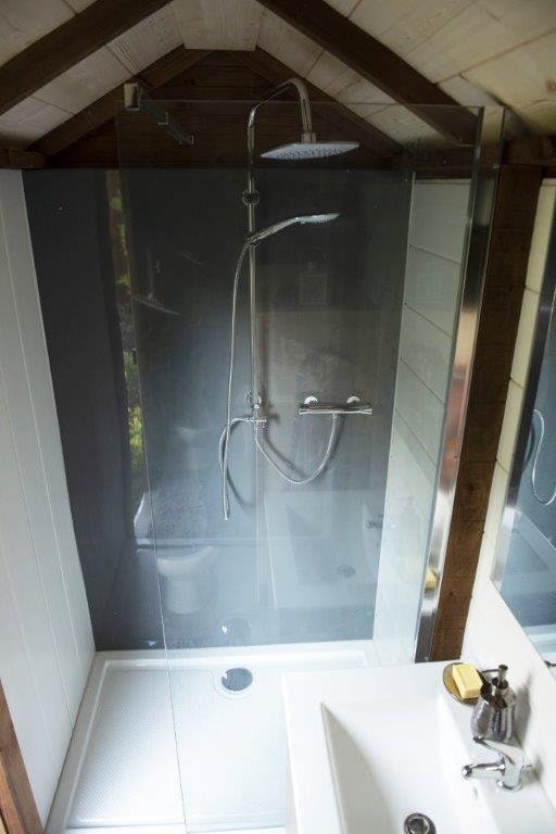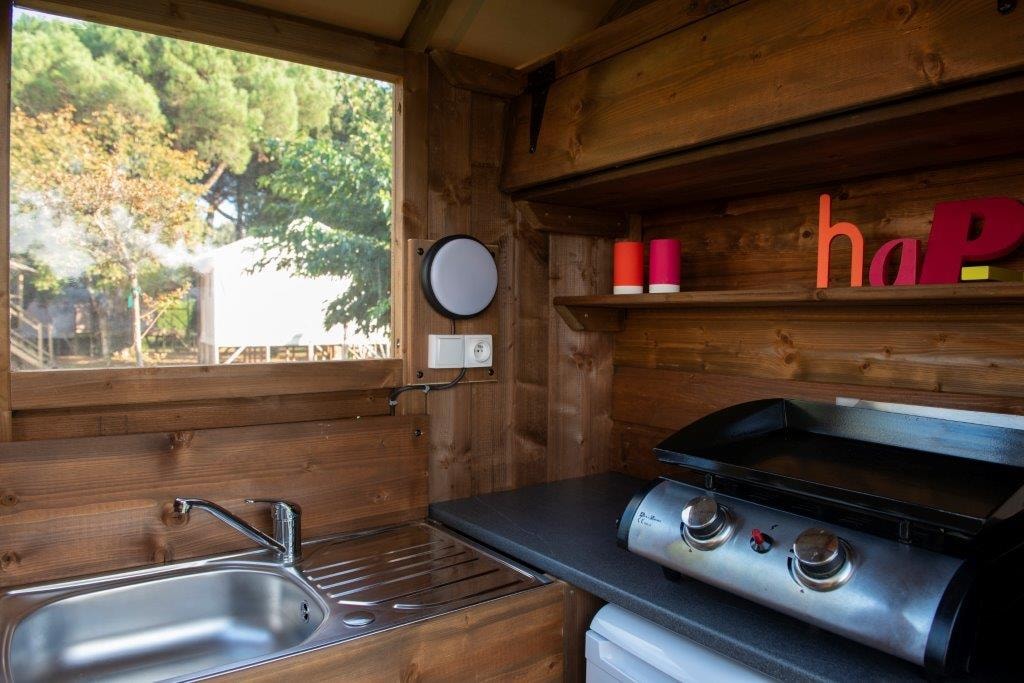 Holzhütte mit Bad (Dusche, WC, Waschbecken), Küche (Mikrowelle, Gasherd, Kühlschrank, Spüle), privater Raum auf Ihrem Stellplatz. Auch diese Hütten sind mit einem Geschirrset sowie einem Tisch mit Bank für 6 Personen ausgestattet