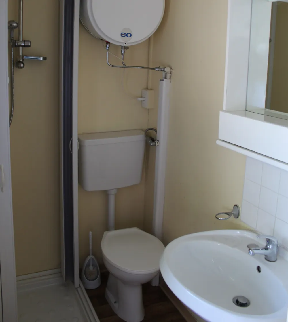 Schlafzimmer mit Doppelbett, Schlafzimmer mit 1/bzw. 2 Einzelbetten, Wohnbereich mit Kochnische, TV, Klimaanlage, Bad mit Dusche, überdachte Holzveranda und möbilierte Terrasse. Bettwäsche auf Anfrage gegen Gebühr, Handtücher für Badezimmer stehen nicht zur Verfügung. Der Strandservice ( 1 Sonnenschirm +2 Sonnenliegen) ist vom 22.06. - 07.09. für die Mobilheime inklusive. Ebenso wie die Animation (ab 01.07. - 31.08.)