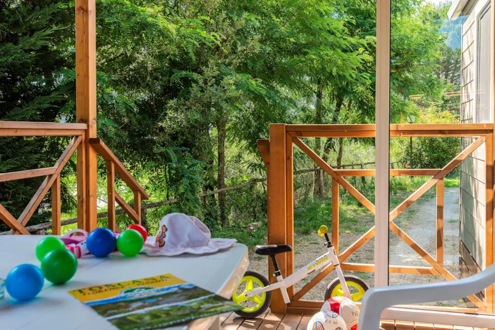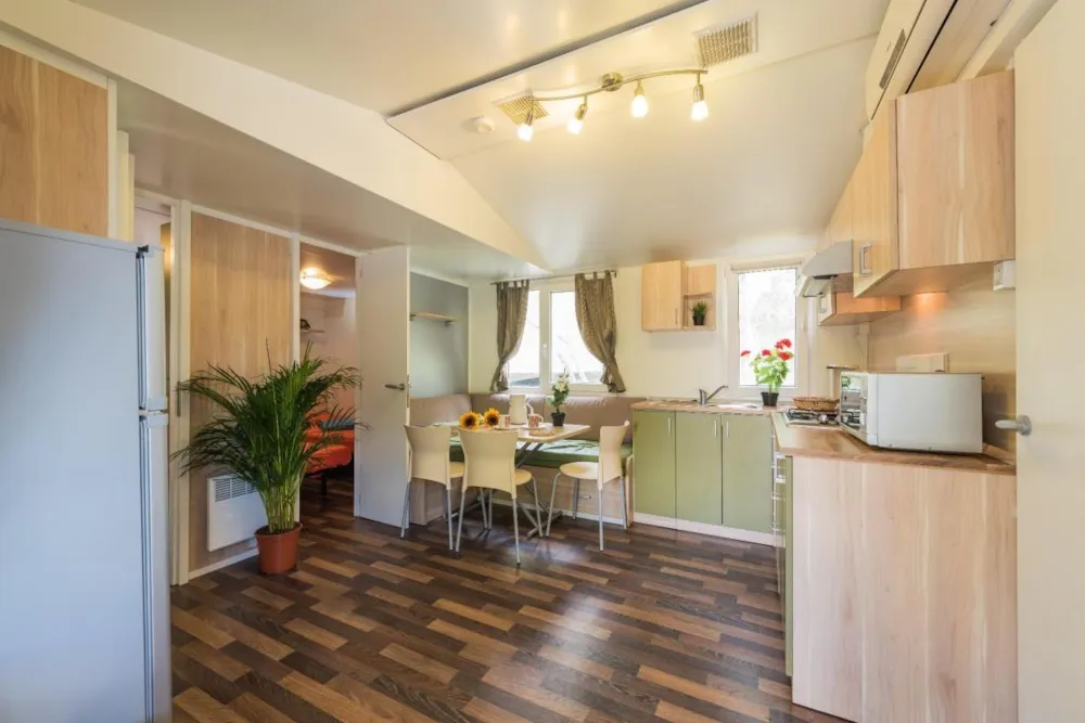 Mobilheim besteht aus 1 Doppelzimmer, 1 Zweibettzimmer, Wohnzimmer mit Kochnische, Bad mit Dusche und Veranda mit Tisch und Stühlen