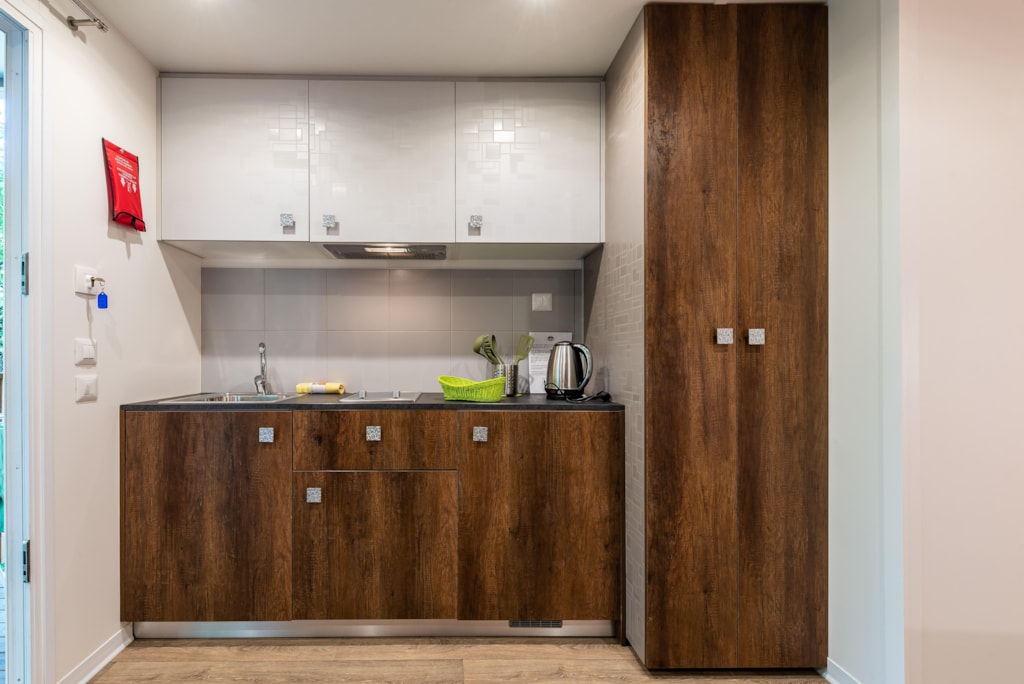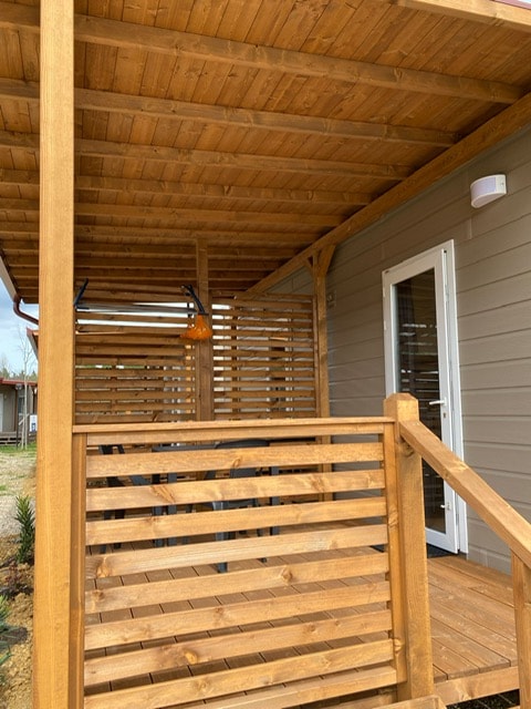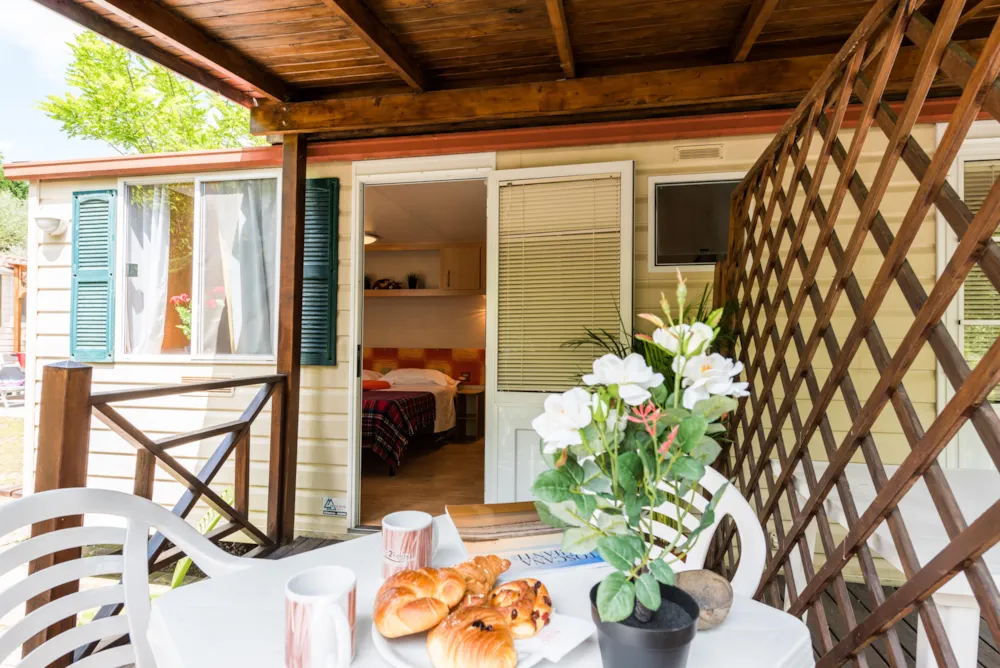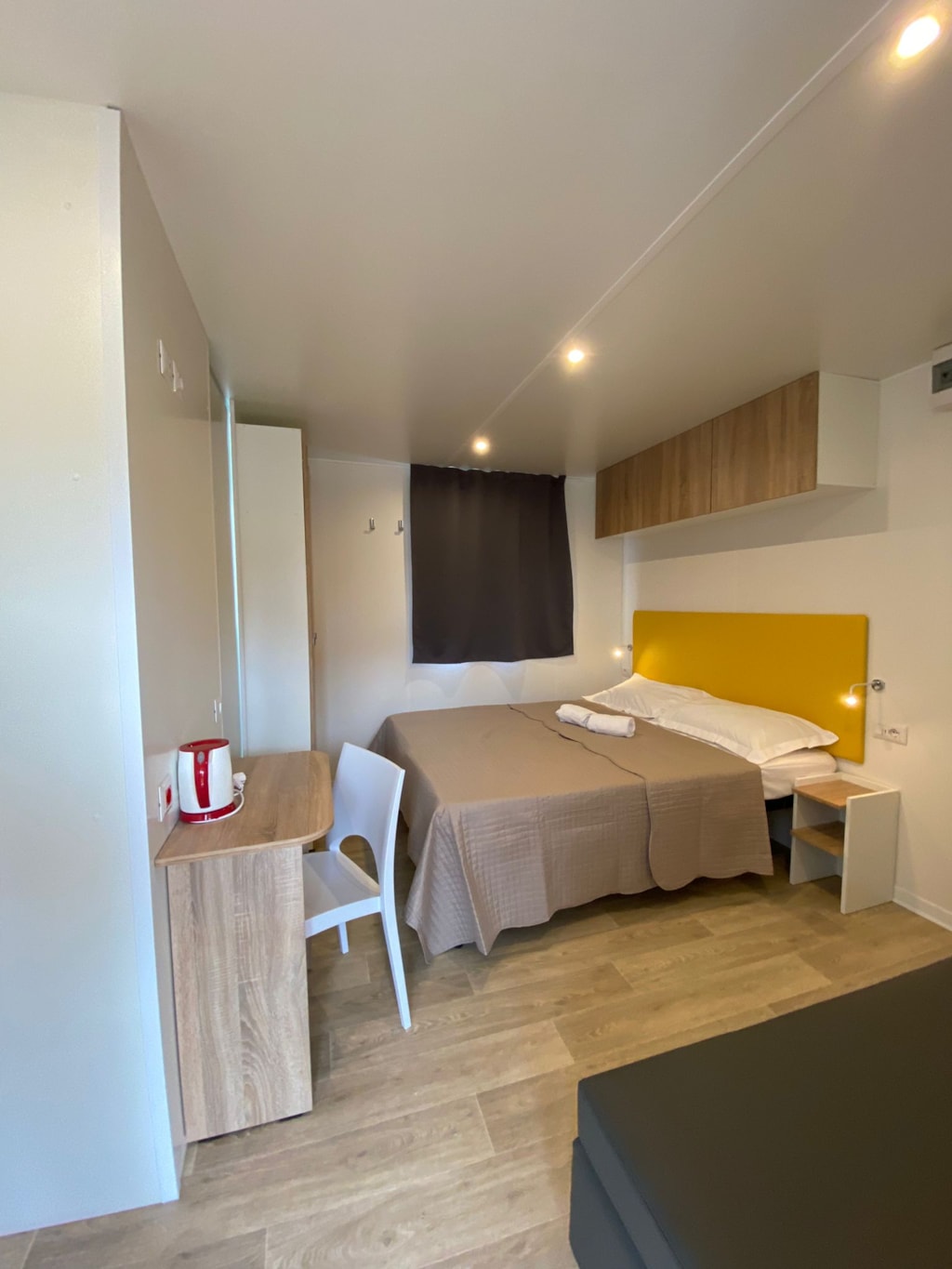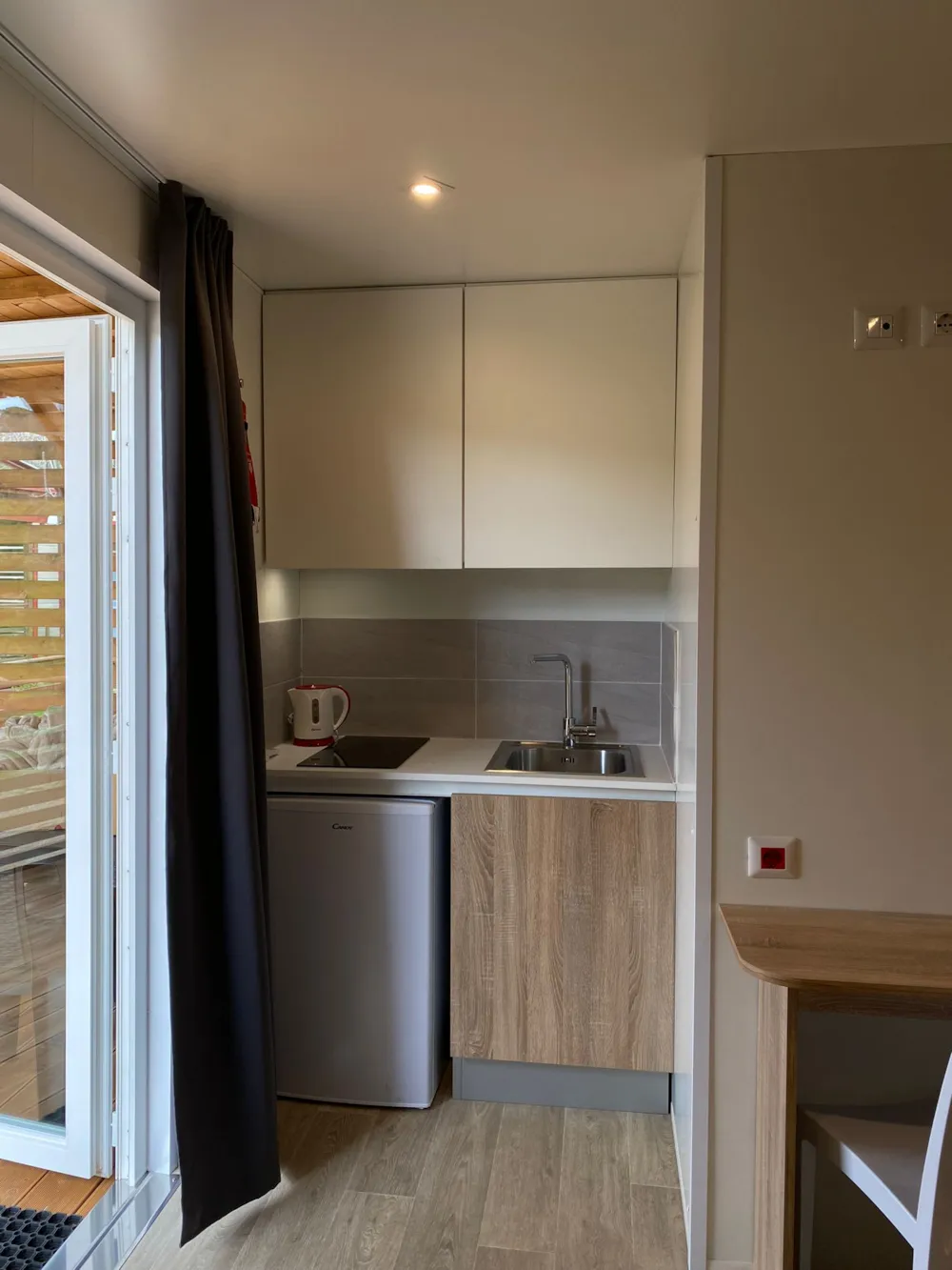 Mobile Home Studio bestehend aus 1 Doppelzimmer mit Küchenzeile, Bad mit Dusche und Veranda mit Tisch und Stühlen