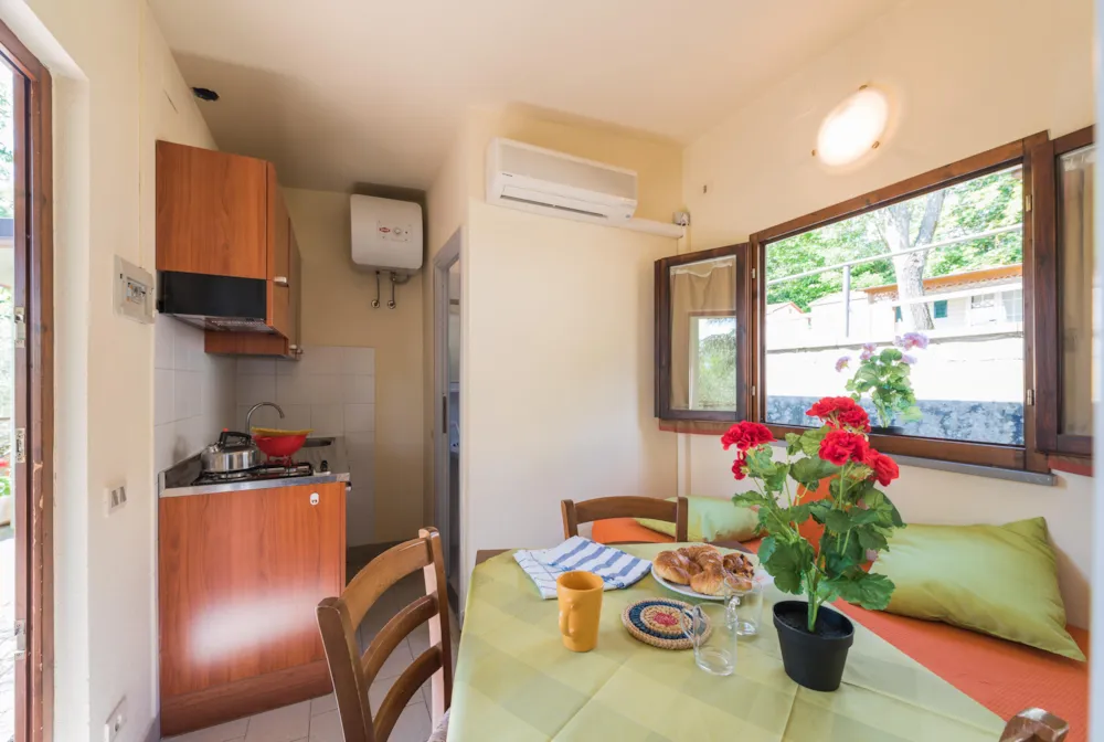 Gemauerte Bungalow bestehend aus 1 Schlafzimmer mit Doppelbett, Wohnzimmer mit Kochnische, Bad mit Dusche, Veranda mit Tisch und Stühlen.