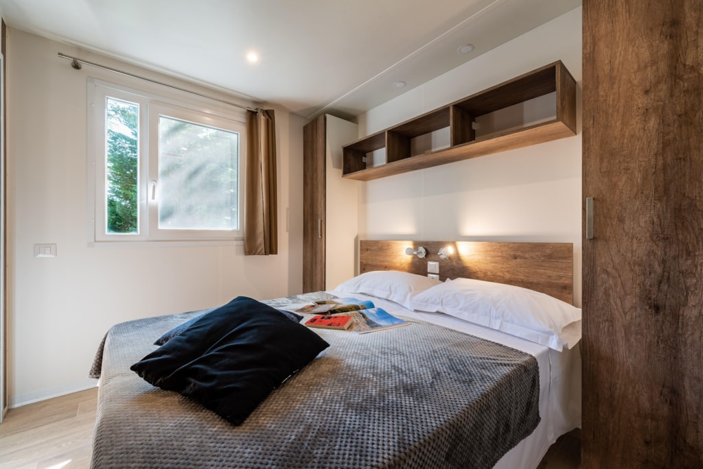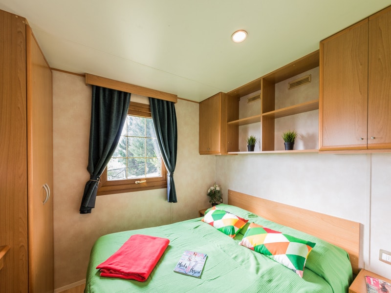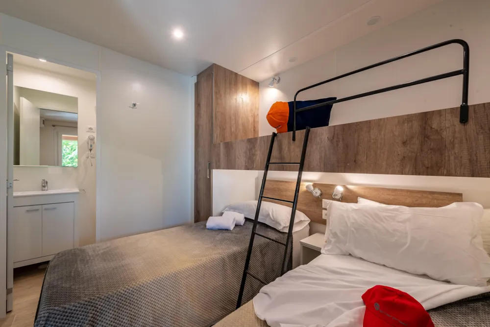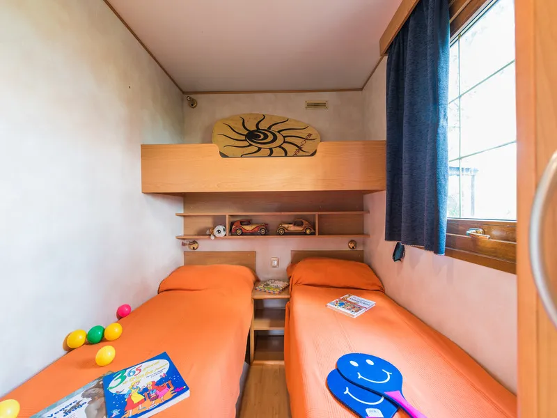 Mobilheim besteht aus 1 Doppelzimmer, 2 Schlafzimmer mit Einzelbetten, Wohnzimmer mit Kochnische, zwei Bäder, Veranda mit Tisch und Stühlen.
