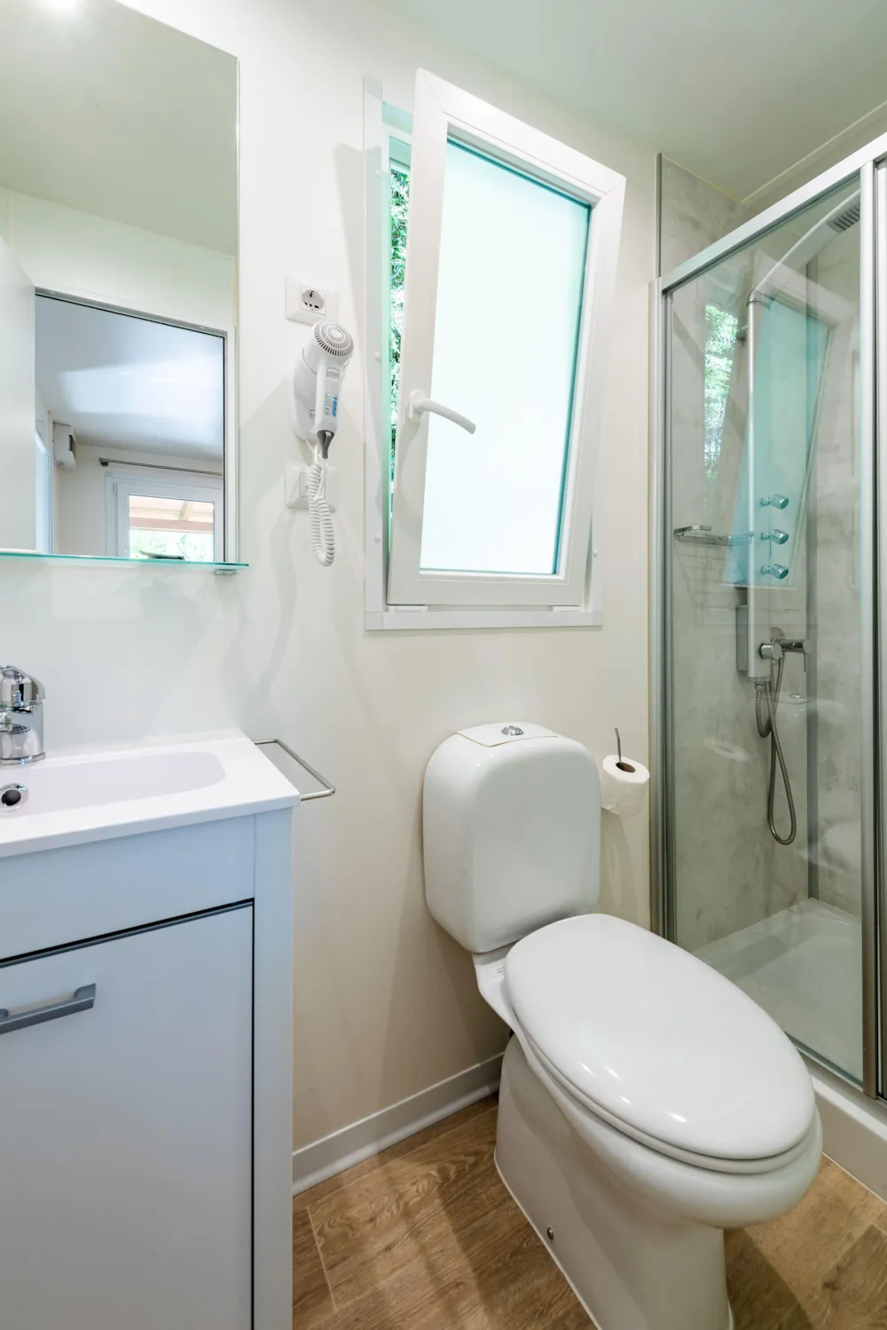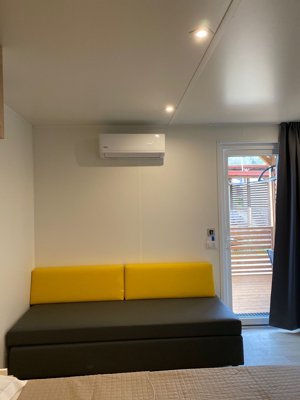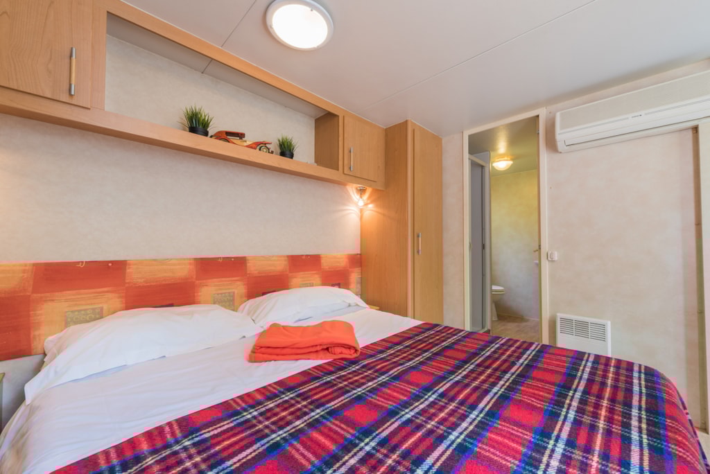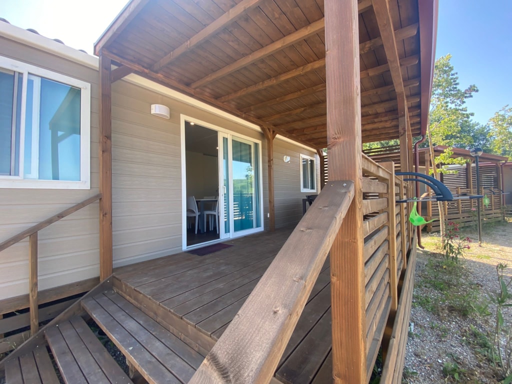 Mobile Home besteht aus 2 Zimmern mit 2 Bädern und Dusche, ein Doppelzimmer und eines mit Einzelbetten, Wohnzimmer mit Kochnische und Veranda mit Tisch und Stühlen.
